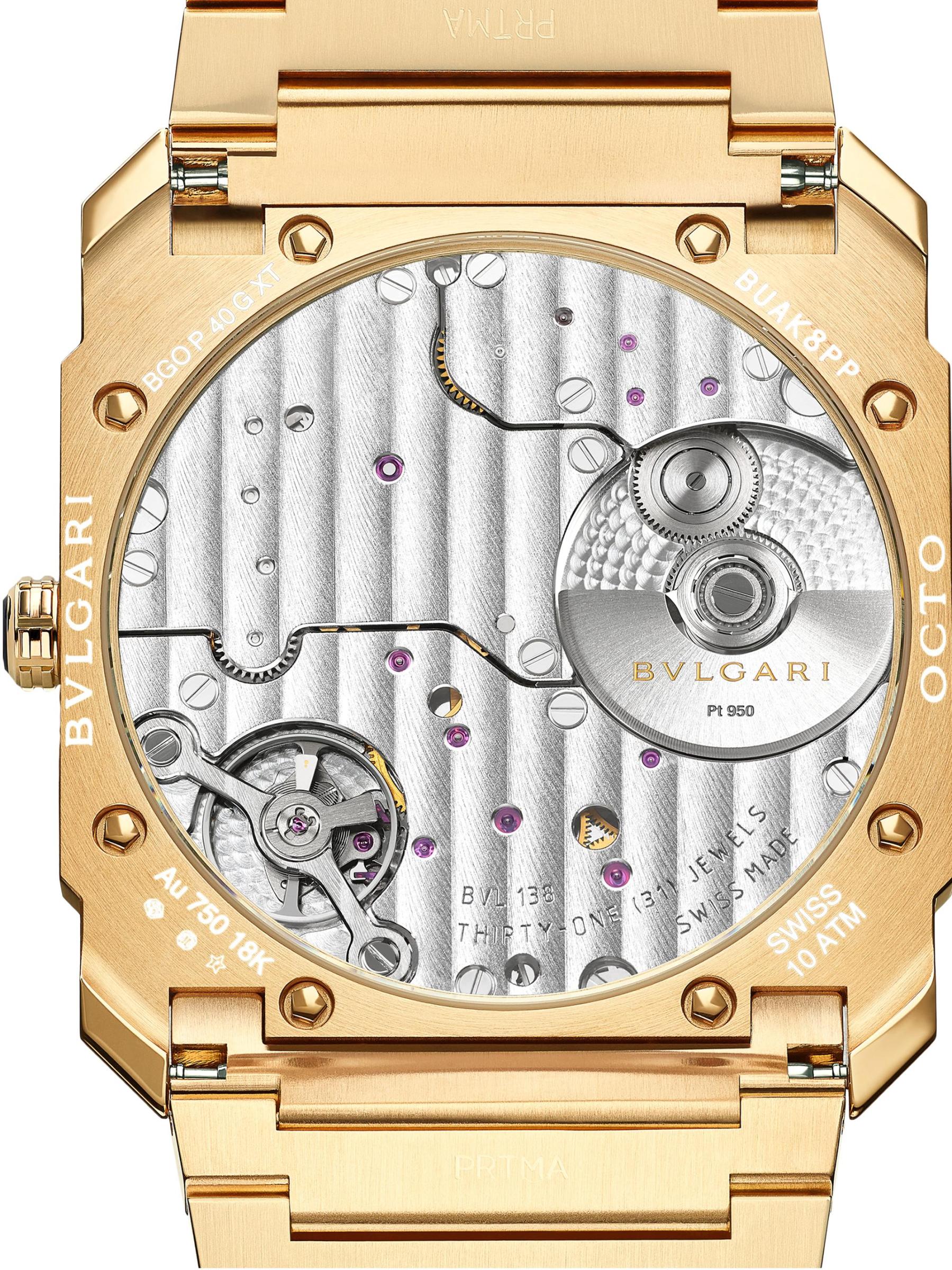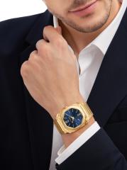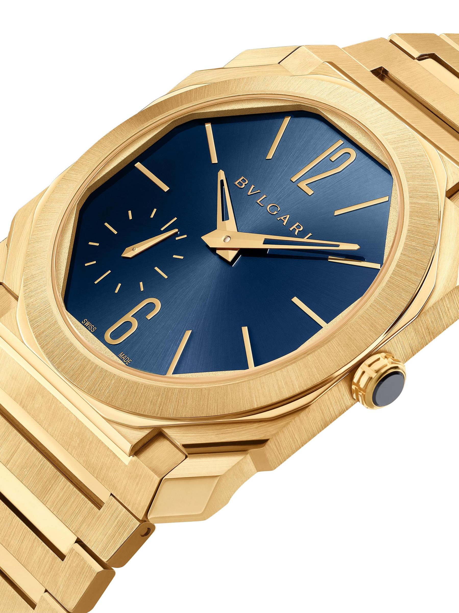 From the Octo Collection. Crafted of 18K yellow gold, BVLGARI's Octo Finissimo watch flaunts an ultra-thin octagonal case, blue sunray dial, and seconds subdial at seven o'clock.Presented in BVLGARI's signature packaging, inspired by the house's rich history and commitment to luxury Automatic movement Blue sunray dial Seconds subdial at seven o'clock Baton and Arabic numeral hour markers 18K-yellow-gold case and bracelet Deployant buckle Made in Switzerland