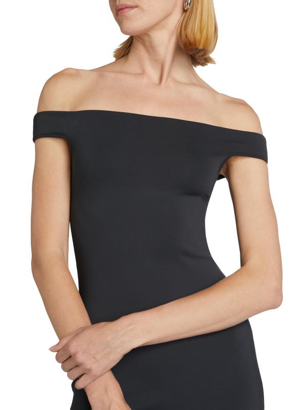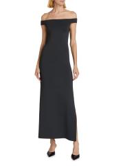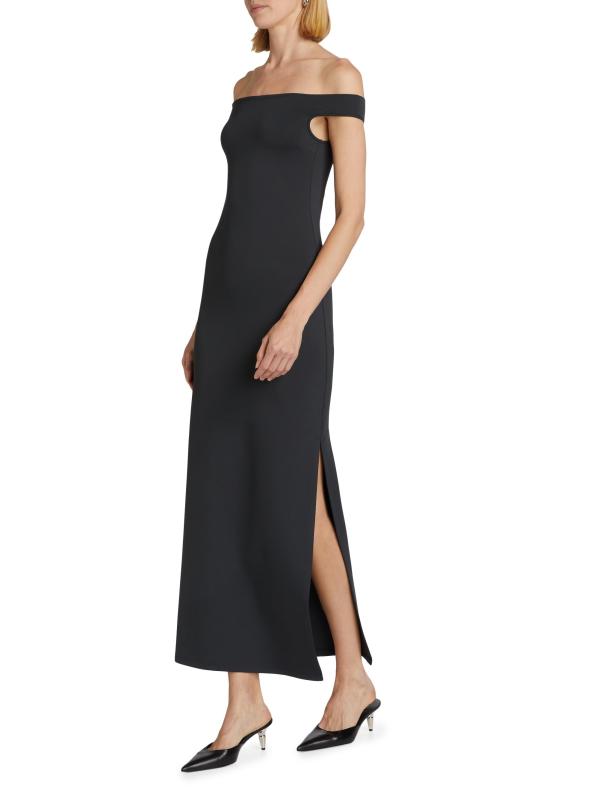 Zeynep Arçay’s sleek off-the-shoulder maxi dress is crafted of sculpting scuba fabric.