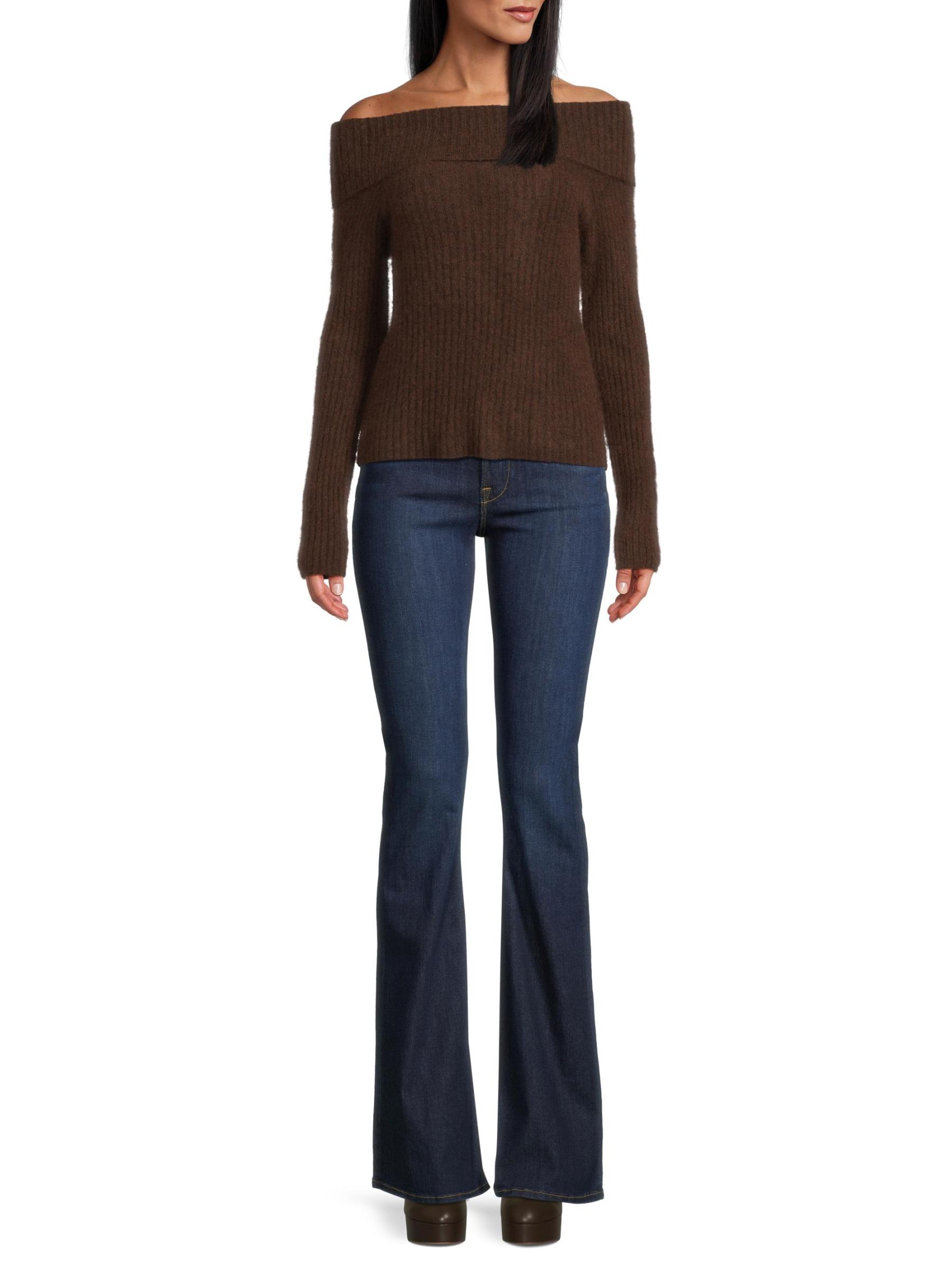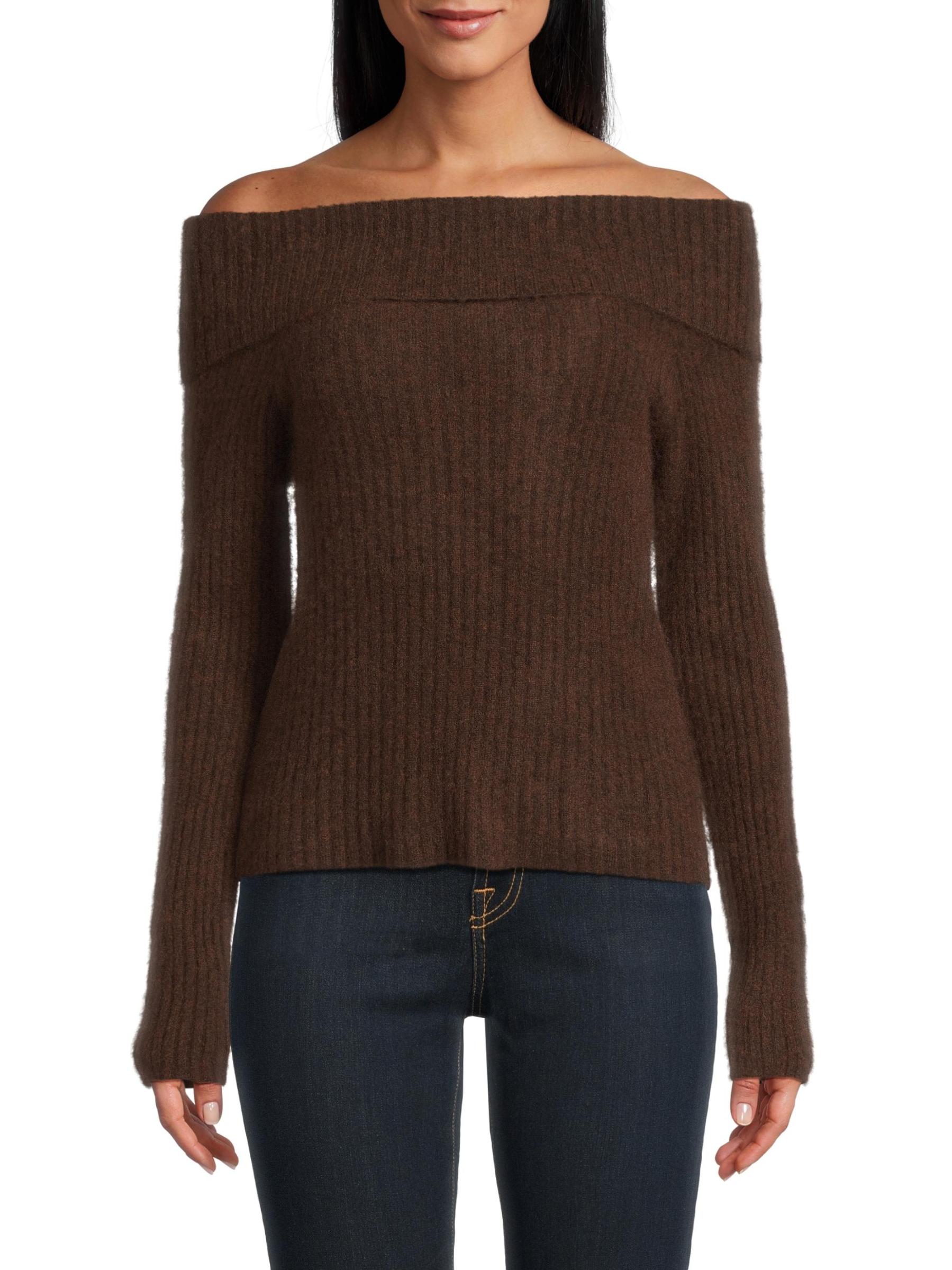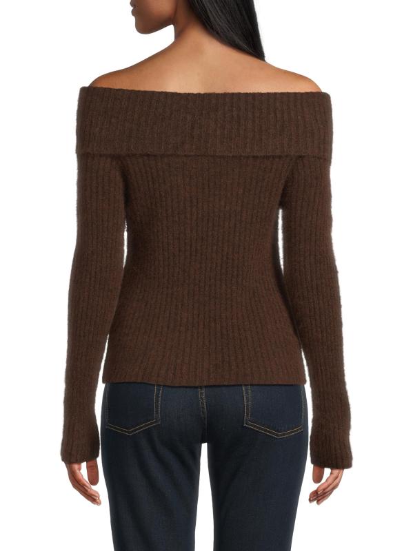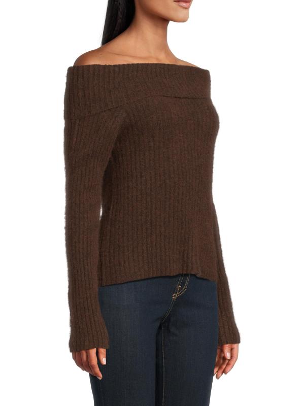 Finished in a cozy rib-knit, COLORUSH's fitted sweater features a sleek off-the-shoulder neckline and luxurious blend of cashmere and filament silk.