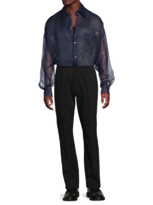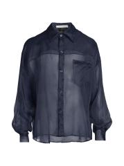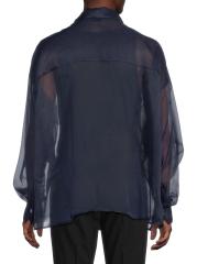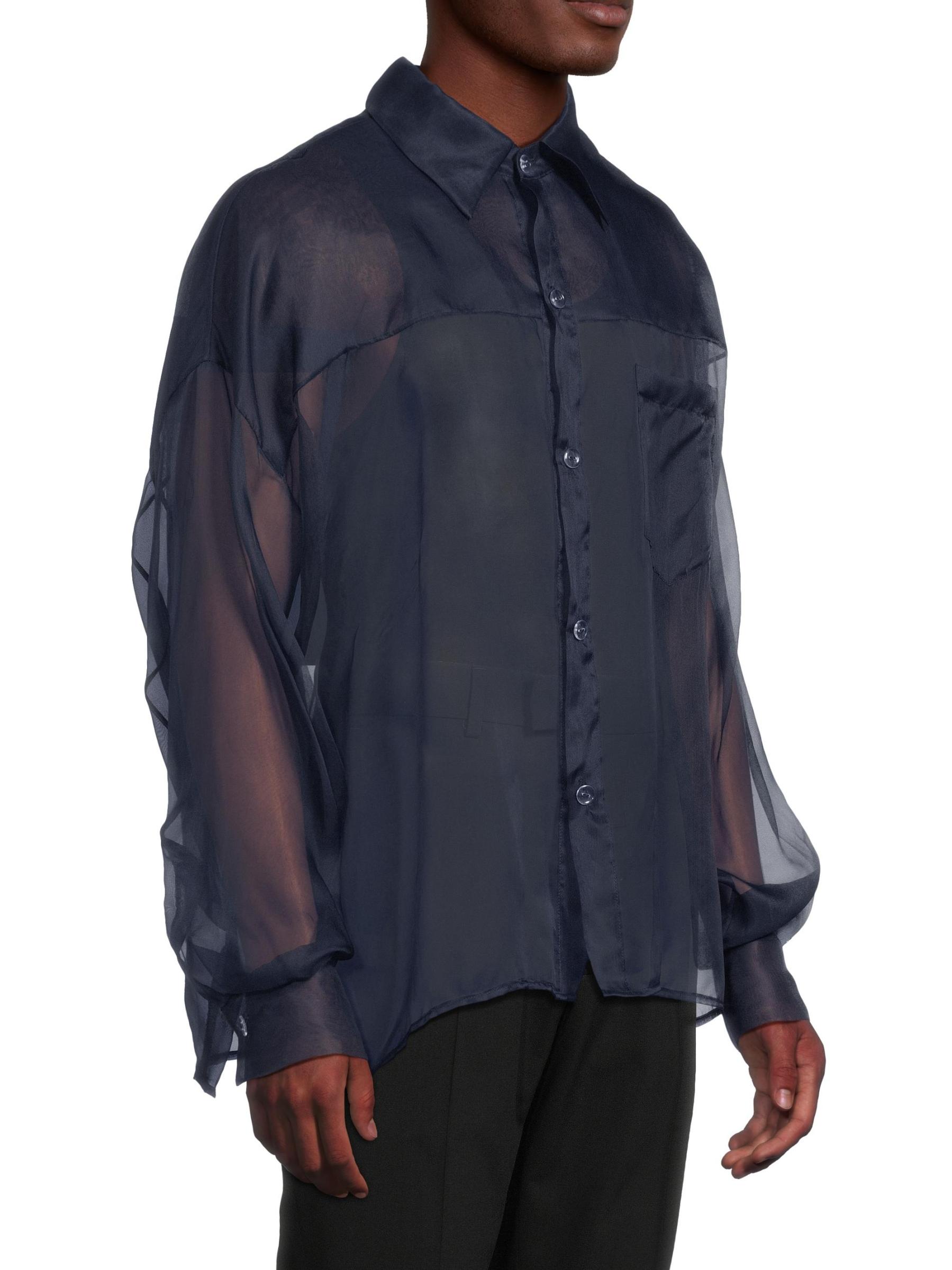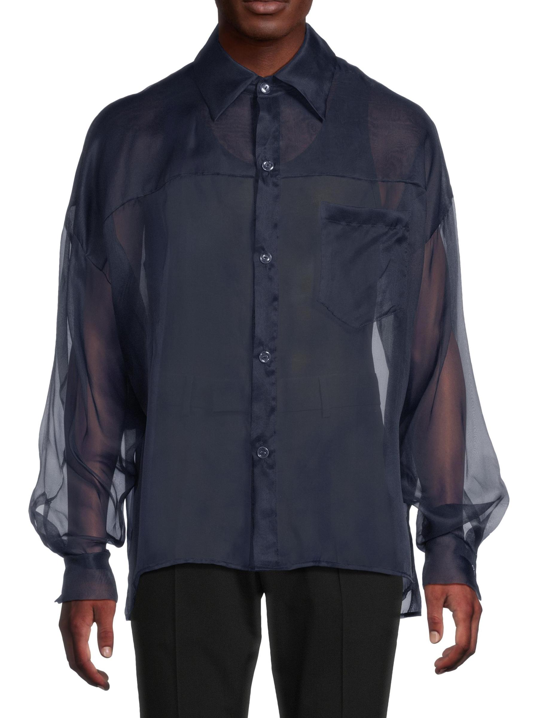 This oversized sheer shirt from LaQuan Smith is crafted of luxe silk and features drop shoulders and a chest patch pocket.Point collar Drop shoulders Long sleeves button cuffs Chest patch pocket Button front closure 100% Silk Dry clean Made in USA