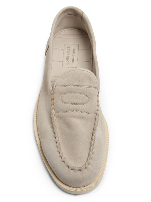 John Lobb's Pace suede loafers are styled with a slip-on silhouette featuring a flexible rubber sole to provide comfort and mobility.