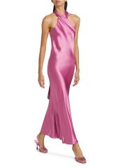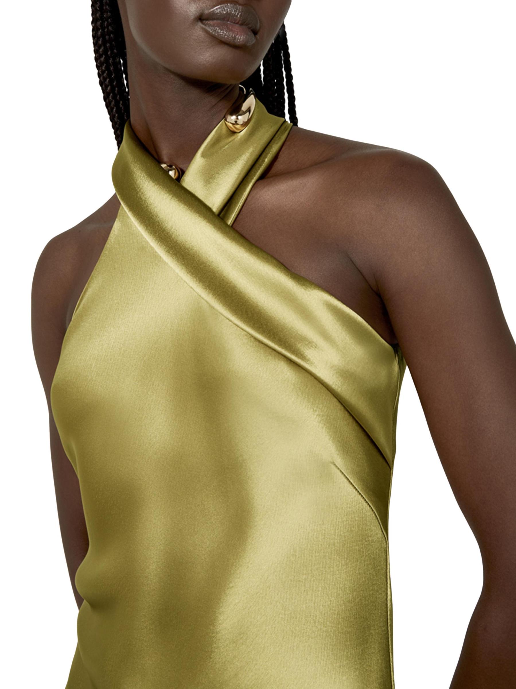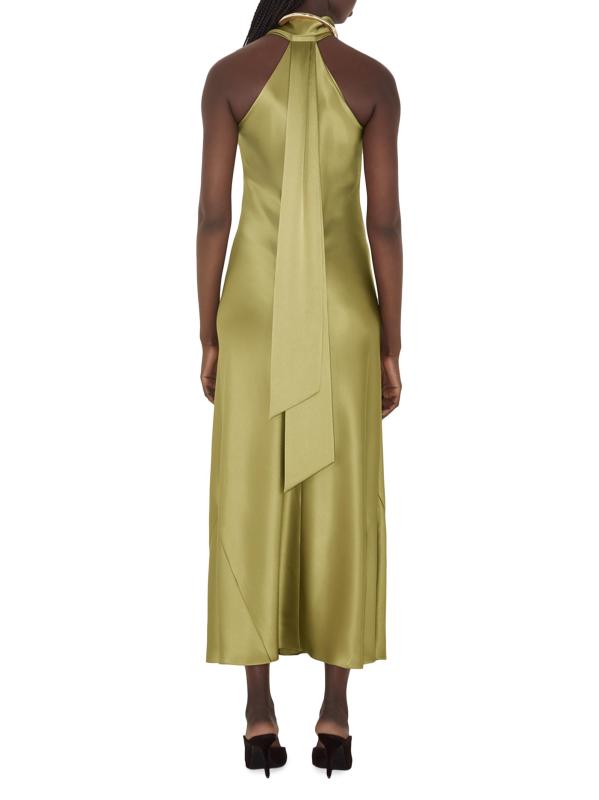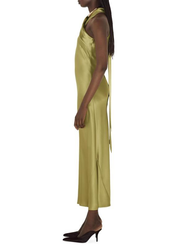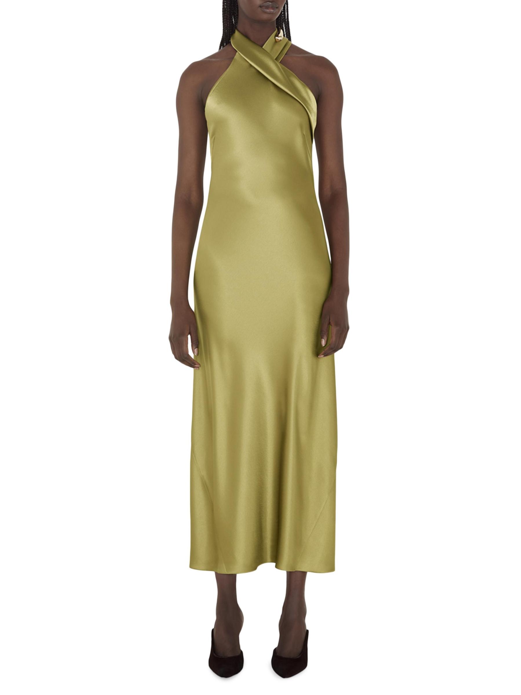 Crafted of satin, the Pandora halterneck midi-dress from Galvan is styled with a surplice neck, a racerback, and draped ties.Surplice neck Sleeveless Racerback Side zip closure 80% triacetate/20% polyester Dry clean Imported