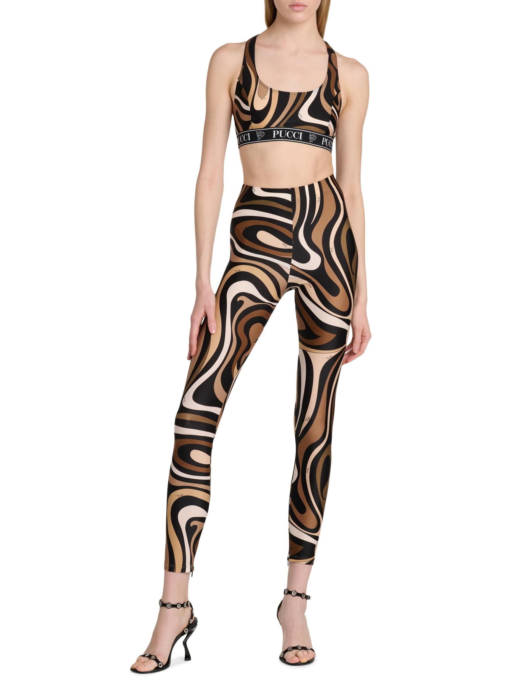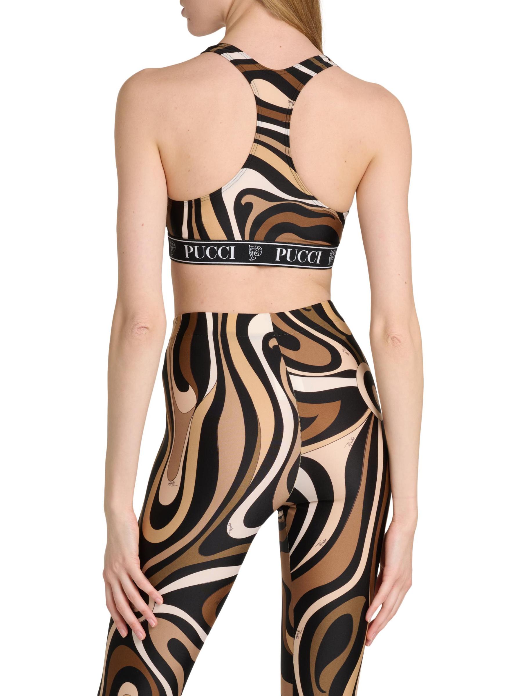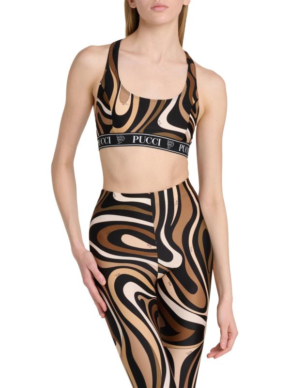 From the Passepartout Collection. Pucci is a legendary Italian fashion house known for its vibrant, kaleidoscopic prints and luxurious, jet-set lifestyle designs.This classic sports bra features a scoopneck, racerback silhouette, and logo-detailed stretch underband.