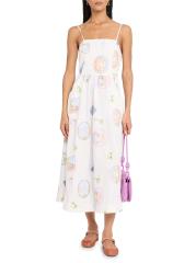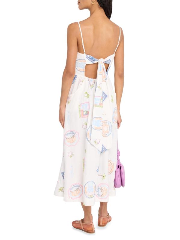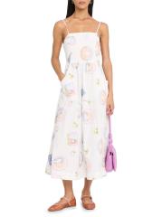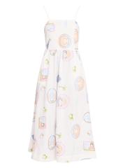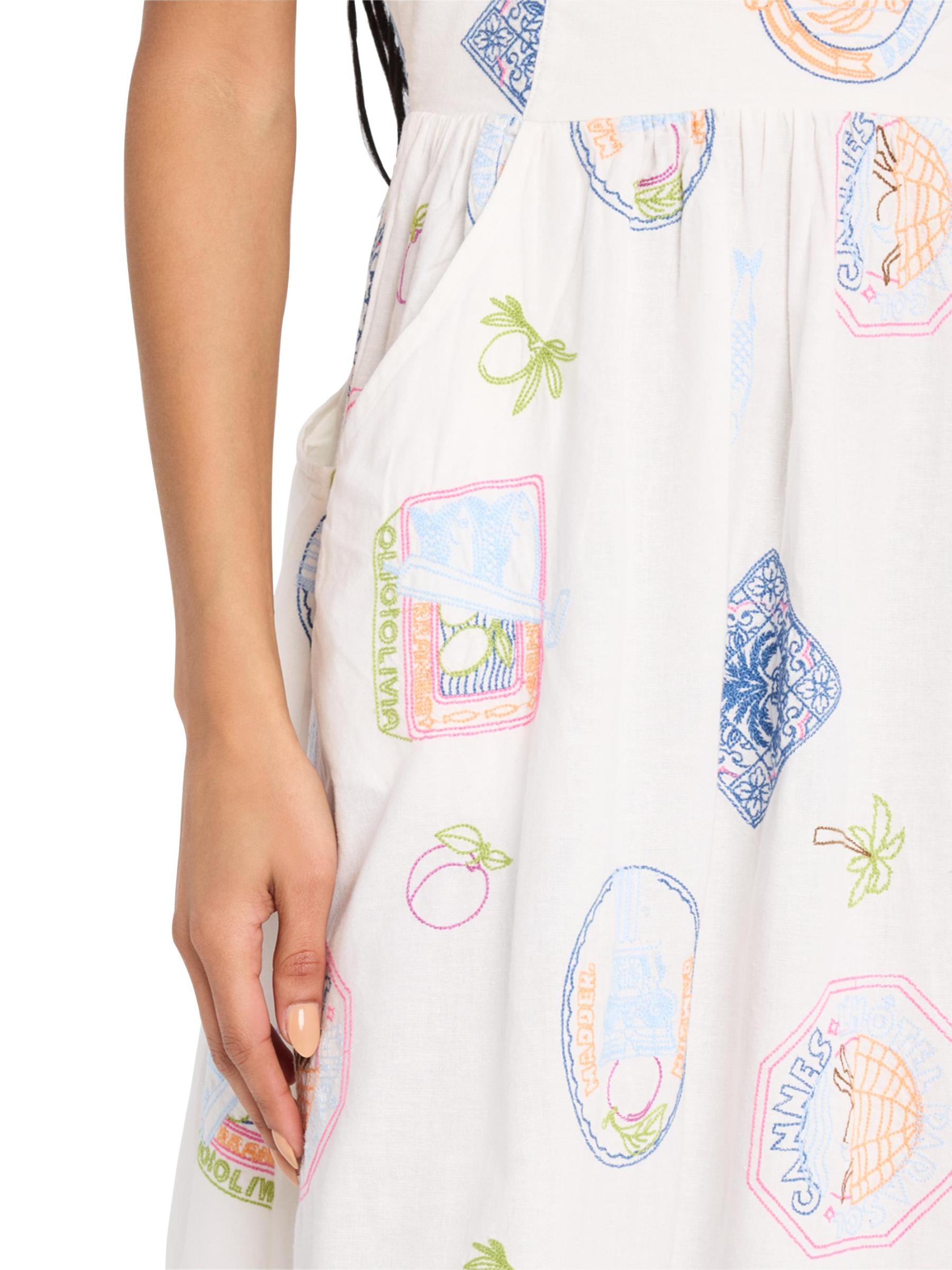 The Peaches apron dress from Damson Madder showcases an embroidered travel motif covering the relaxed, tie-back silhouette.Square neck Adjustable straps Side pockets Ruffled hem Back tie closure 100% Cotton Machine wash Imported