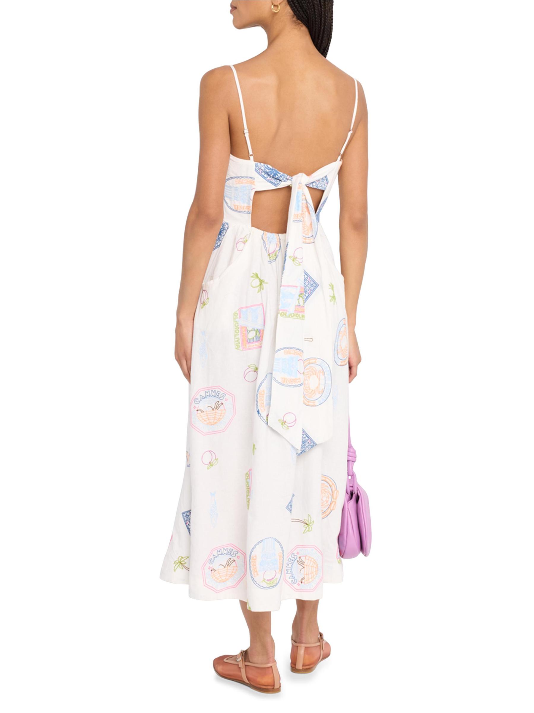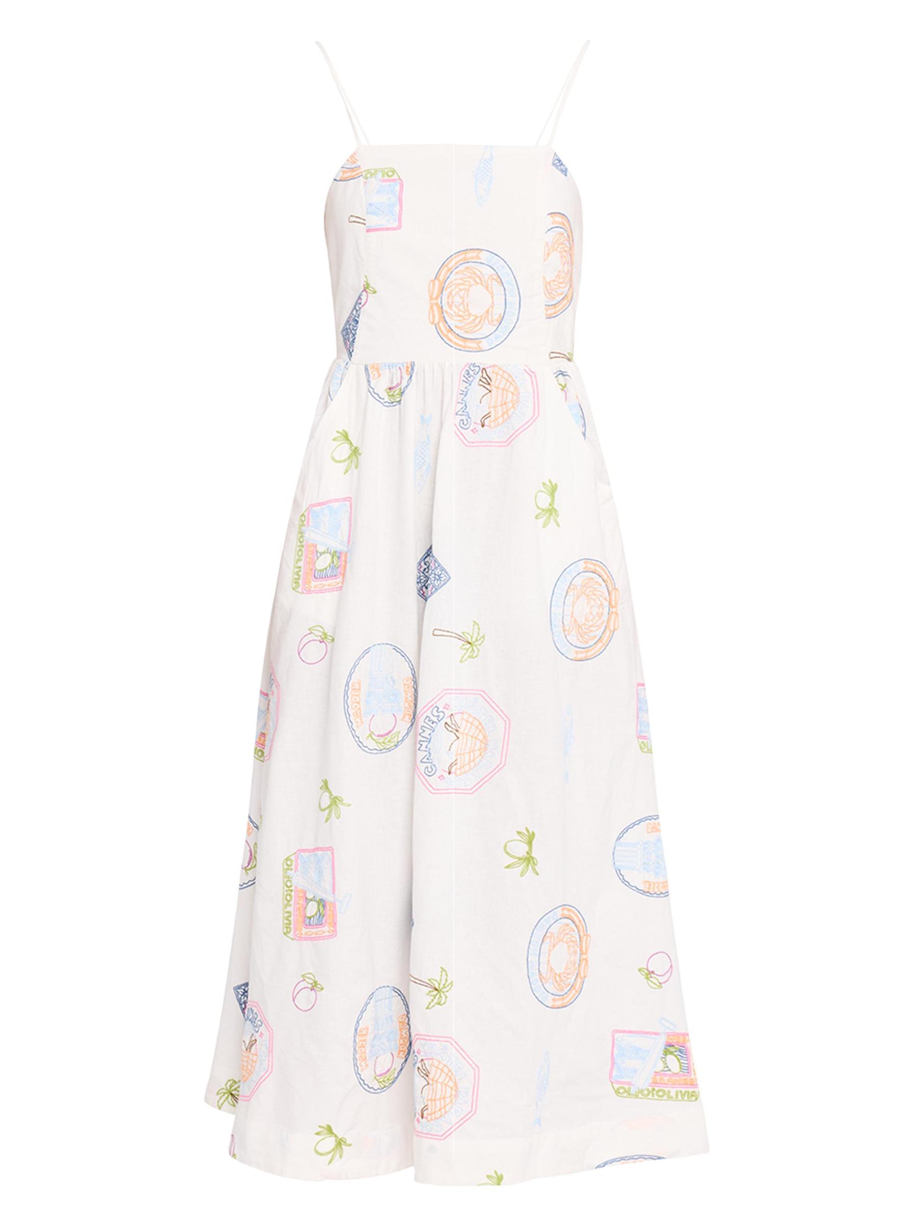 The Peaches apron dress from Damson Madder showcases an embroidered travel motif covering the relaxed, tie-back silhouette.