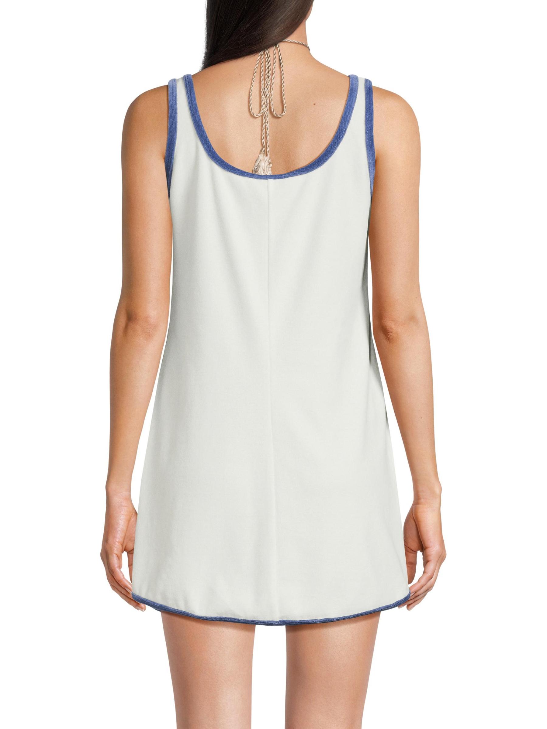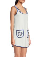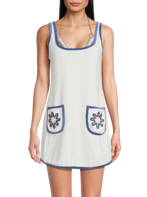 Crafted of plush cotton terry, this Peony A-line minidress from My Beachy Side features patch pockets accented with floral embroidery.Scoopneck Sleeveless Front patch pockets Rounded hem Pulls over 82% cotton/18% polyester Dry clean Imported