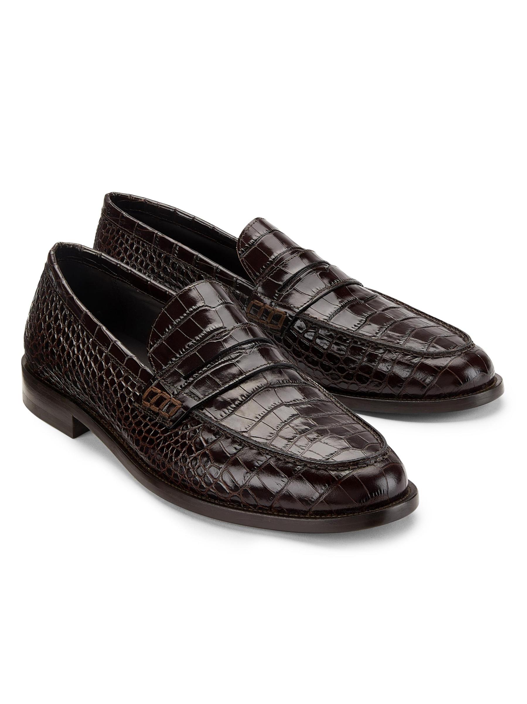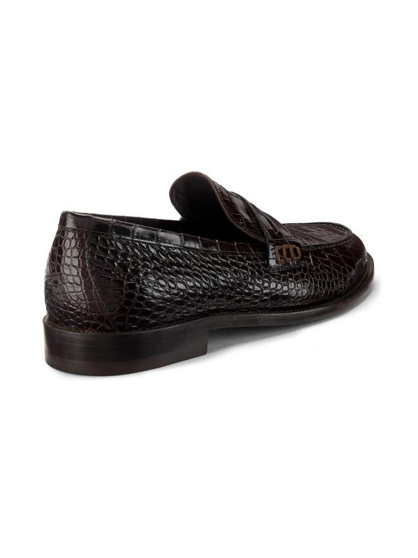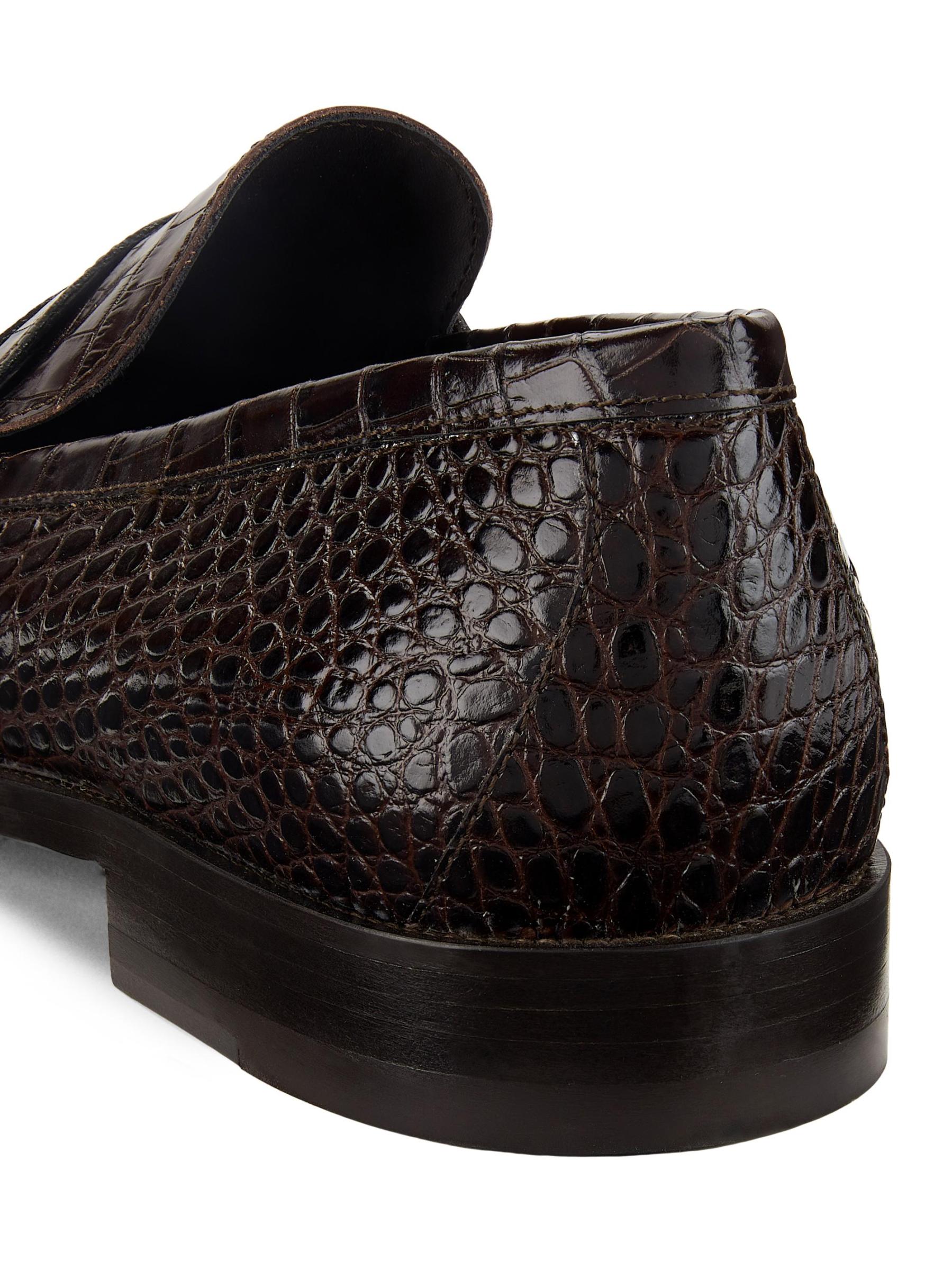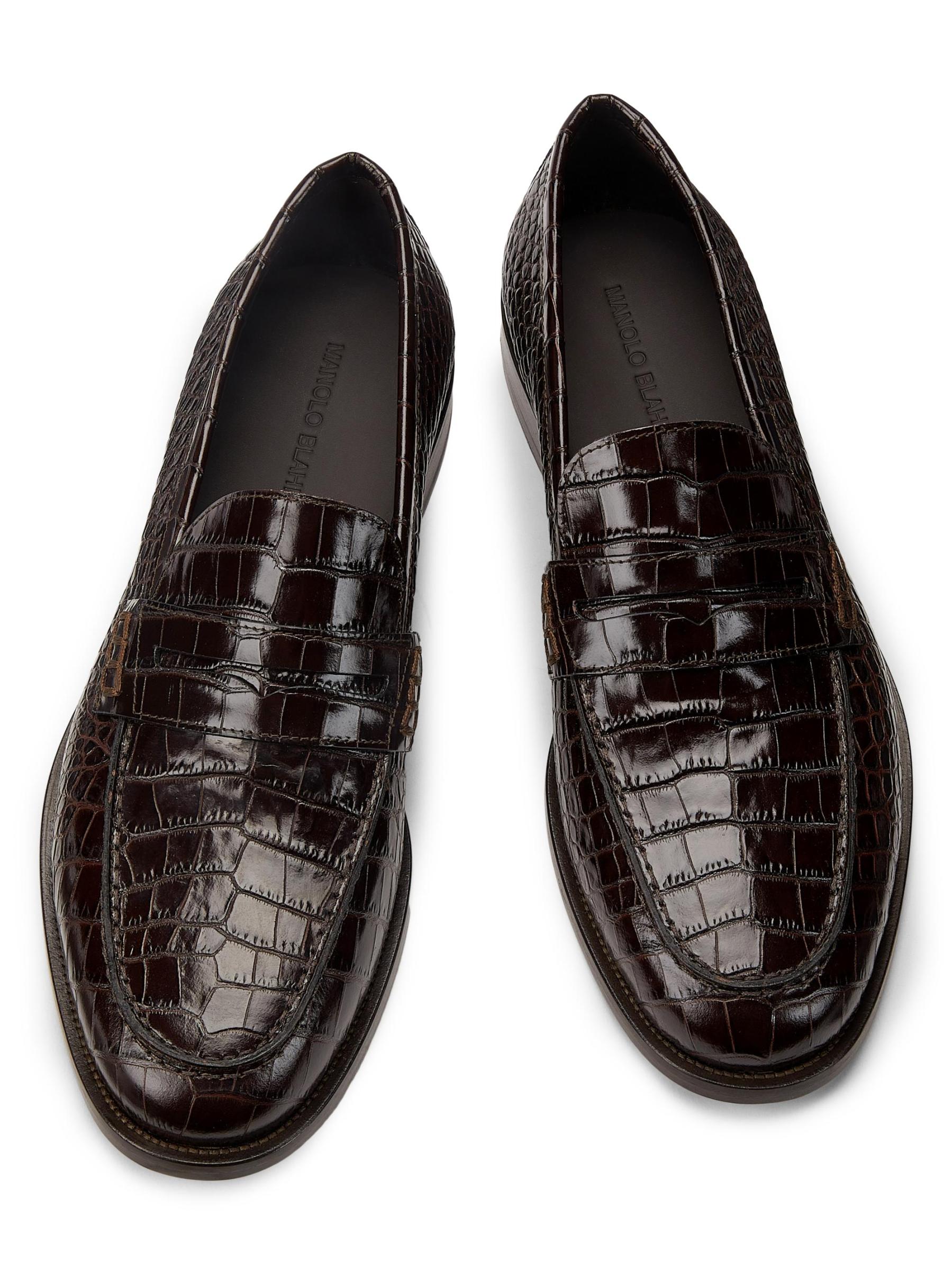 Highlighting a traditional almond toe silhouette, Manolo Blahnik's Perry penny loafers are crafted of croc embossed leather.