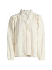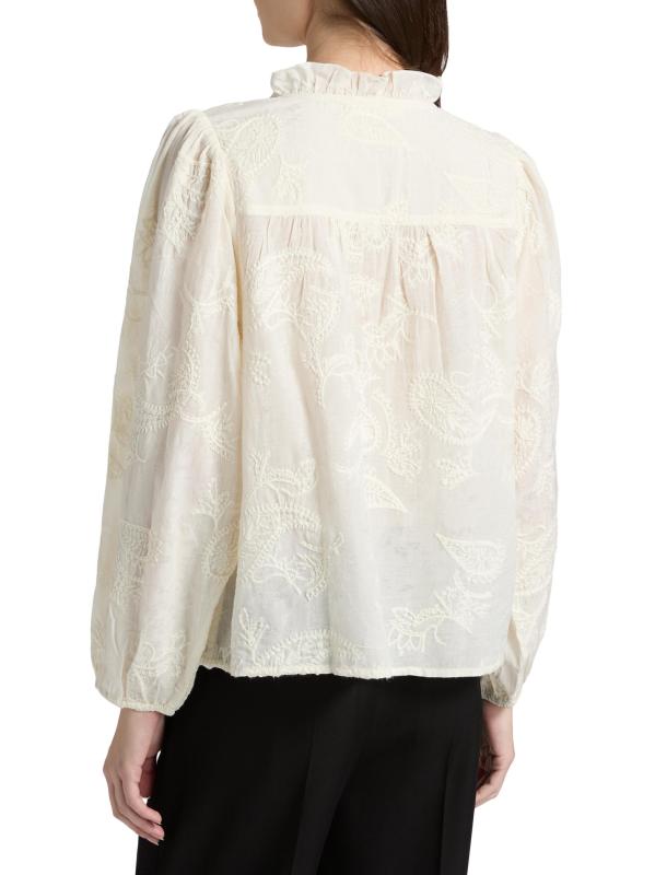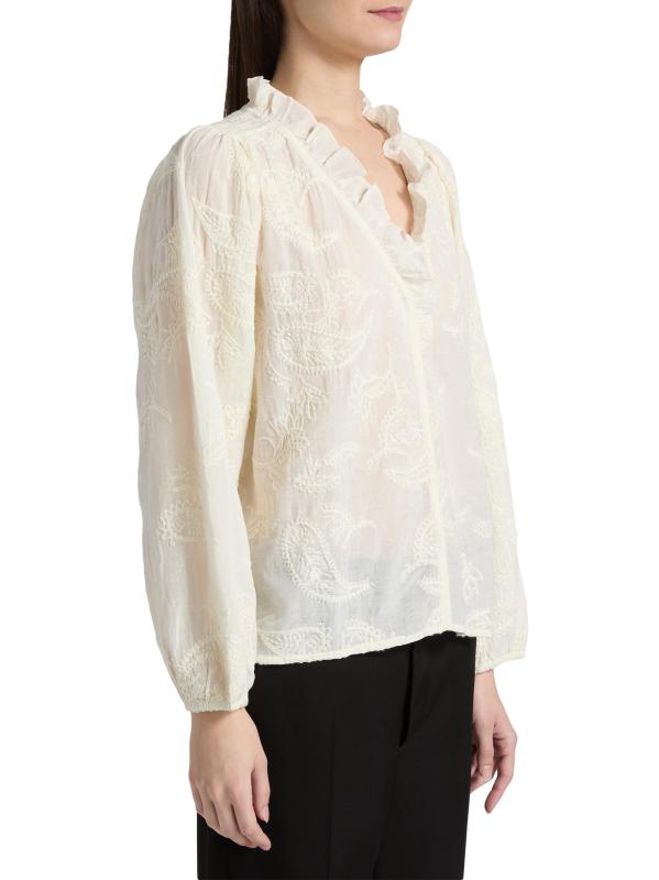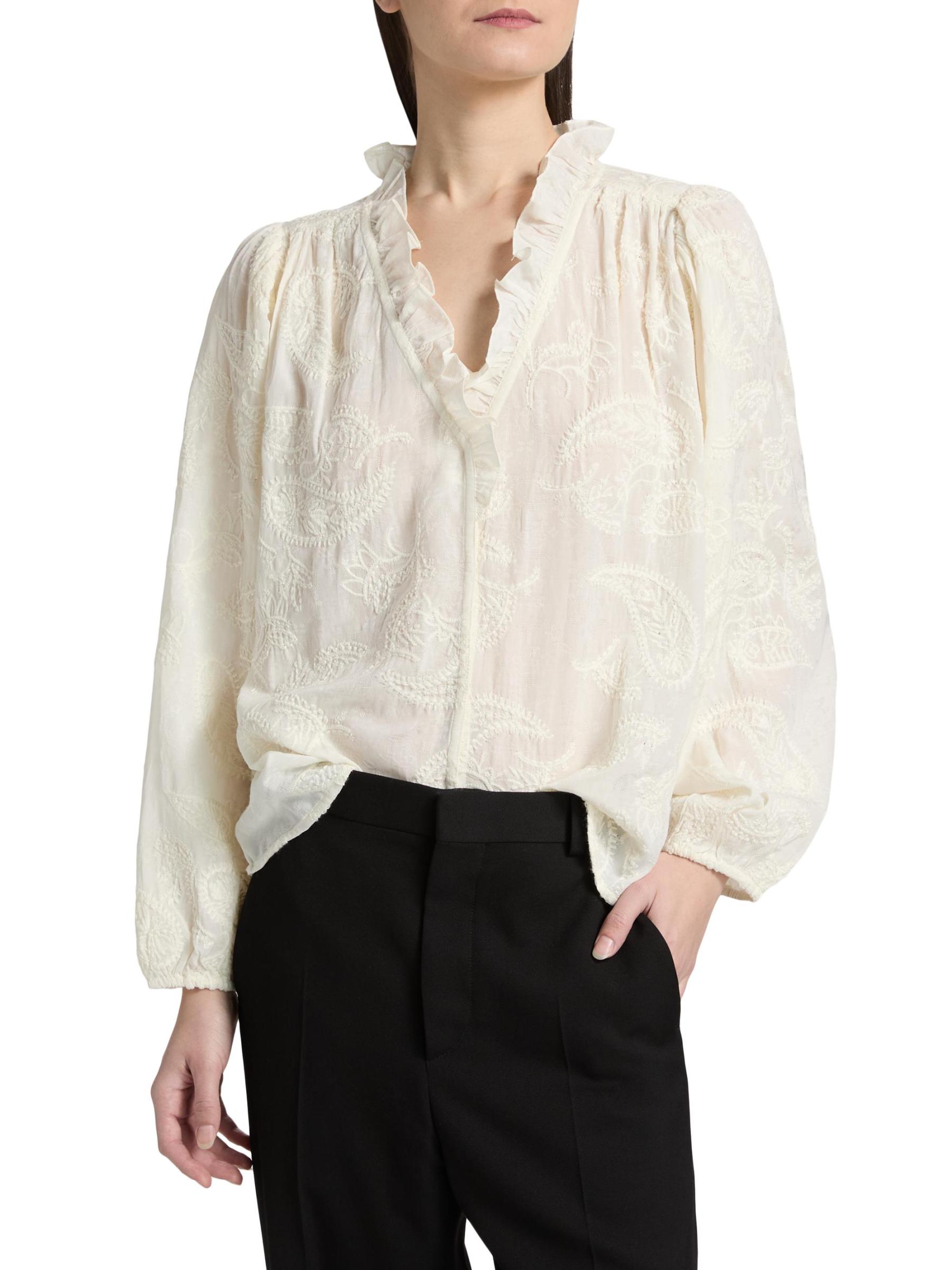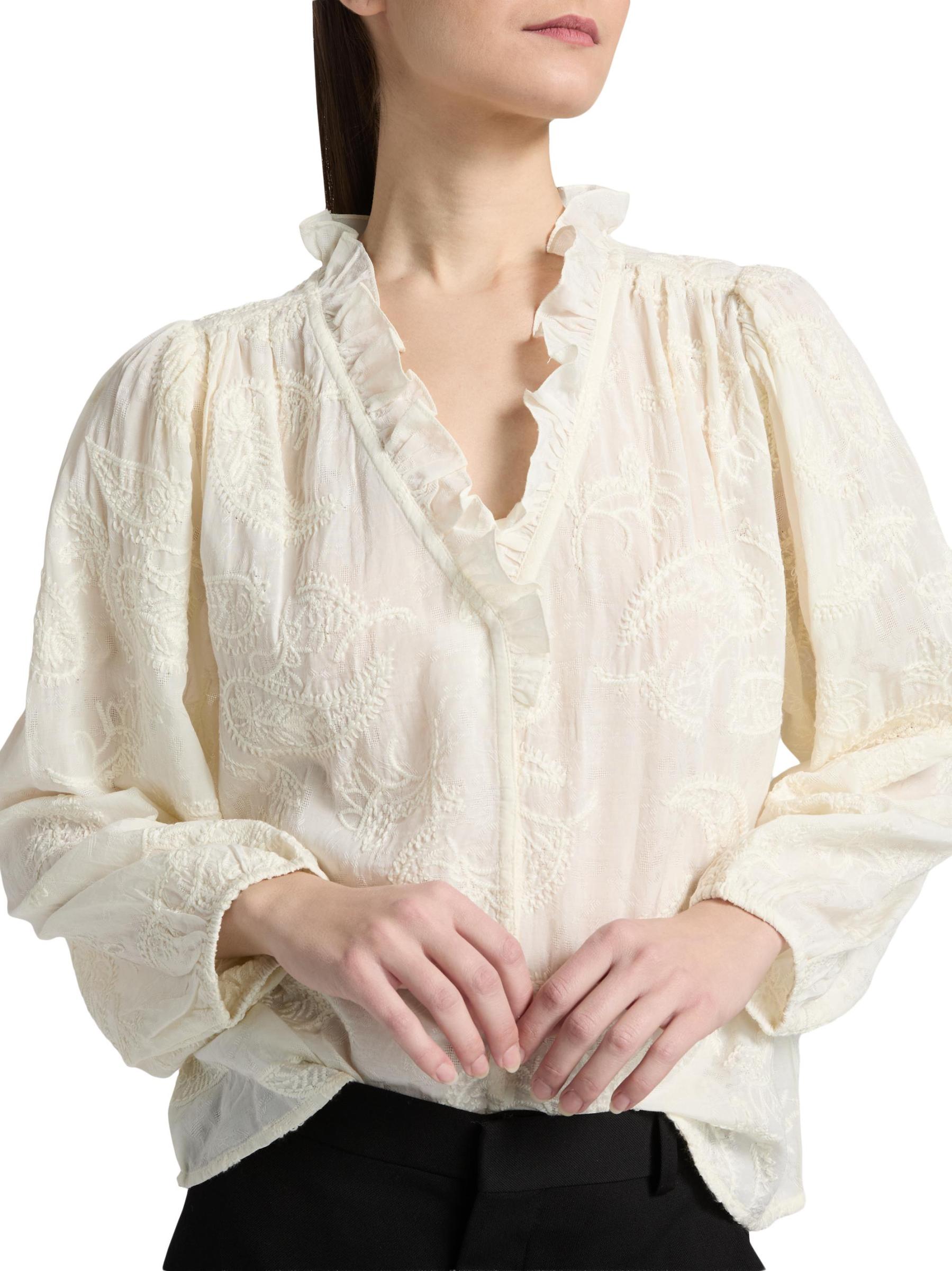 This Petty blouse from ba&sh showcases intricate paisley embroidery for bohemian charm. A ruffled V-neck and long sleeves with elasticized cuffs complete this style.
