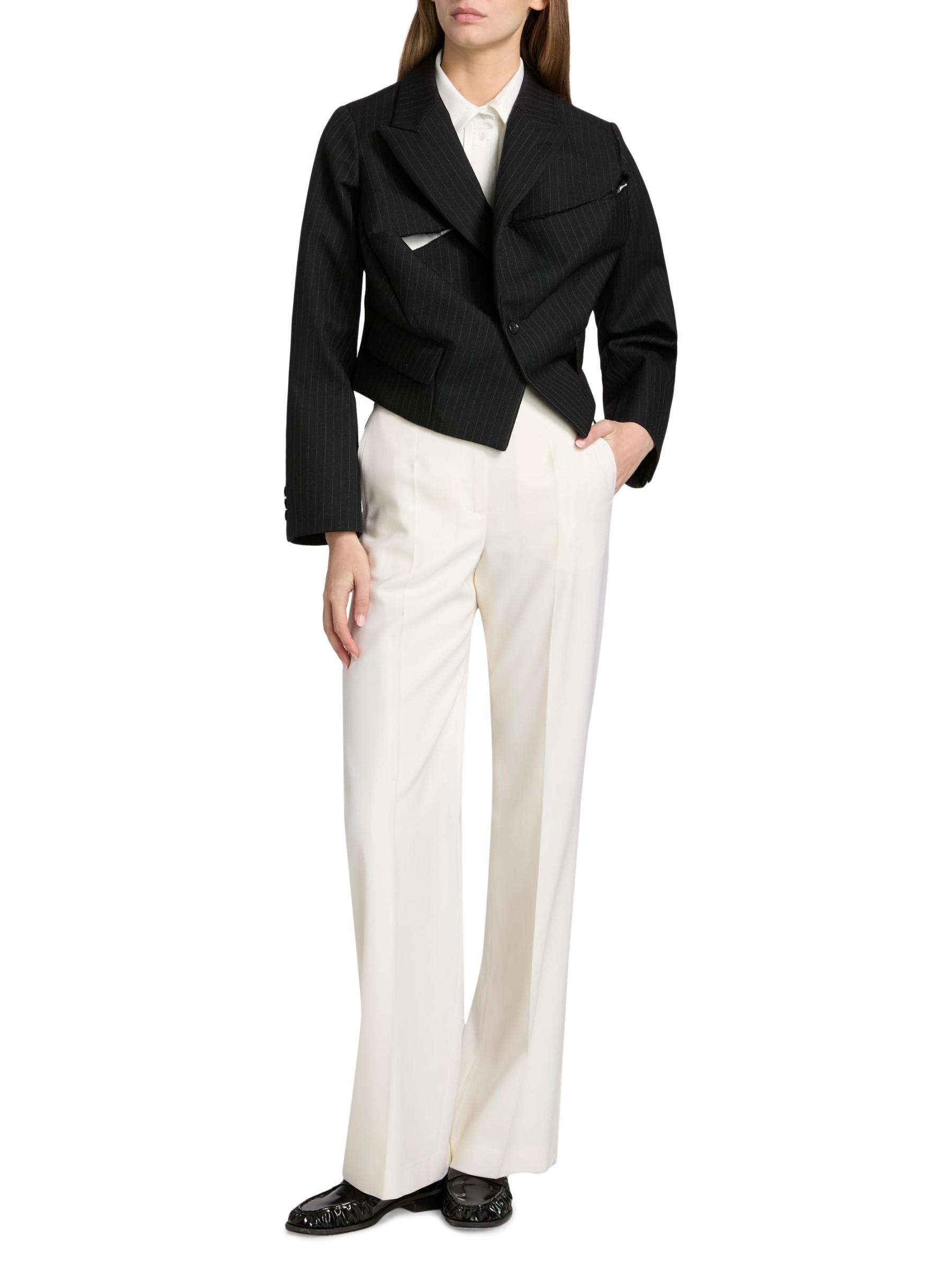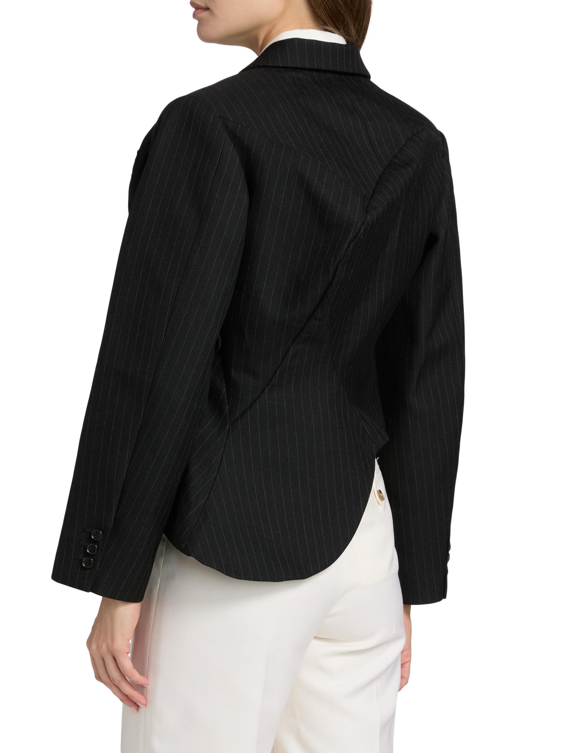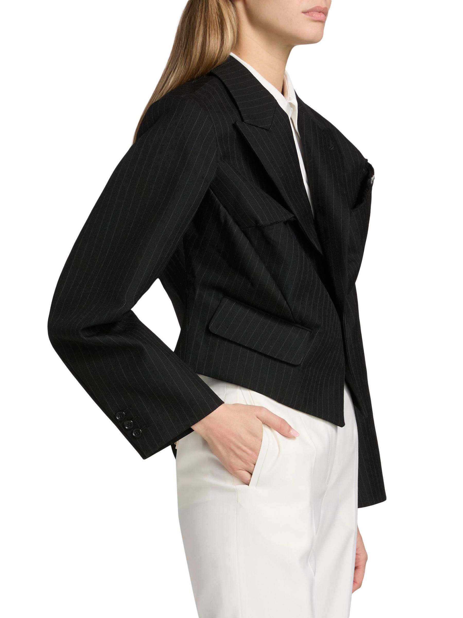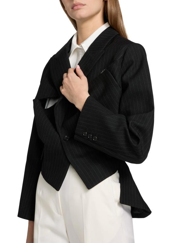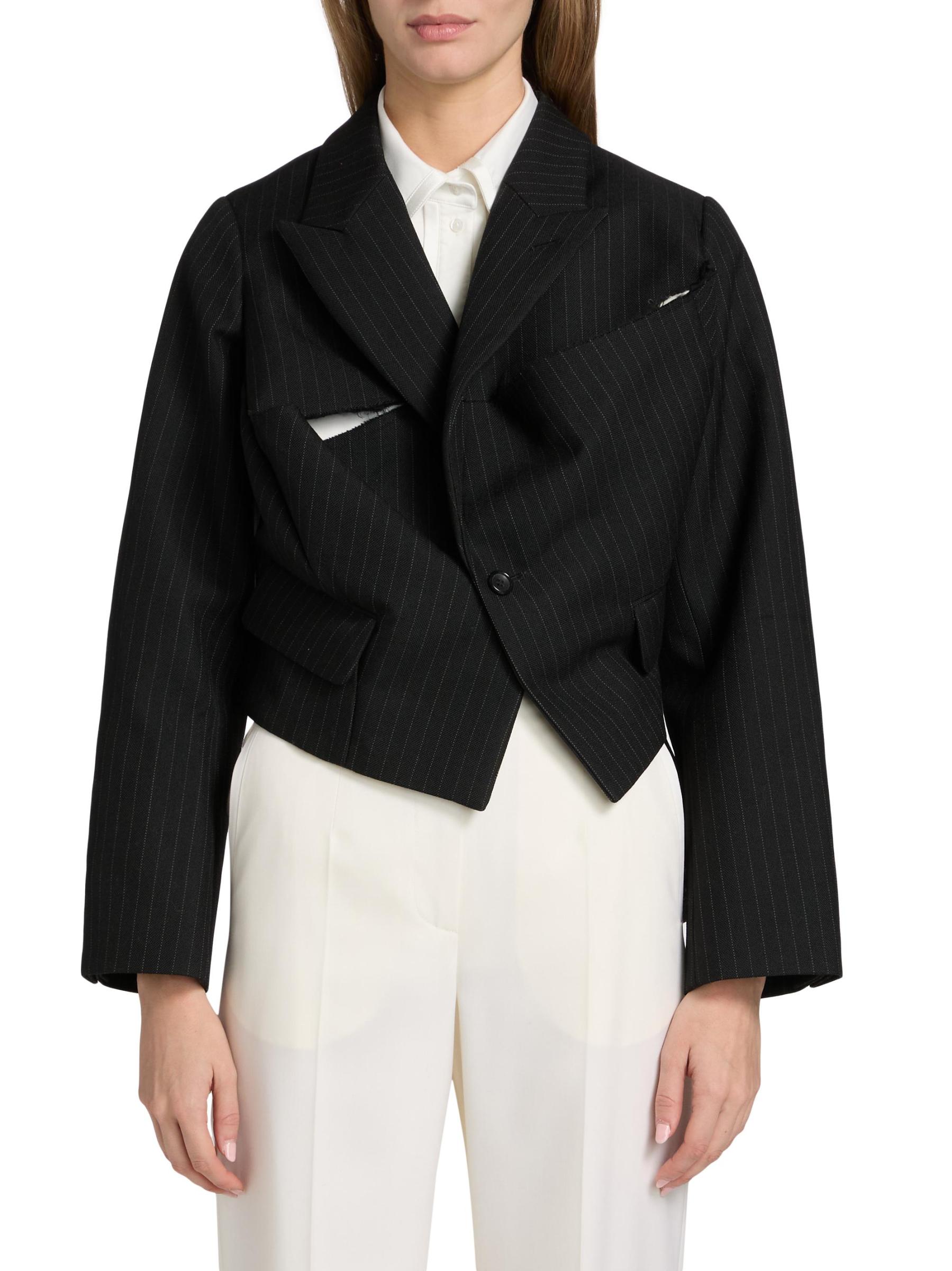 Crafted of structured wool, the pinstriped blazer from Comme des Garçons utilizes deconstructed cut outs at the bust, creating a sculptural shape. Seamed detailing boasts a bulbous design at the back.