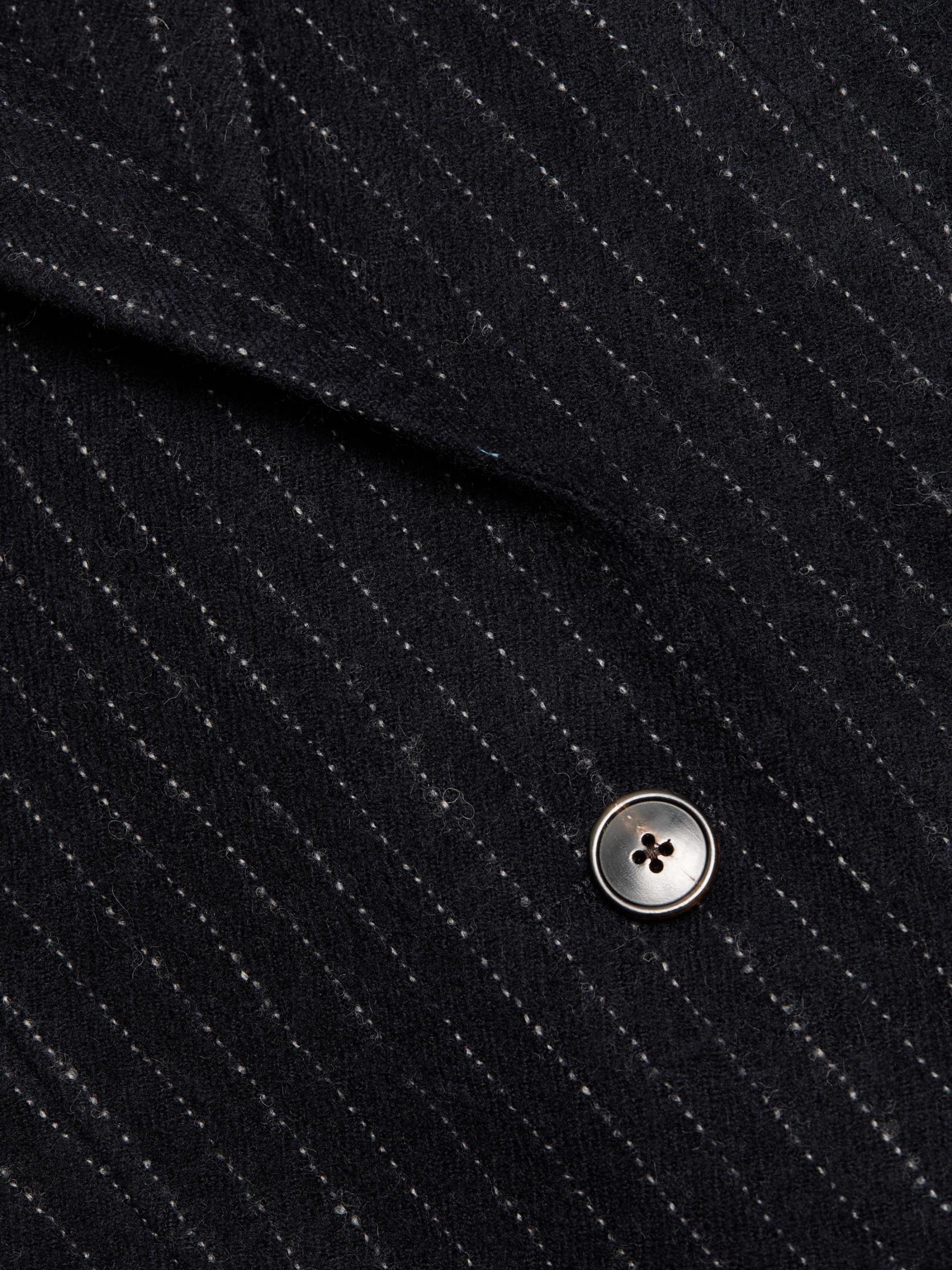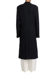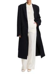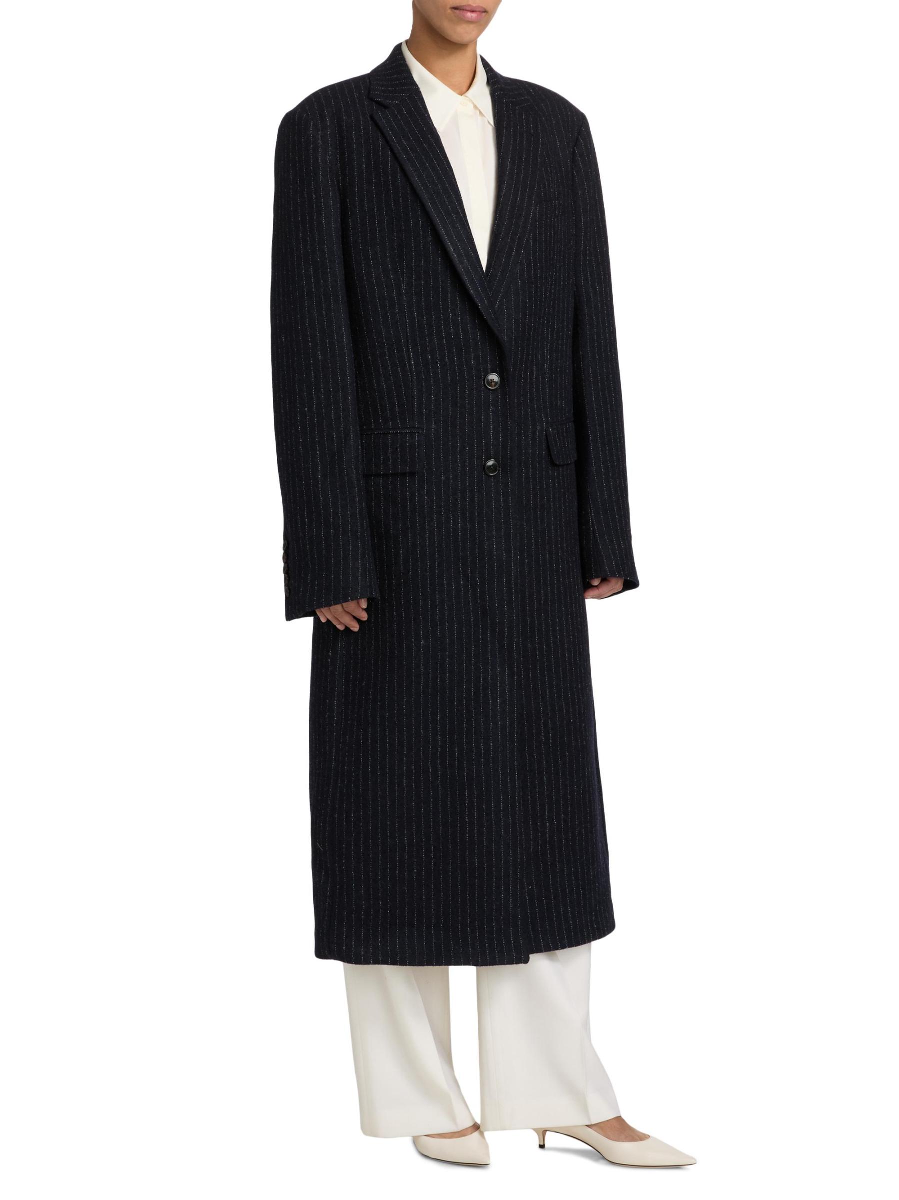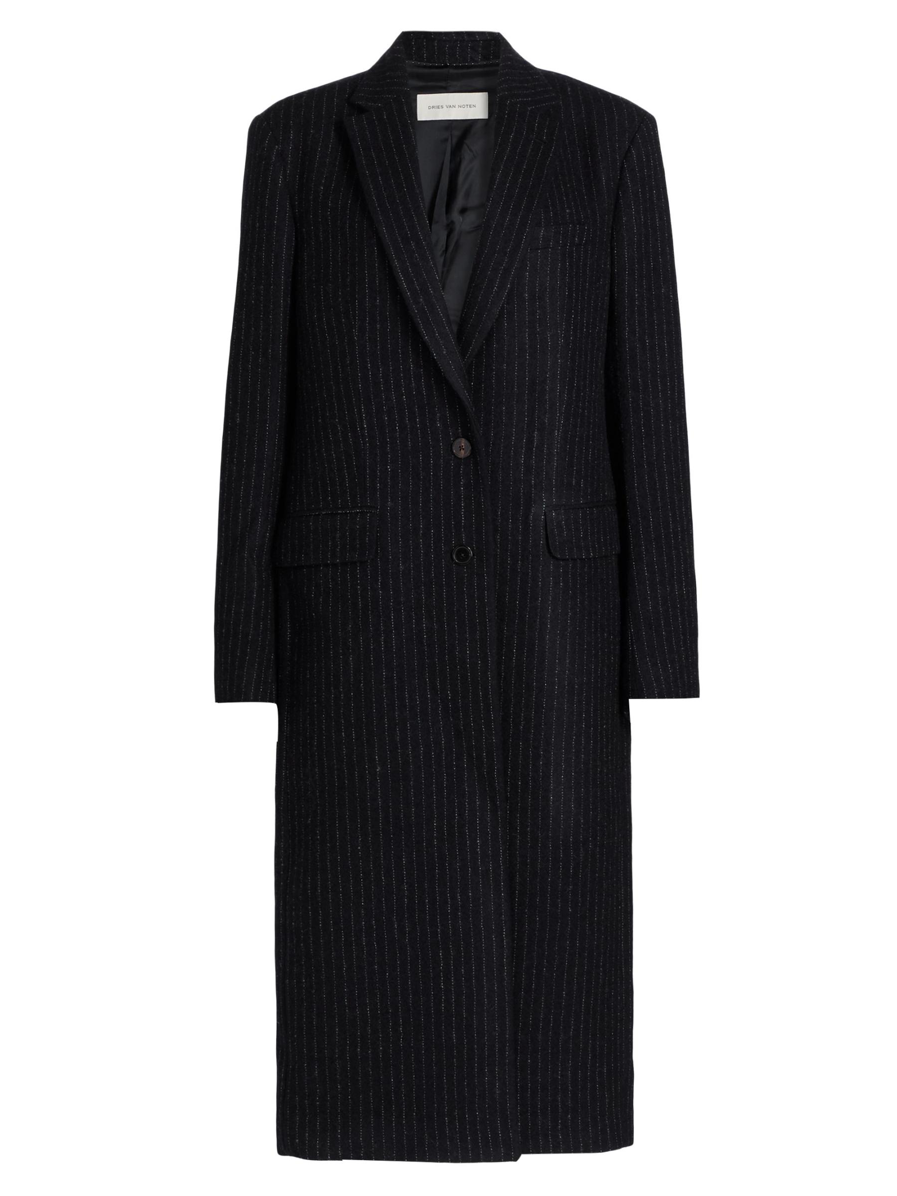 Crafted of wool, this Dries Van Noten single-breasted coat features a classic pinstriped design. Notch lapels, side flap pockets, and long sleeves with stacked button cuffs lend structure to this longline silhouette.