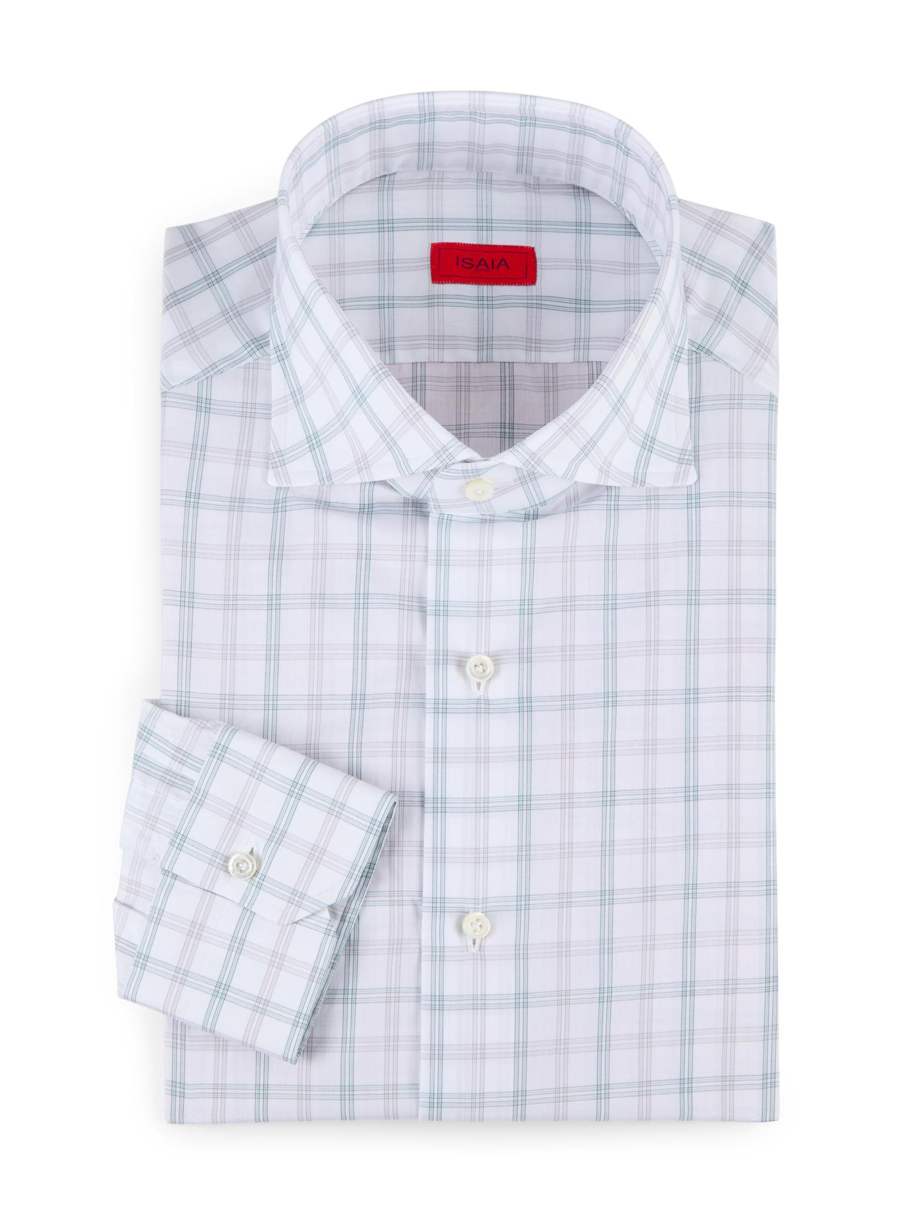 Made in Italy, this Isaia shirt is crafted of cotton, featuring a distinctive plaid pattern and buttoned mitered cuffs.Spread collar Long sleeves button cuffs Button front closure 100% Cotton Dry clean Made in Italy