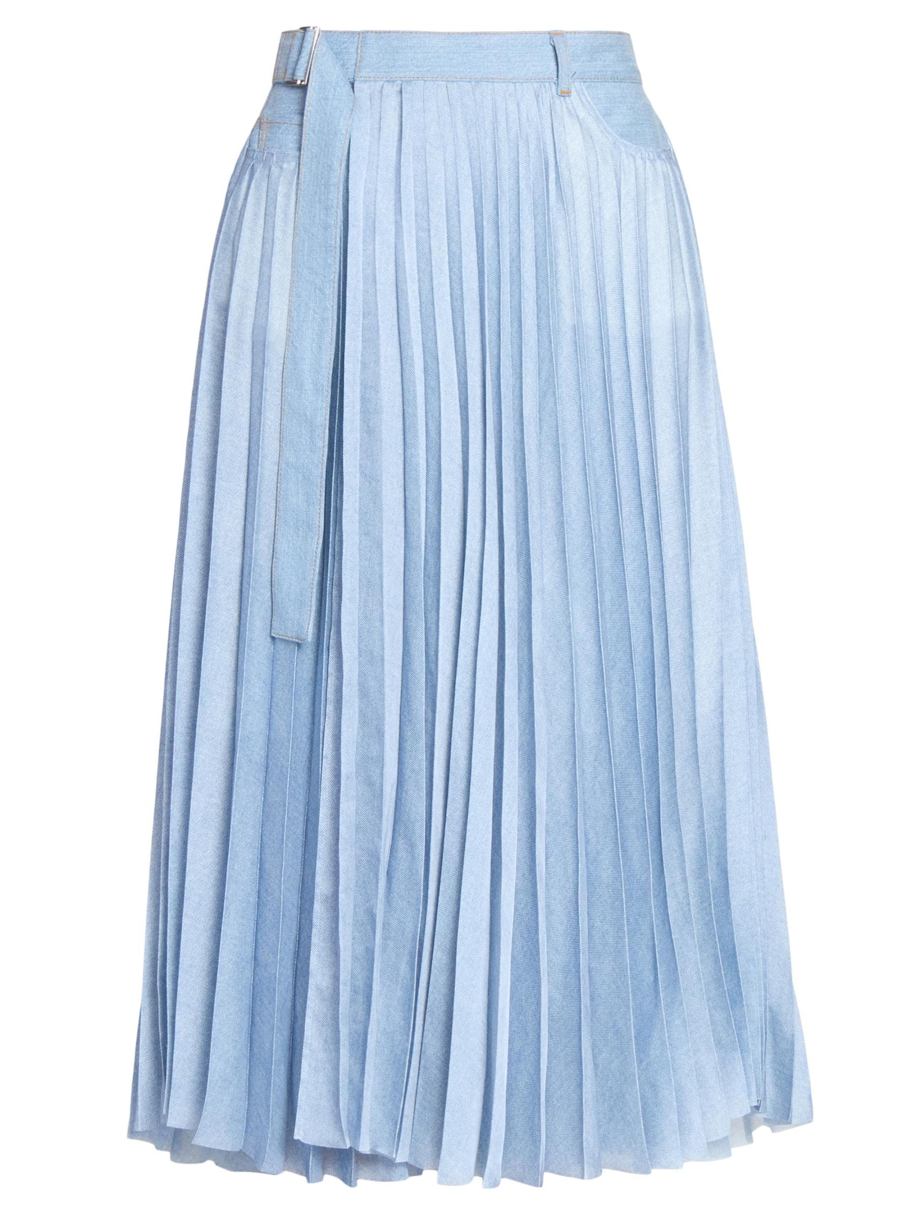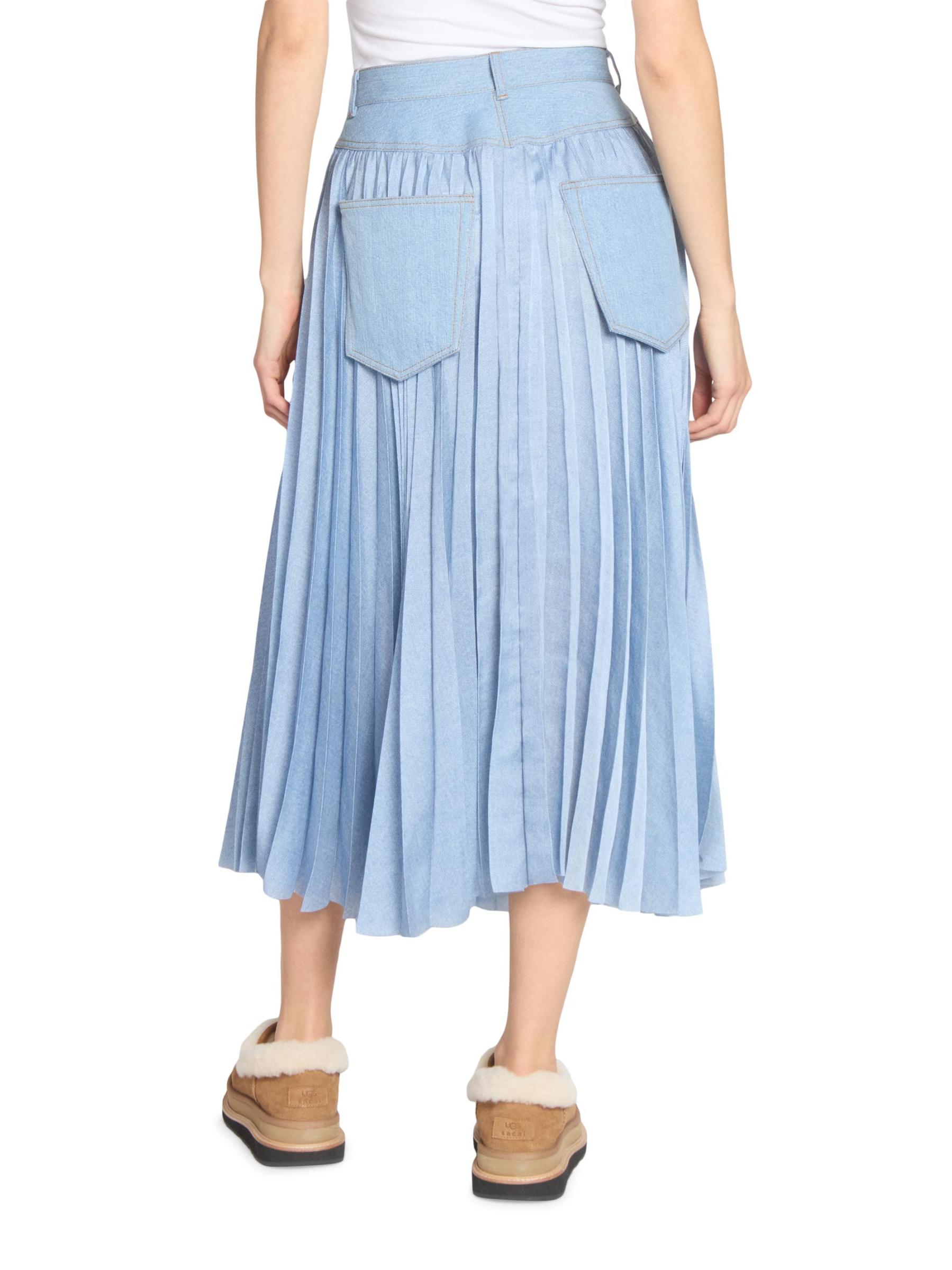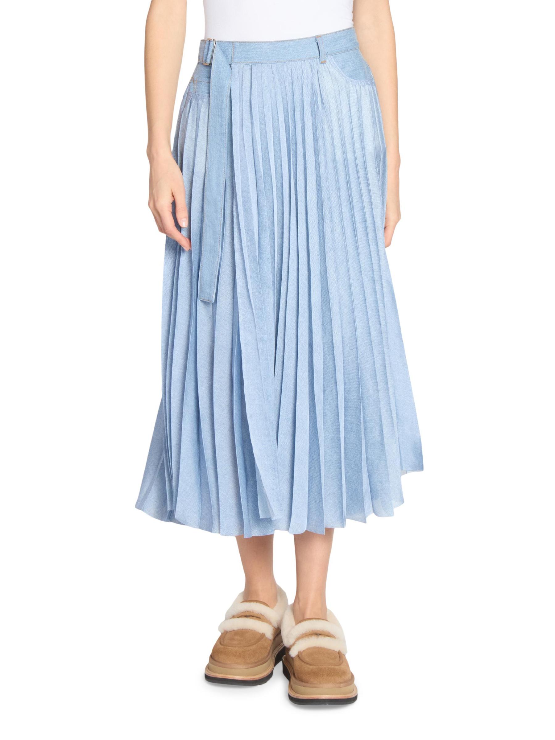 This denim midi-skirt from Sacai is designed with accordion pleats, belt loops, and a coordinating belt, featuring front pockets and back patch pockets for a utilitarian touch.Belt loops Belted Front slip pockets Back patch pockets 100% polyester Combo: 100% cotton Dry clean Made in Japan