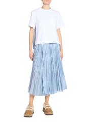 This denim midi-skirt from Sacai is designed with accordion pleats, belt loops, and a coordinating belt, featuring front pockets and back patch pockets for a utilitarian touch.