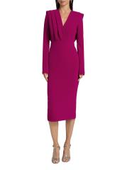 Pleated Stretch Crepe V-Neck Midi-Dress