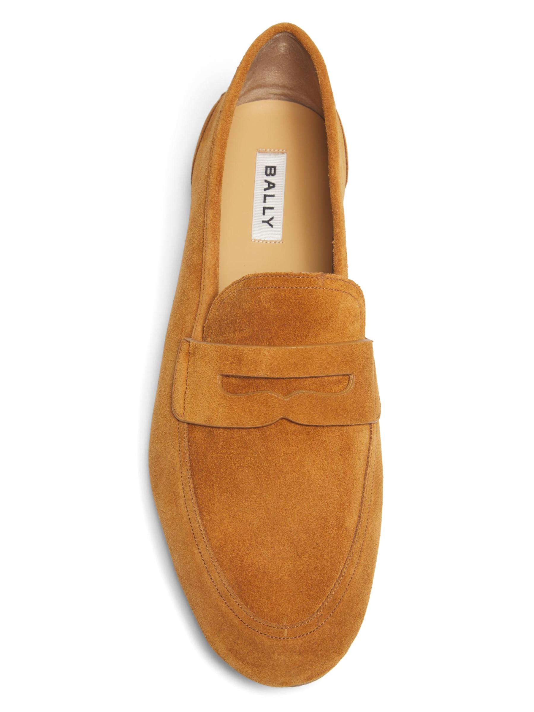 The Pleven penny loafers from Bally are crafted of rich suede and highlight a streamlined almond-toe silhouette.