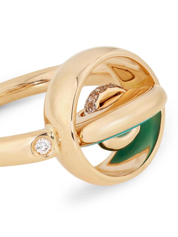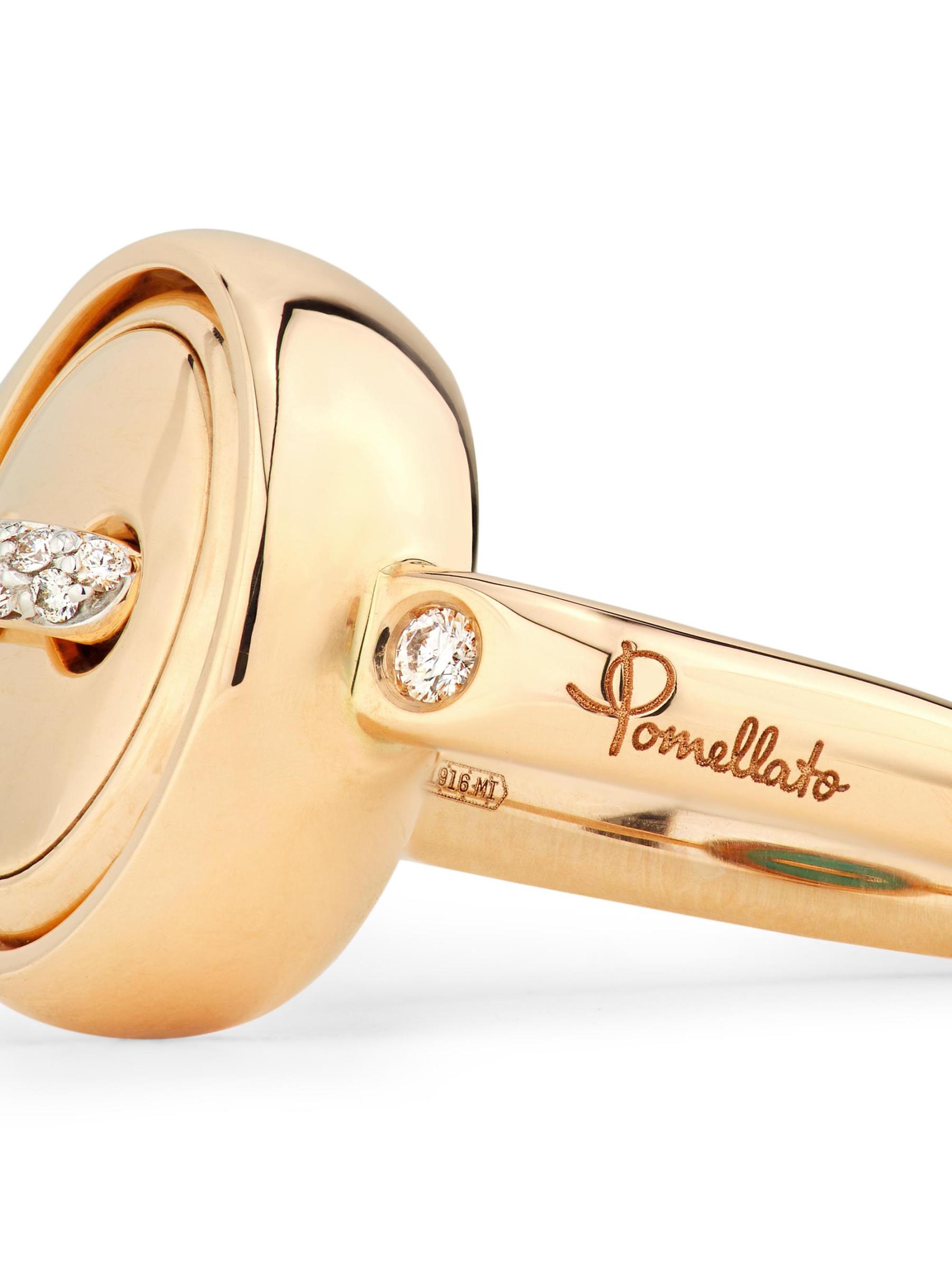 From the Pom Pom Dot Collection. Handcrafted of 18K rose gold, this ring from Pomellato features a playful button-inspired face that reverses from a polished finish with pavé diamonds to a colorful gemstone inlay.