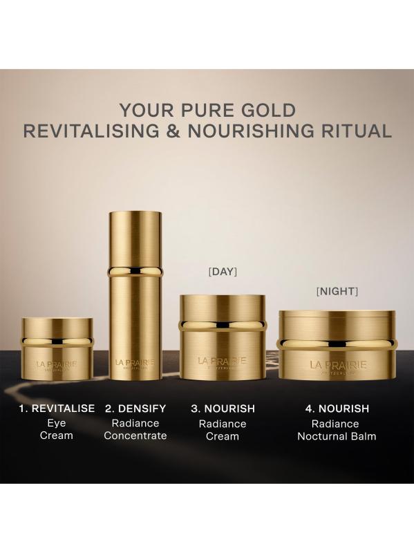 Pure Gold Radiance Eye Cream. Using the golden spoon, swipe a small amount onto fingertips. Using the ring finger, dot the cream under the eye from the temples to the inner corner, continuing under the brow line back to the temple to complete a full circle around the eye area. Repeat the pattern with a gentle, smooth motion of the fingertip to help the eye cream absorb. Pure Gold Radiance Concentrate: Dispense a small amount from the pipette onto fingertips. Gently smooth over face and neck, avoiding the eye area. Pure Gold Radiance Cream: Apply morning and evening afterface serum. Using the golden spoon, swipe a small amount onto fingertips. With the fingertips, gently smooth over face and neck, avoiding the eye area. Allow to absorb completely. In the morning, finish the skincare ritual with UV protection. Pure Gold Nocturnal Balm: Apply in the evening afterface serum.