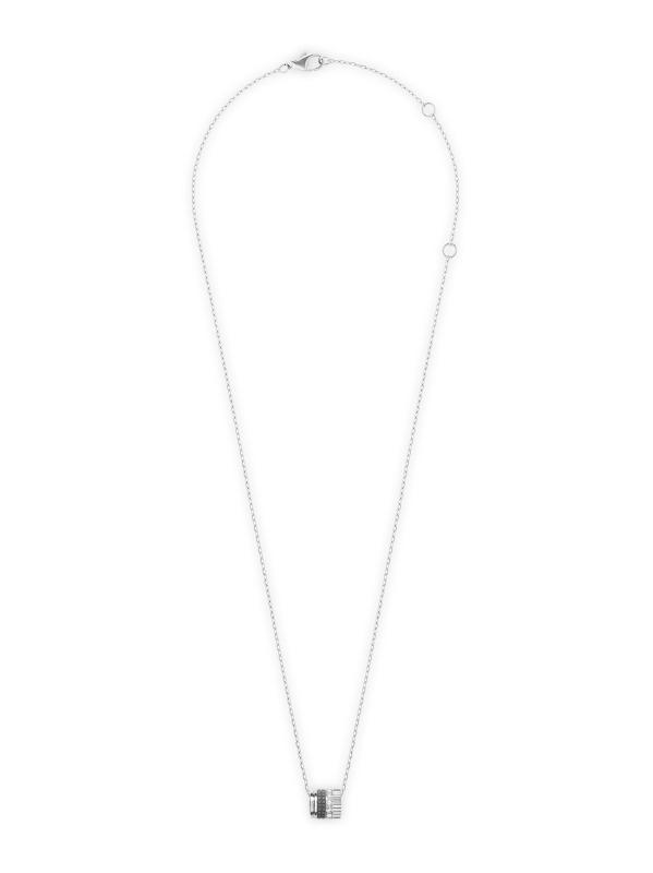 From the Quatre Black Edition. Crafted of 18K white gold accented with black PVD plating, Boucheron's necklace features a dainty pendant showcasing three of the Parisian label's iconic design elements. A band of pavé diamonds lends radiant shimmer to this graphic piece.