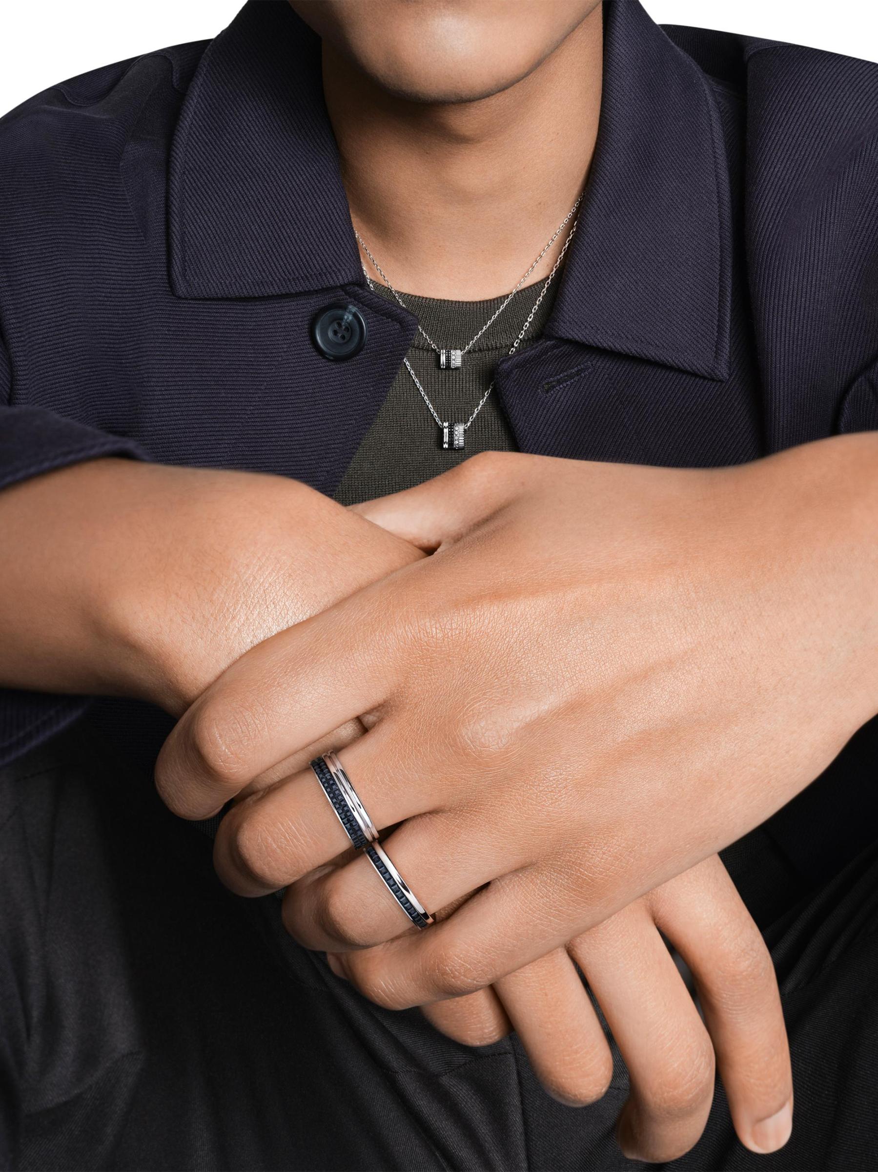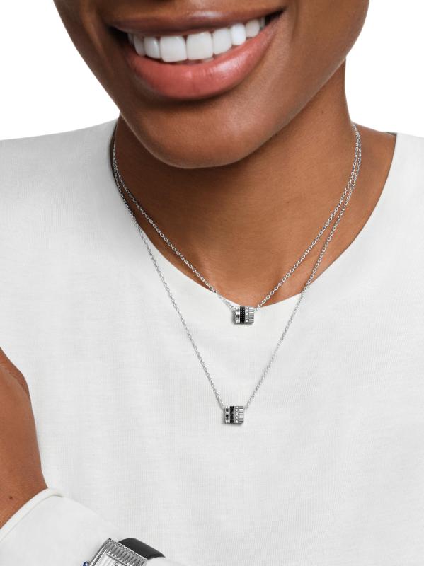 From the Quatre Black Edition. Crafted of 18K white gold accented with black PVD plating, Boucheron's necklace features a dainty pendant showcasing three of the Parisian label's iconic design elements. A band of pavé diamonds lends radiant shimmer to this graphic piece.Diamonds, 0.17 tcw 18K white gold with black PVD plating Made in Switzerland