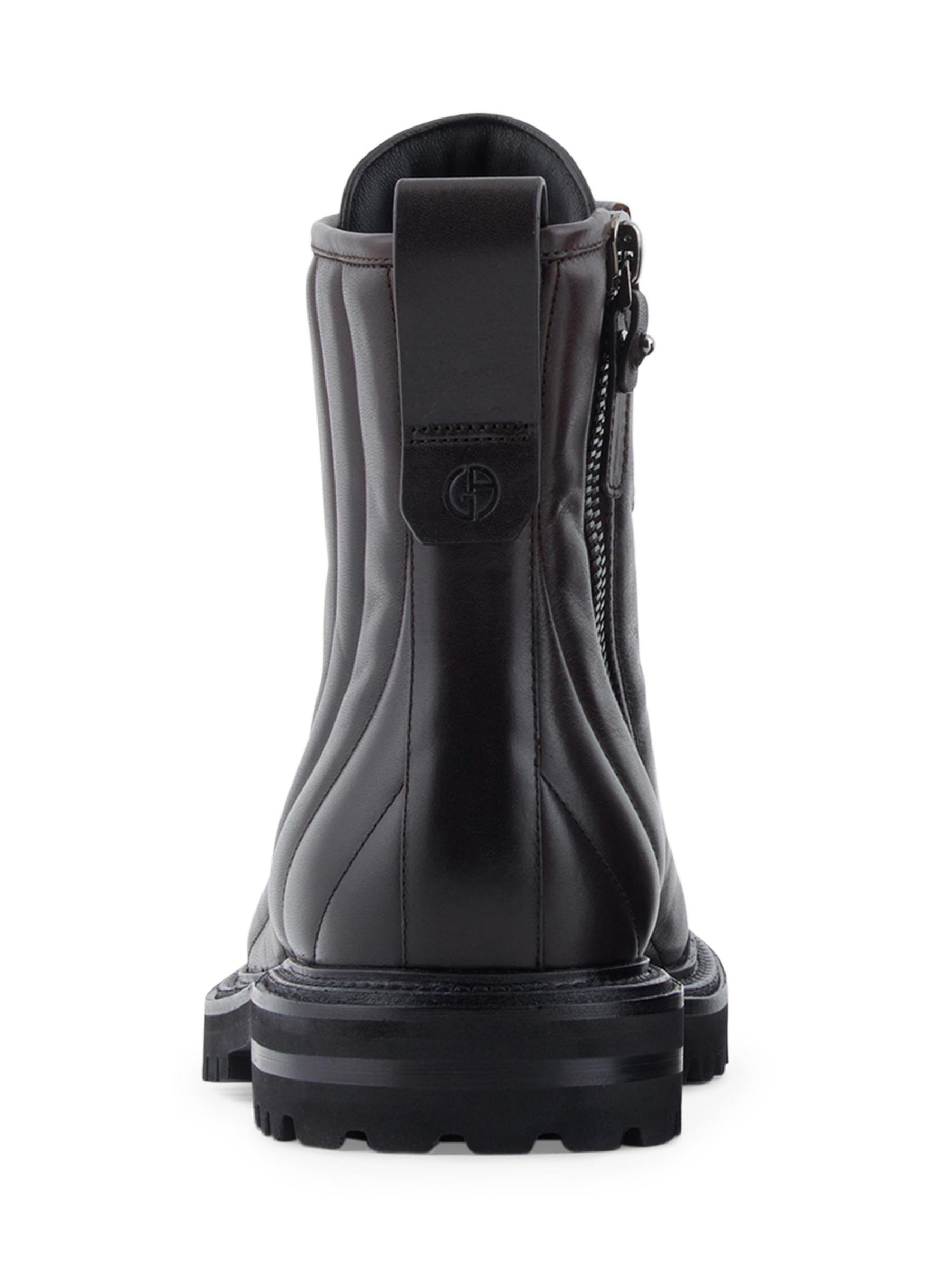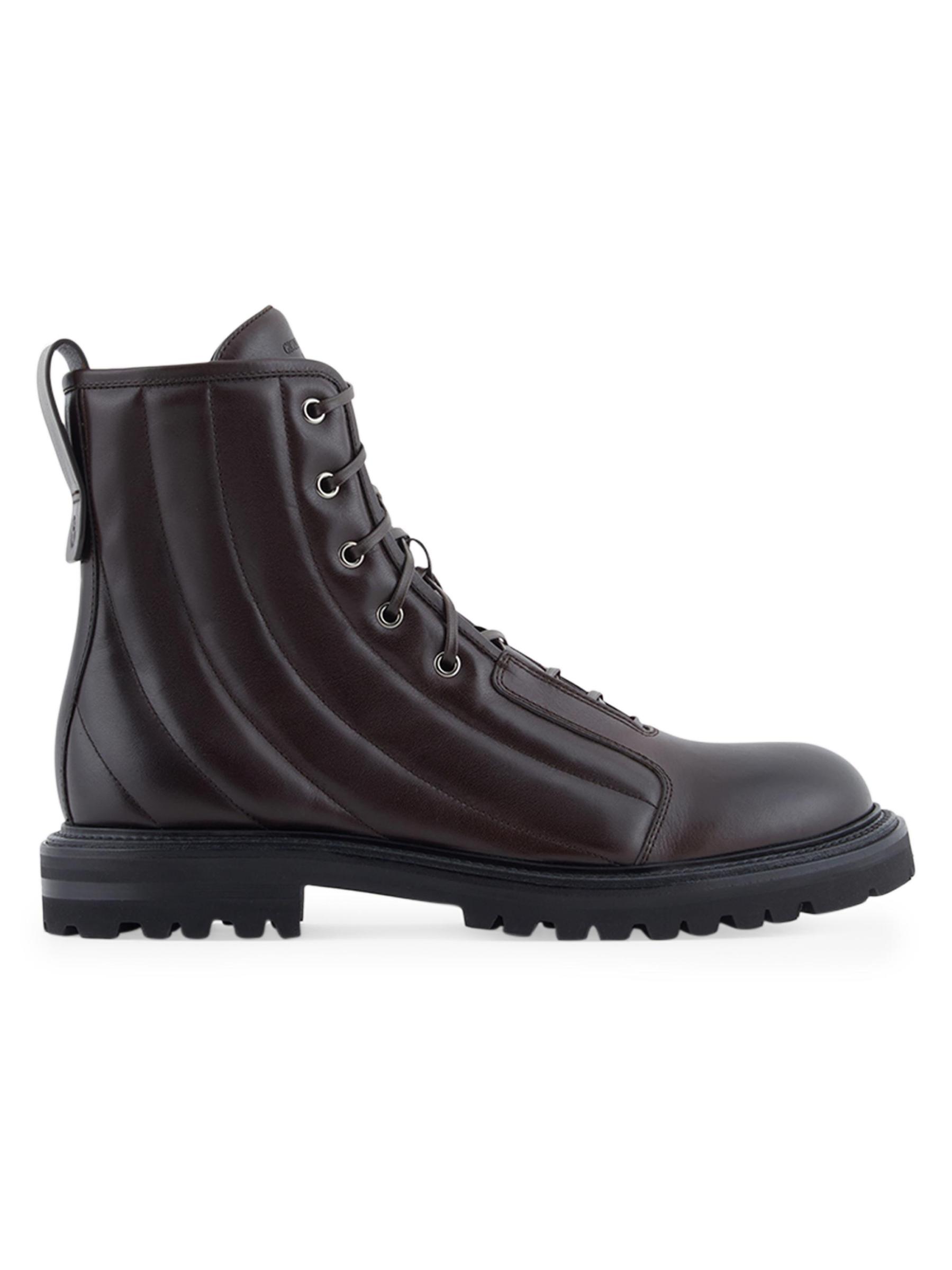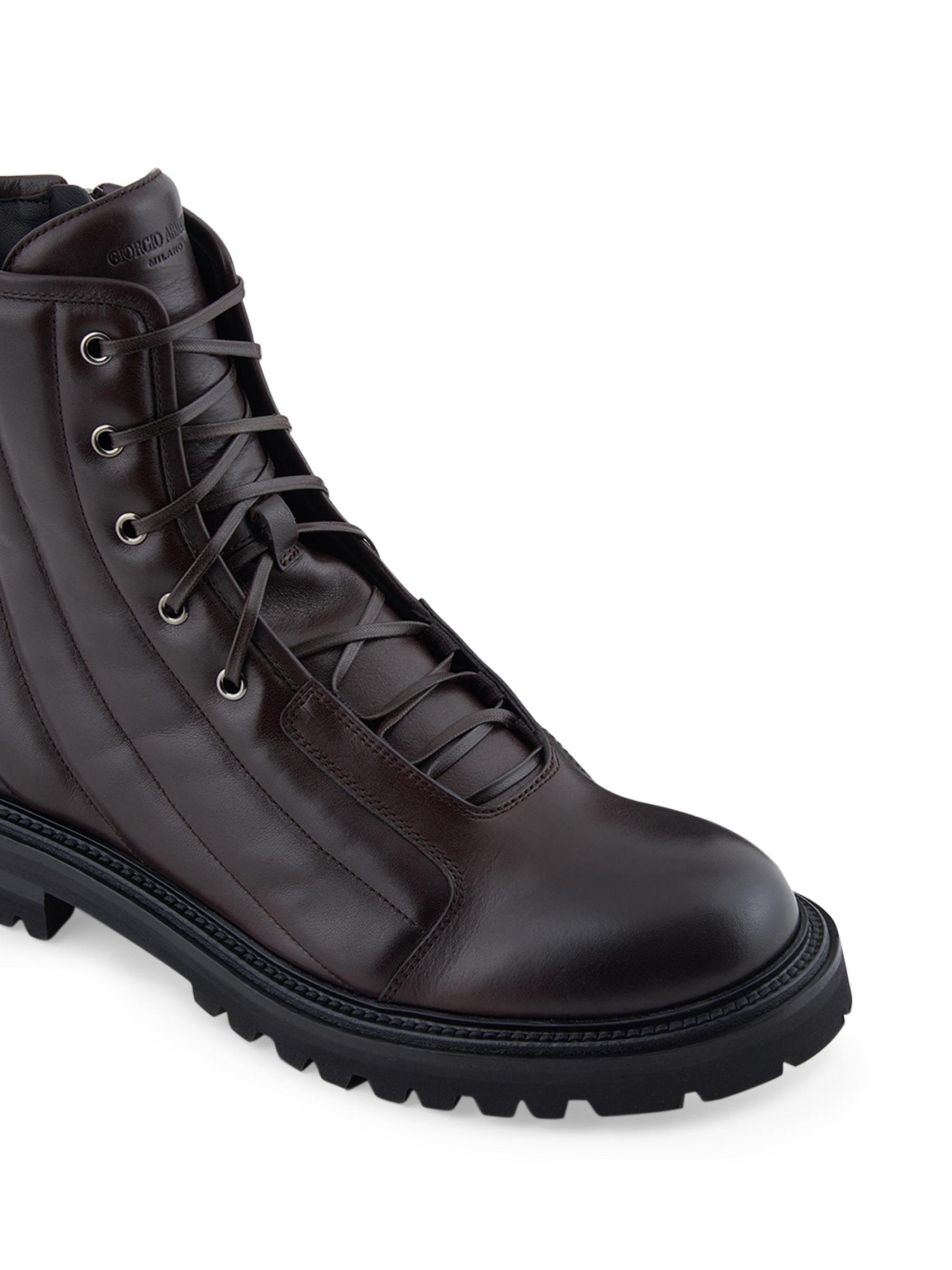 Constructed of smooth leather with distinctive quilting, these Giorgio Armani combat boots feature a classic lug sole, a debossed tongue logo, and a monogram backstay pull tab. A side zip makes for easy on and off.Round toe Lace-up and side zip closure Leather upper Rubber sole Made in Italy
