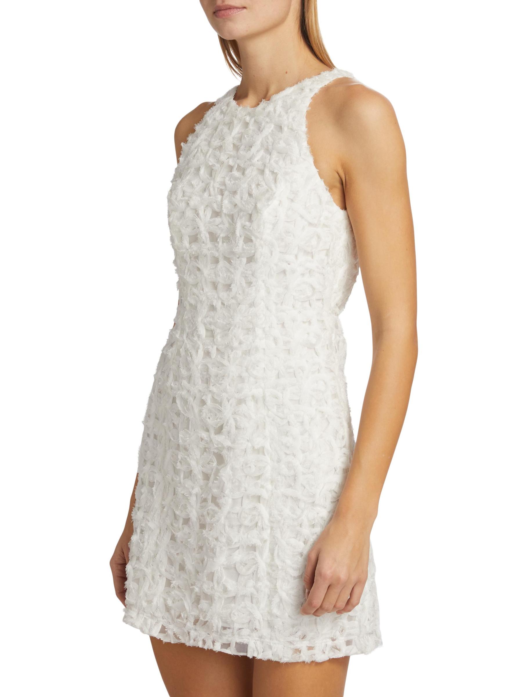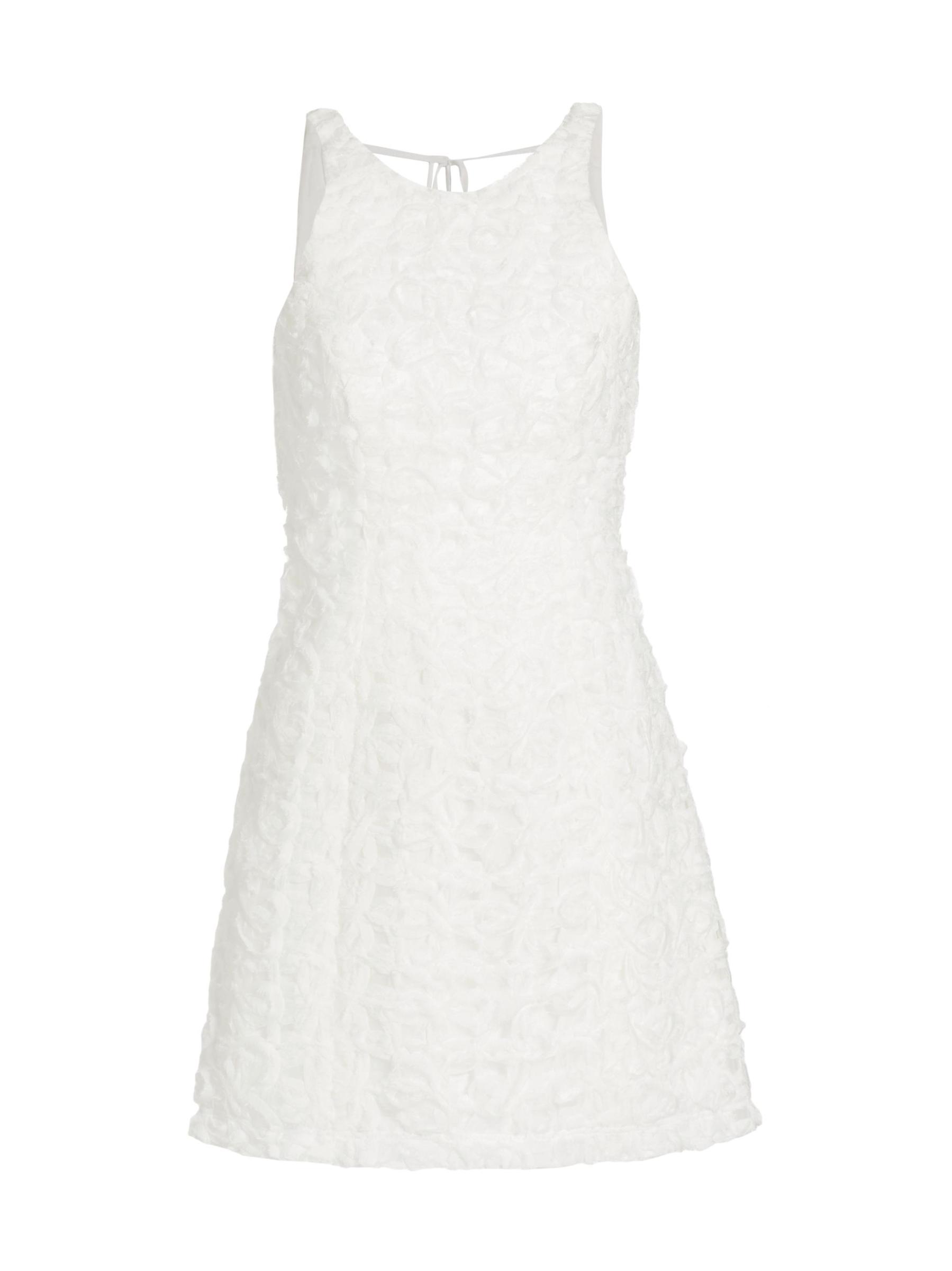 From the Element Collection. Finished in a floral-like texture, Aje's Quinette backless minidress showcases a fitted A-line silhouette. This romantic piece features a back ribbon tie.