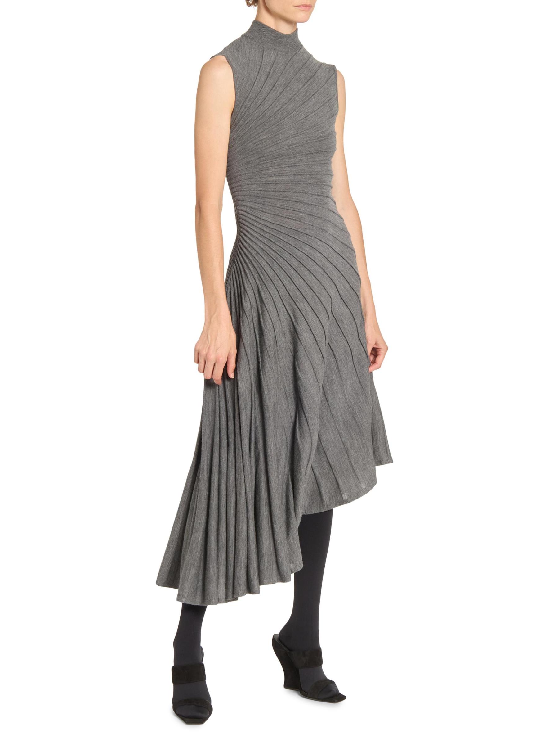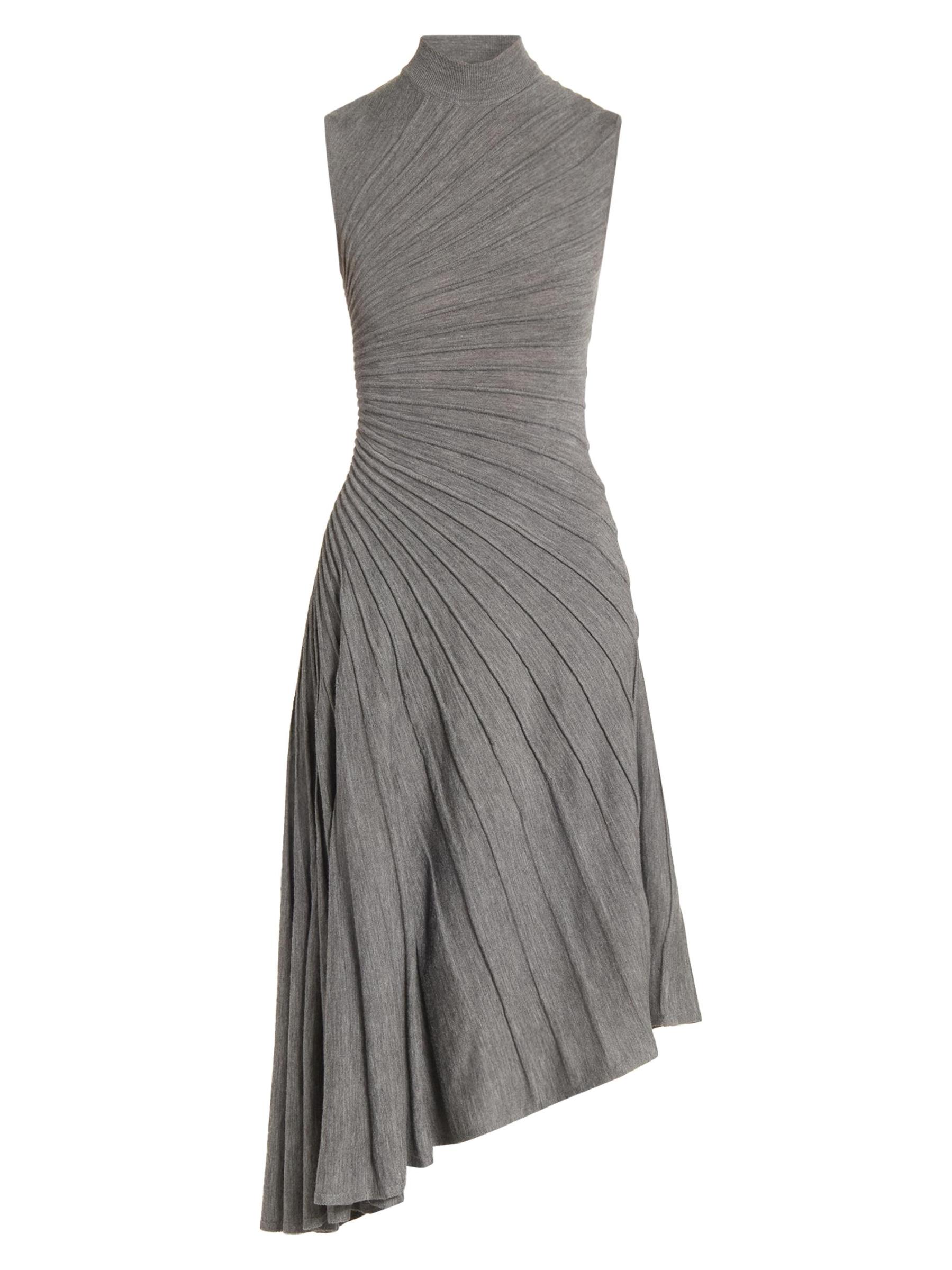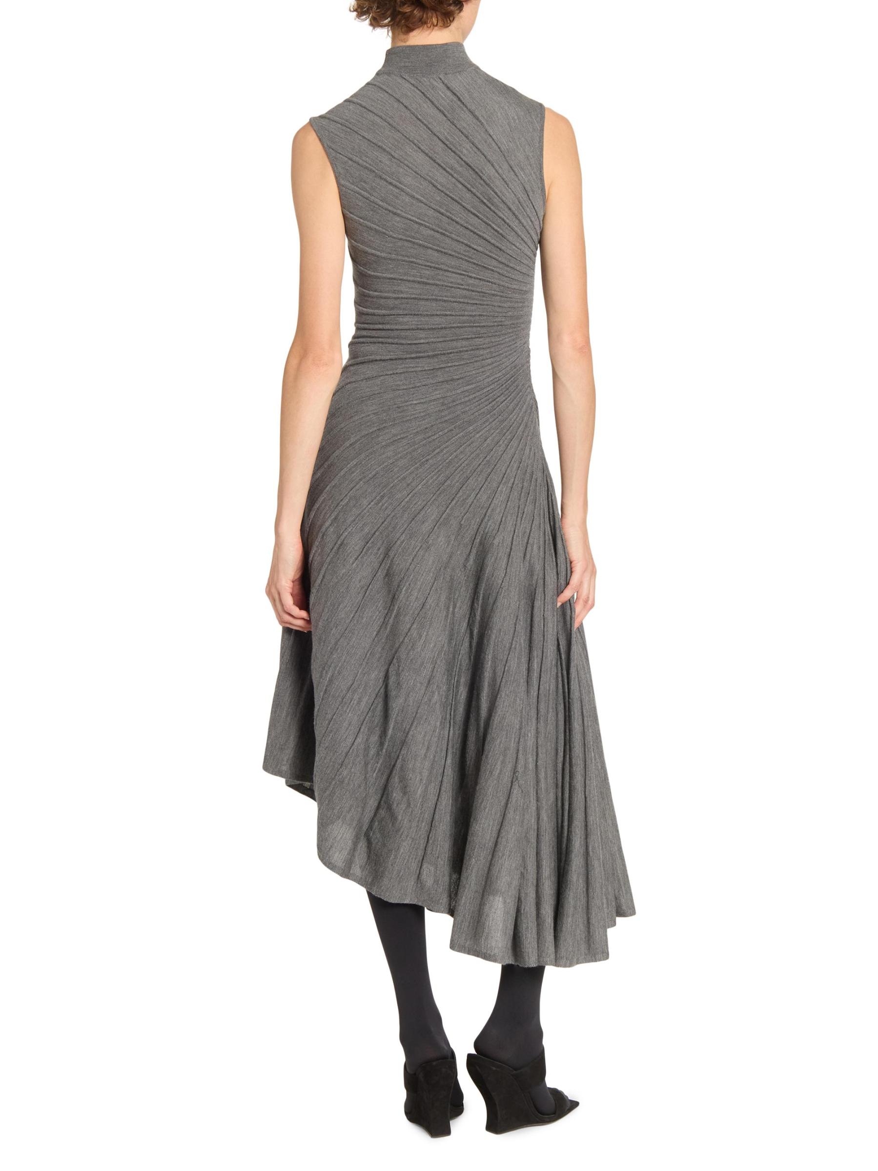 Knit from wool, this Ray sleeveless midi-dress from Alaïa is designed with an A-line silhouette, a mock turtleneck, and an asymmetric hemline. The piece is defined by precise pleating that radiates across the bodice and flows into the skirt, creating a sculpted effect.Mock turtleneck Sleeveless Pulls over 100% wool Dry clean Made in Italy
