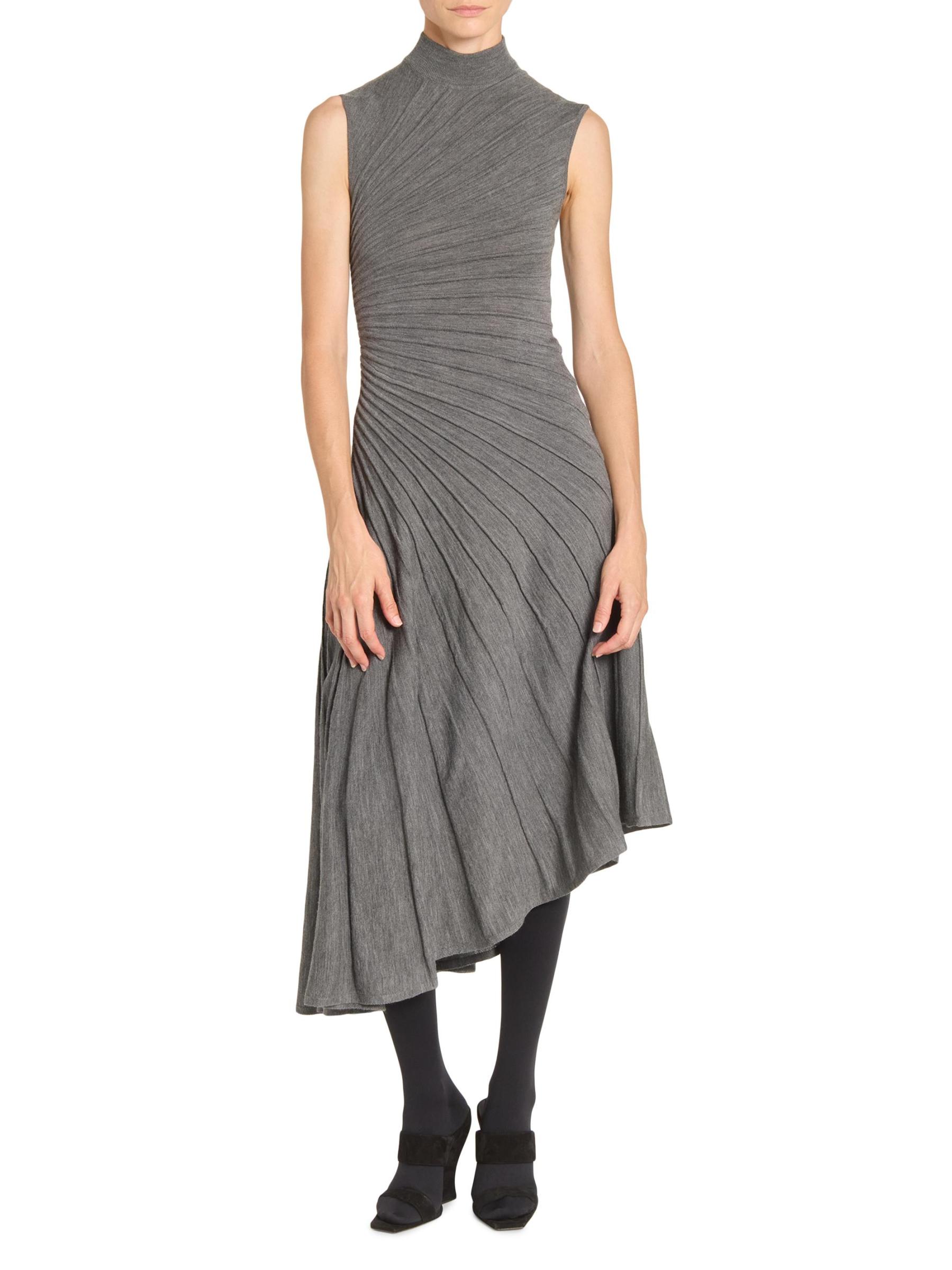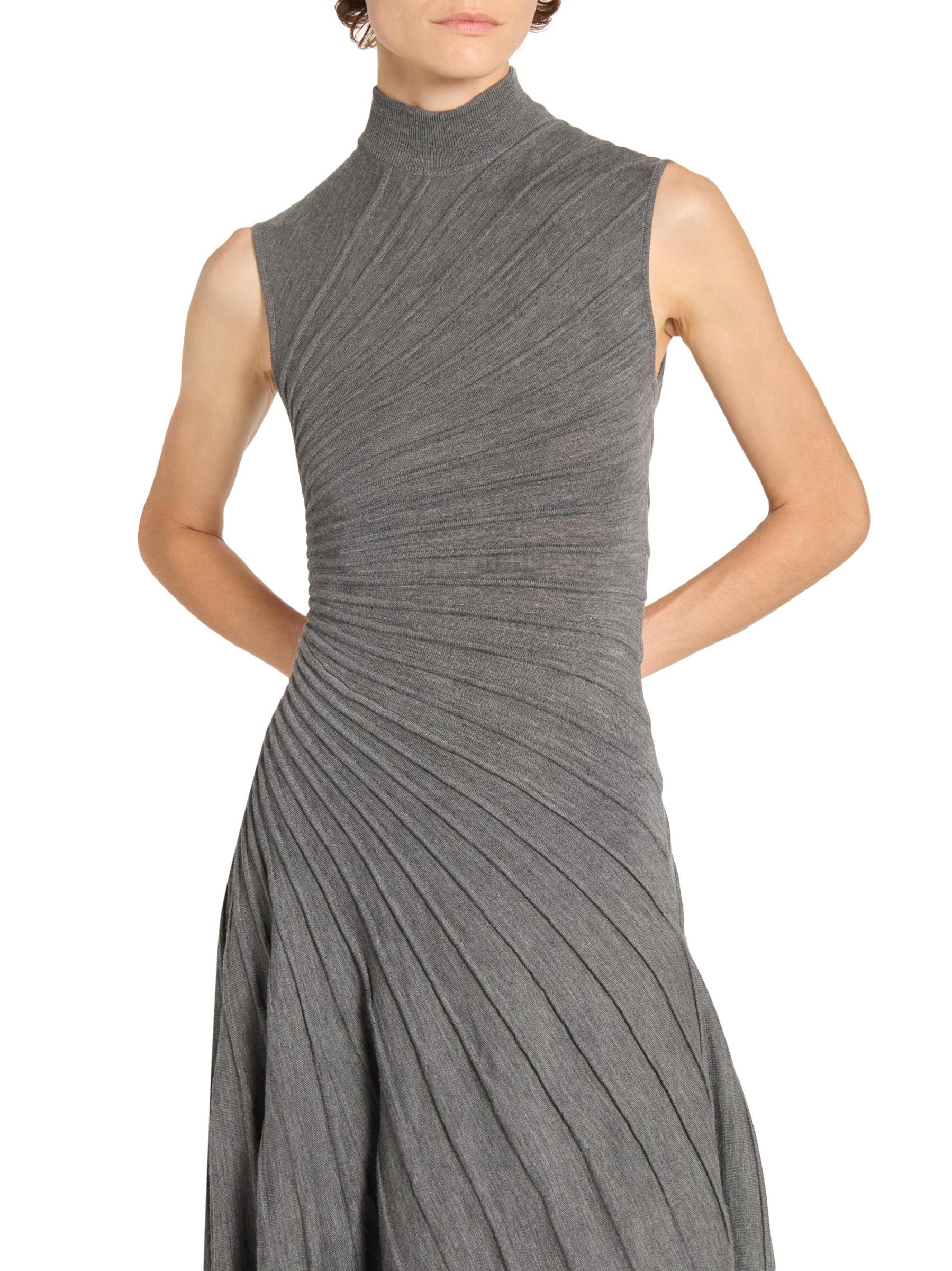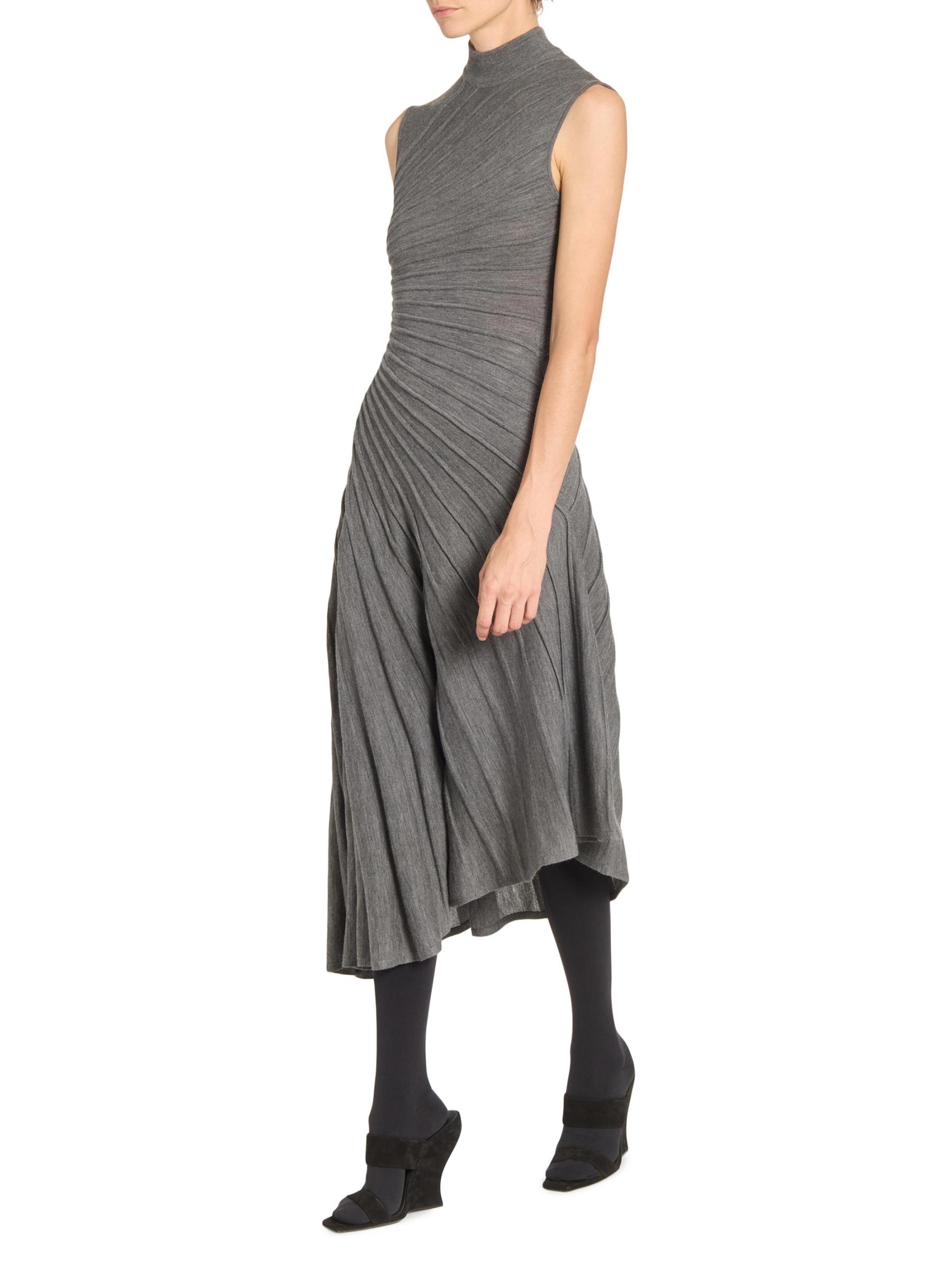 Knit from wool, this Ray sleeveless midi-dress from Alaïa is designed with an A-line silhouette, a mock turtleneck, and an asymmetric hemline. The piece is defined by precise pleating that radiates across the bodice and flows into the skirt, creating a sculpted effect.Mock turtleneck Sleeveless Pulls over 100% wool Dry clean Made in Italy