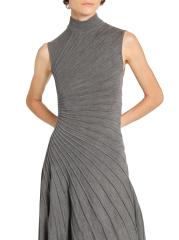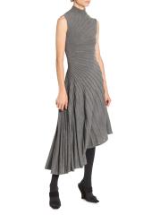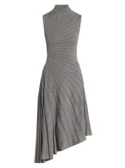 Knit from wool, this Ray sleeveless midi-dress from Alaïa is designed with an A-line silhouette, a mock turtleneck, and an asymmetric hemline. The piece is defined by precise pleating that radiates across the bodice and flows into the skirt, creating a sculpted effect.