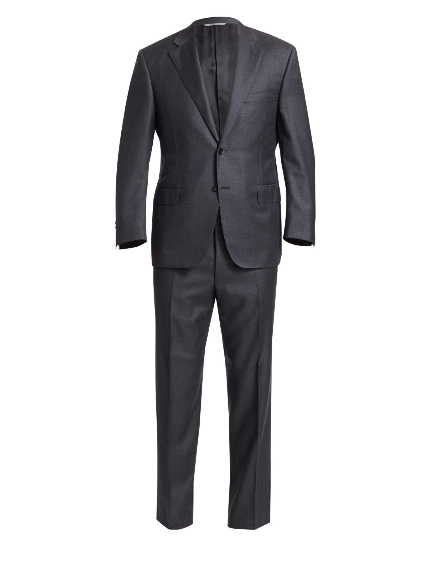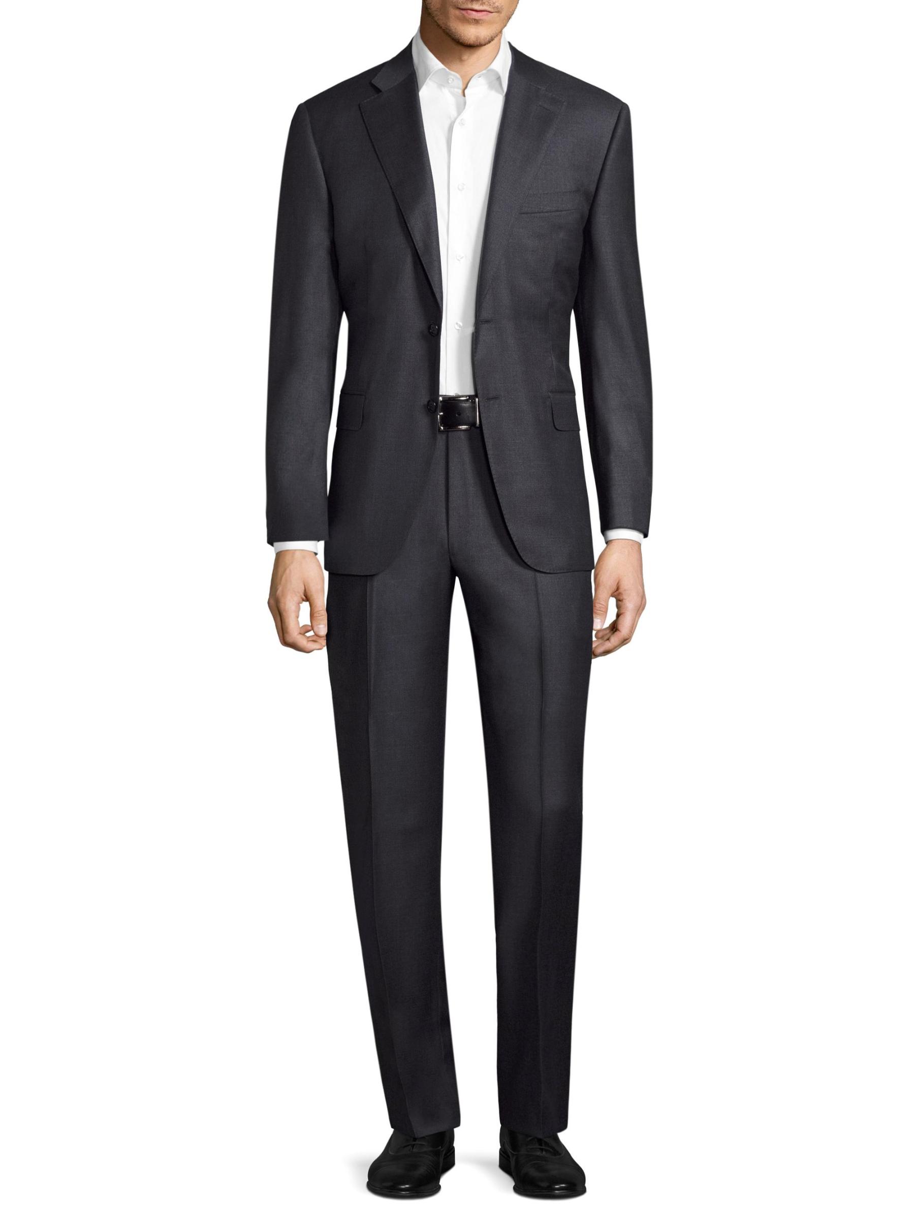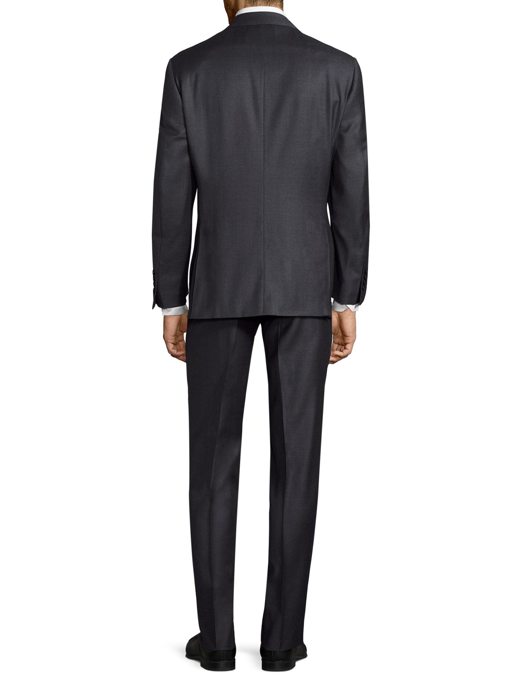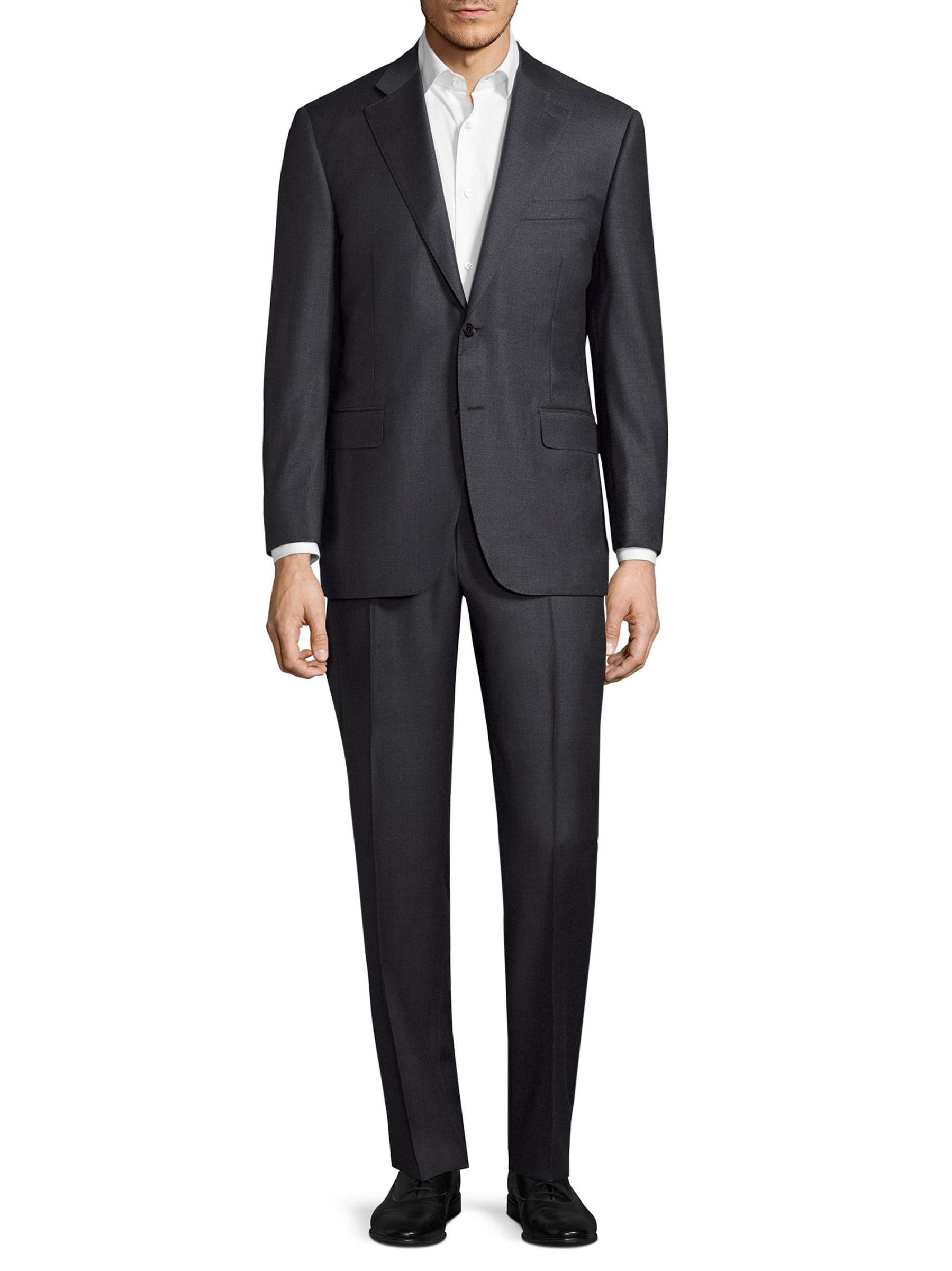 Handsome solid wool suit exudes a suave appeal. Wool. Dry clean. Made in Italy.