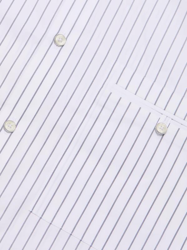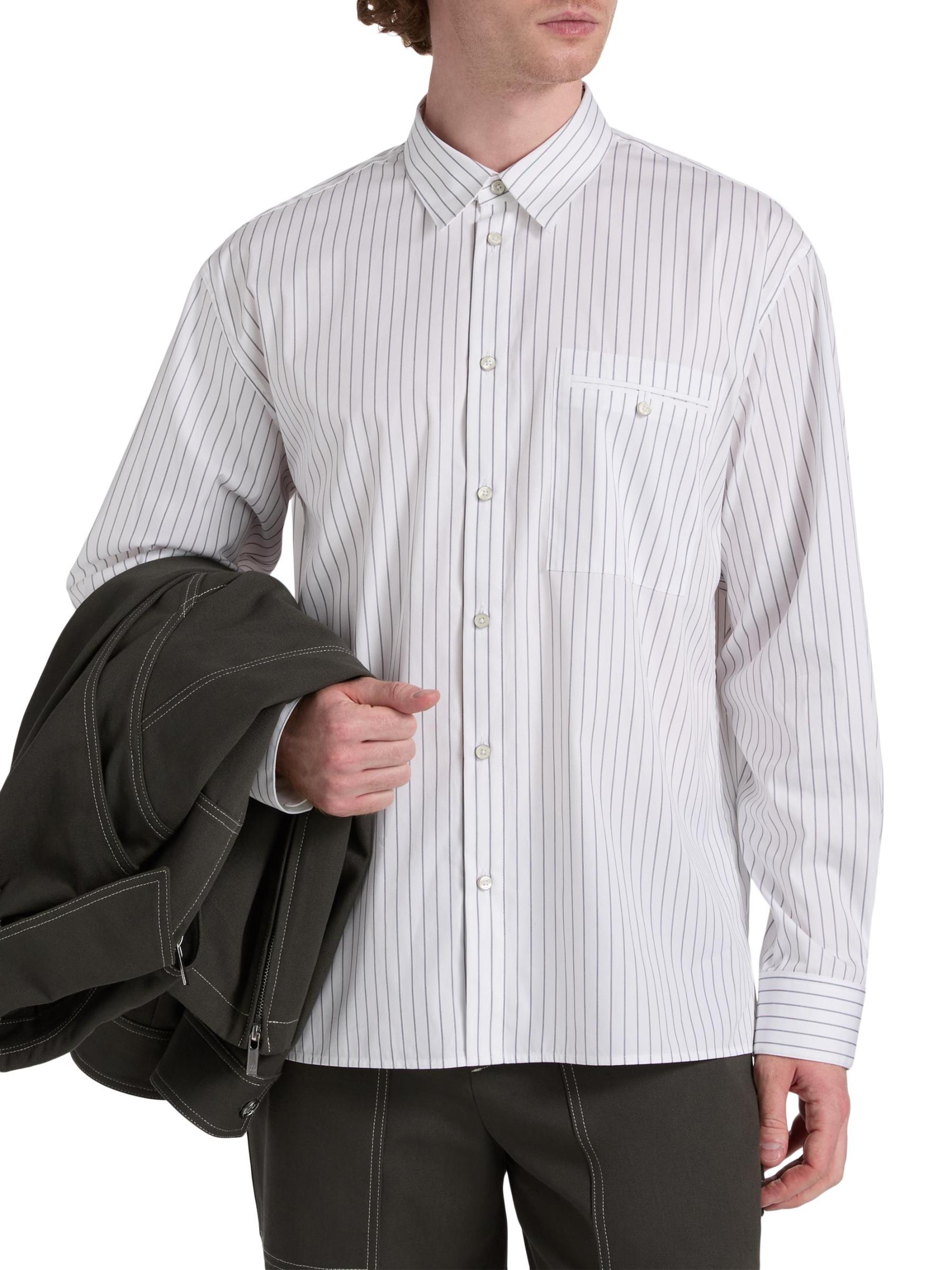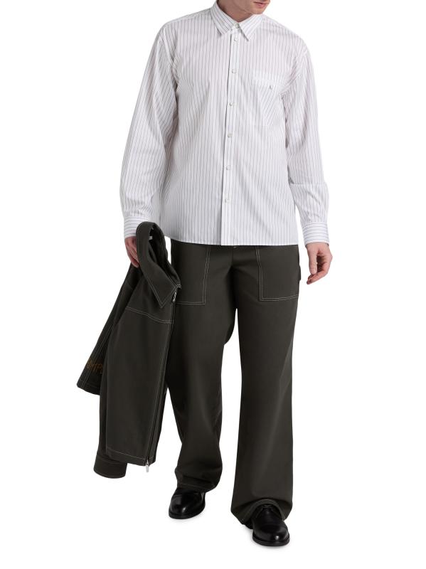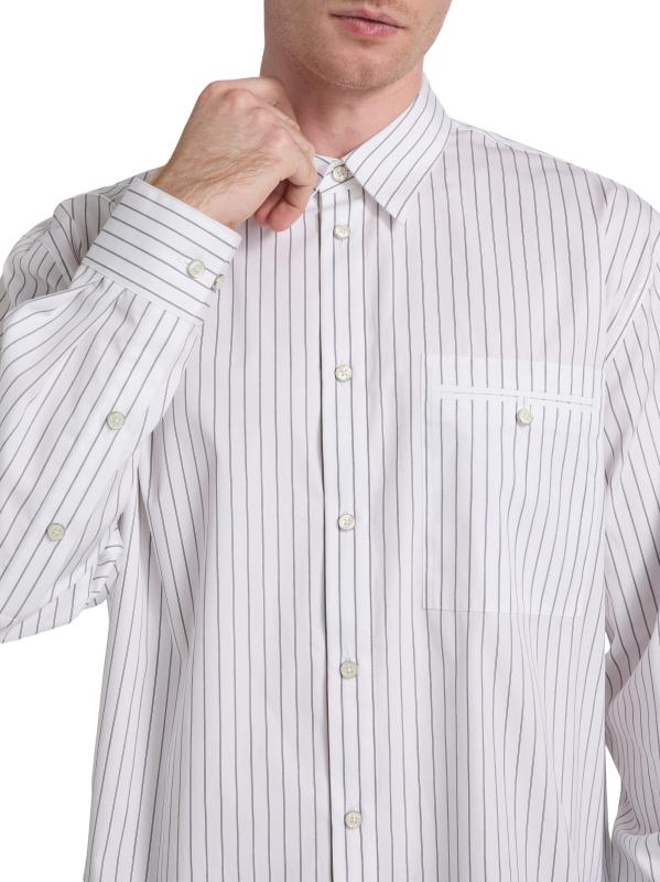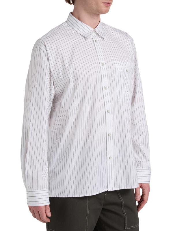 Cut for a relaxed fit, this Helmut Lang shirt is crafted of a cotton-blend poplin and detailed with a pinstripe. A point collar, button barrel cuffs, and a chest button-through pocket lend traditional structure to this button-front style.