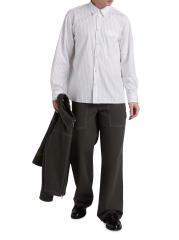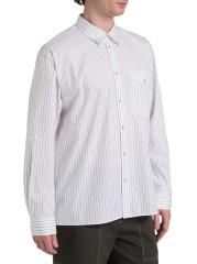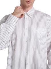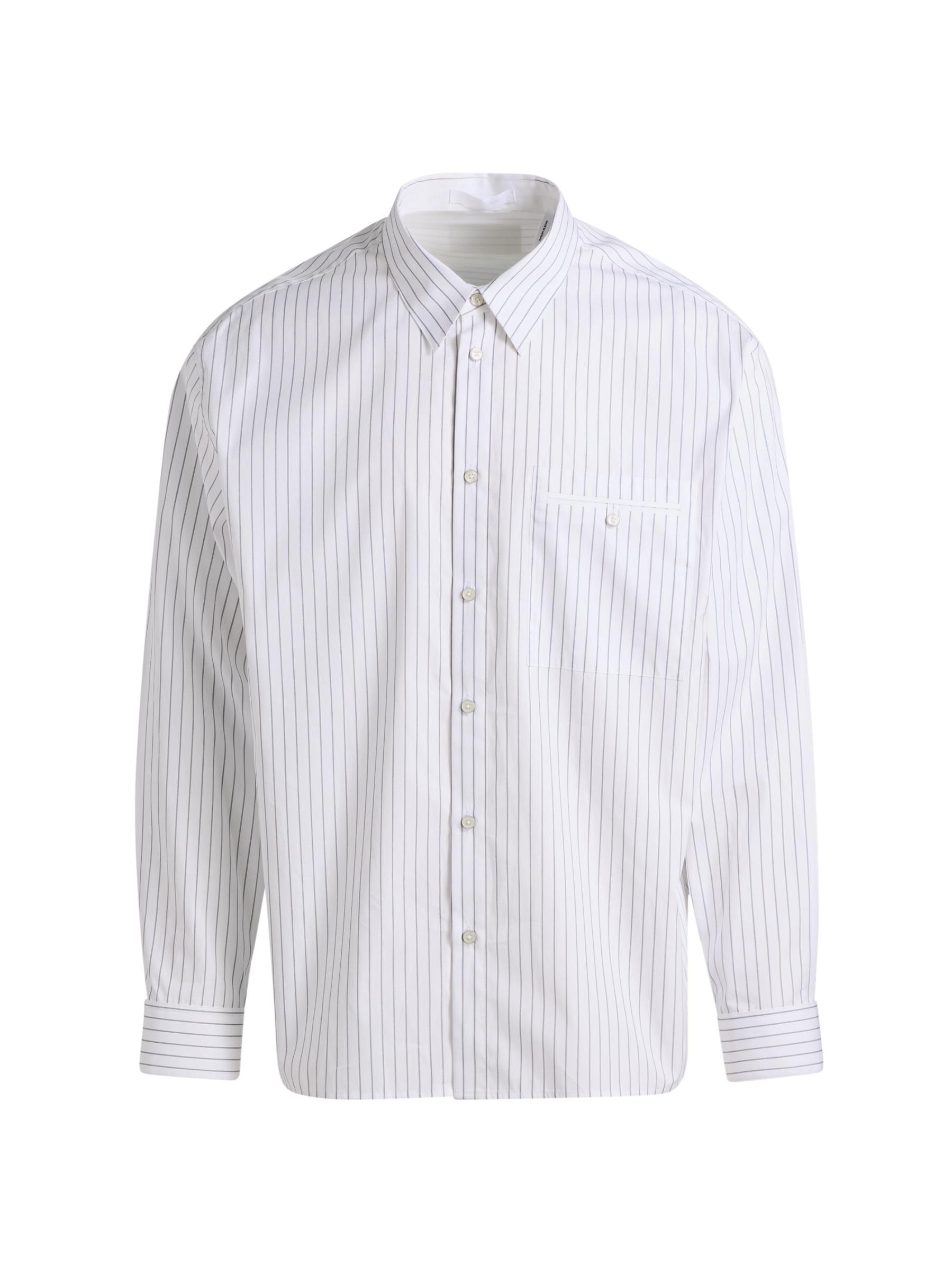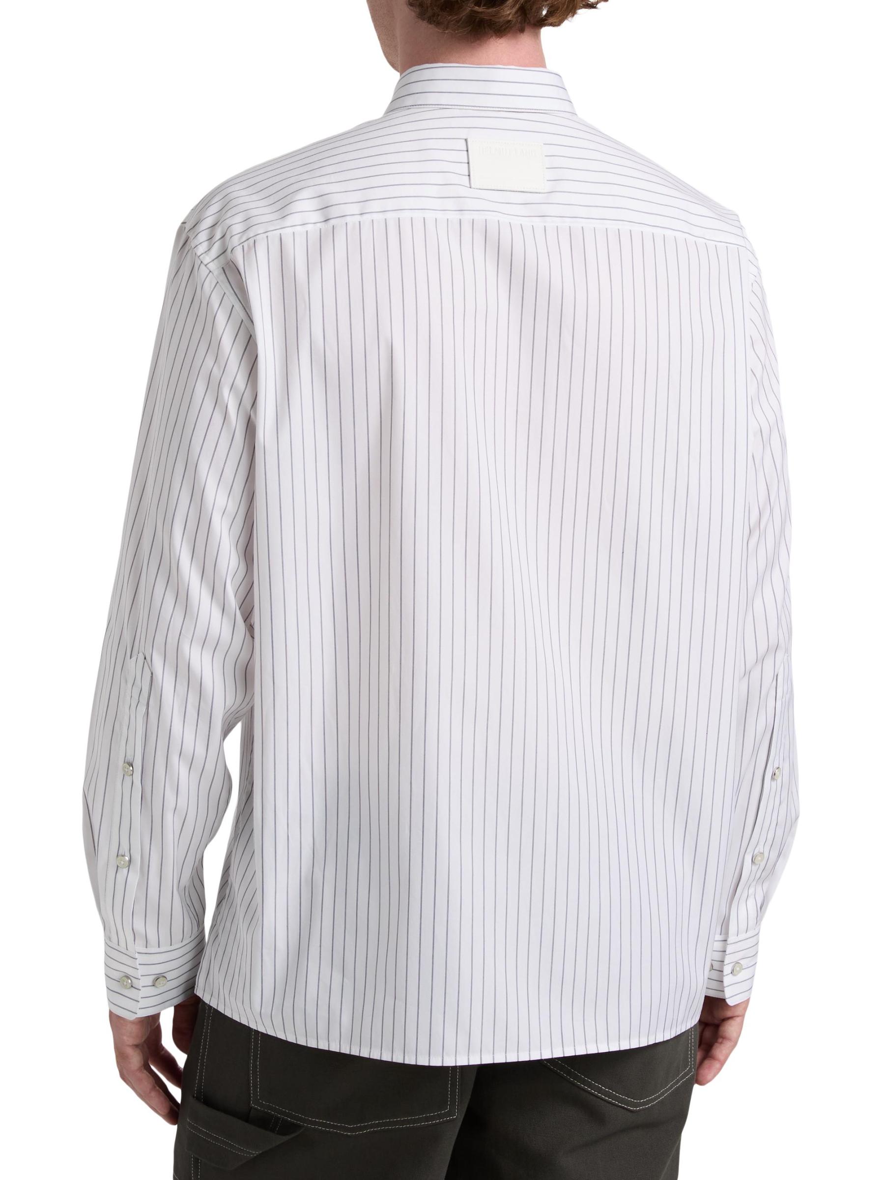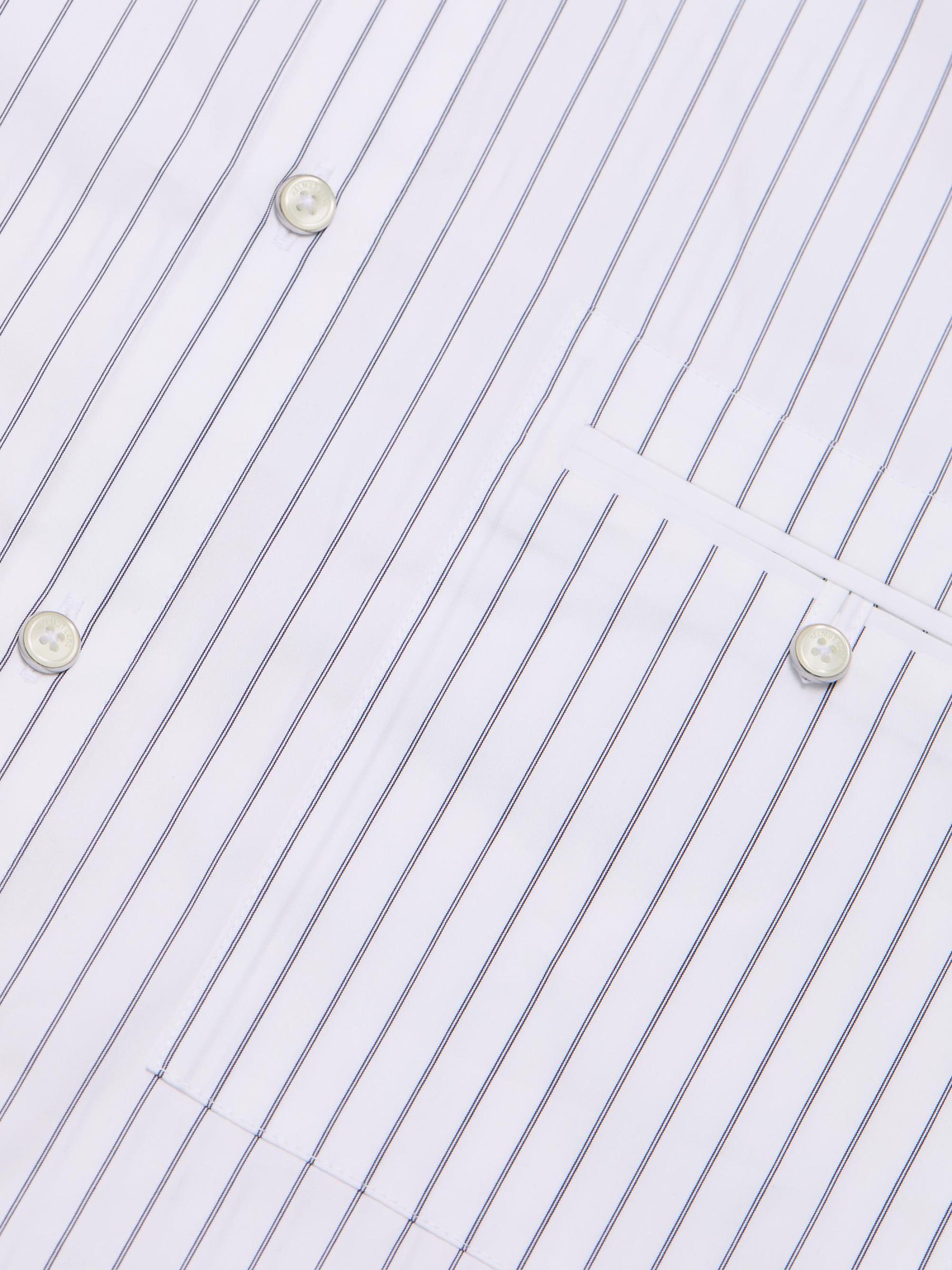 Cut for a relaxed fit, this Helmut Lang shirt is crafted of a cotton-blend poplin and detailed with a pinstripe. A point collar, button barrel cuffs, and a chest button-through pocket lend traditional structure to this button-front style.Point collar Long sleeves, button barrel cuffs Chest button-through patch pocket Button front closure 87% cotton/13% polyester Dry clean Imported