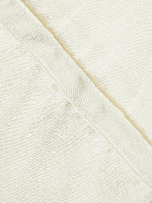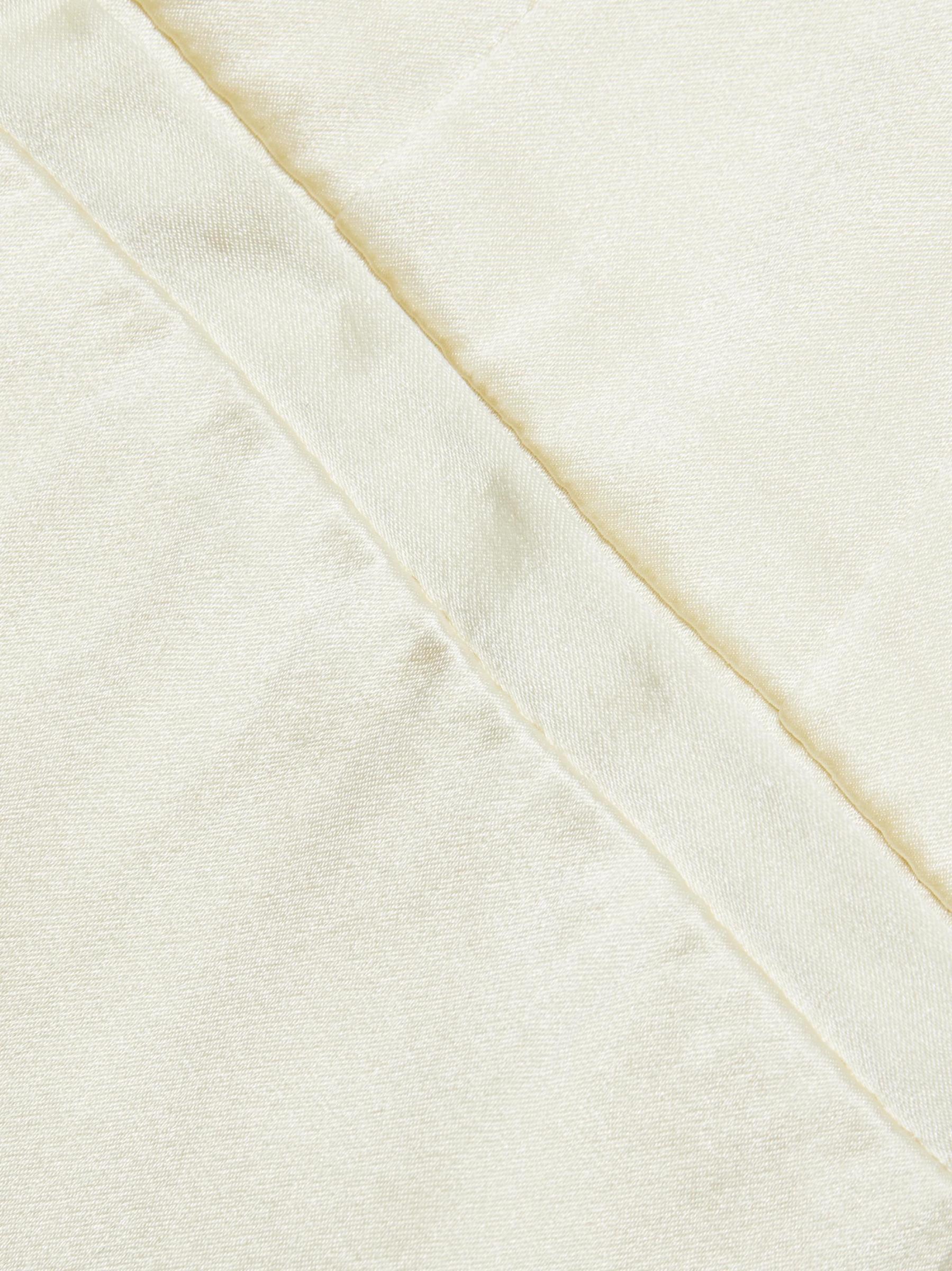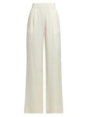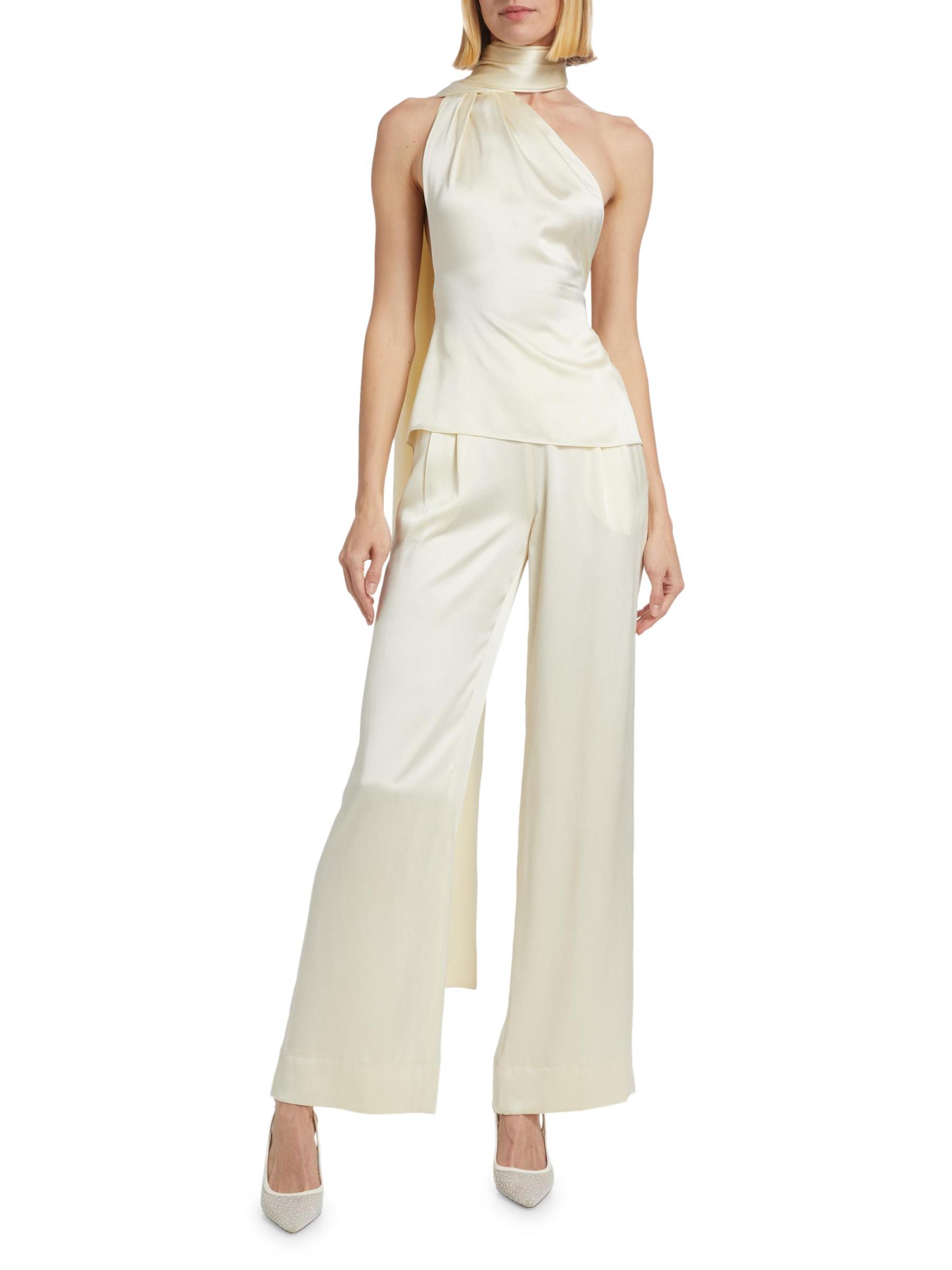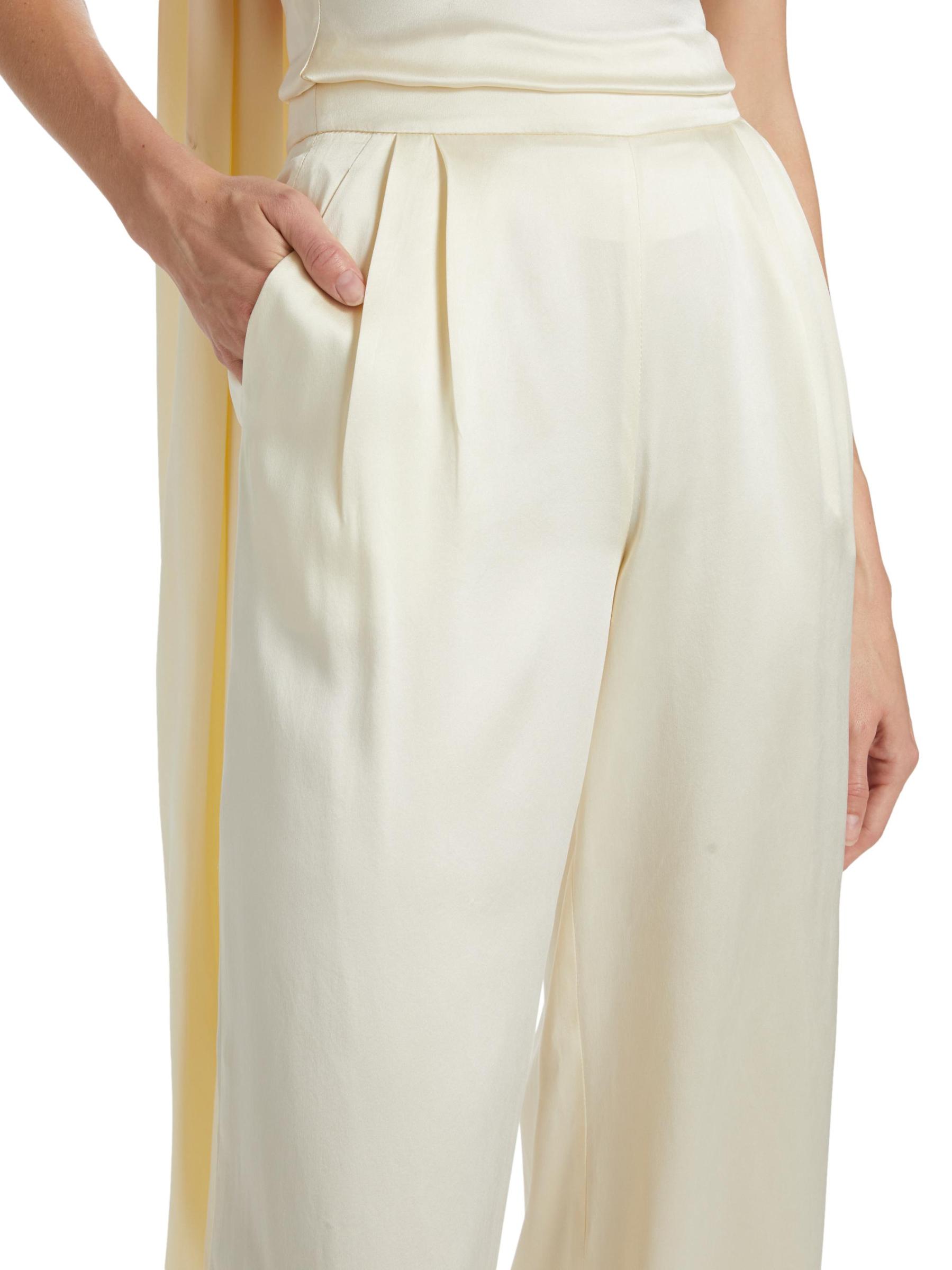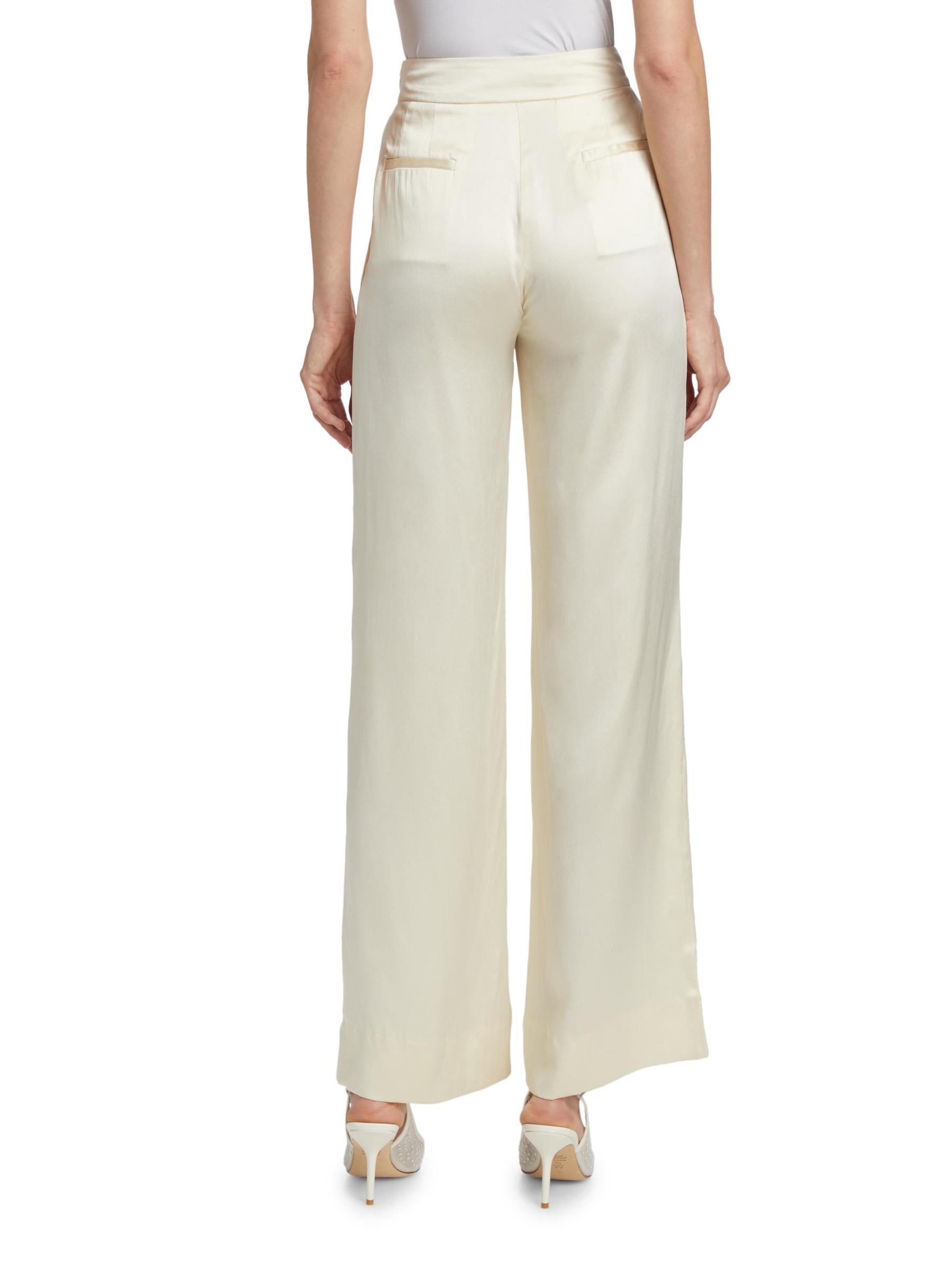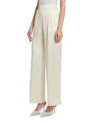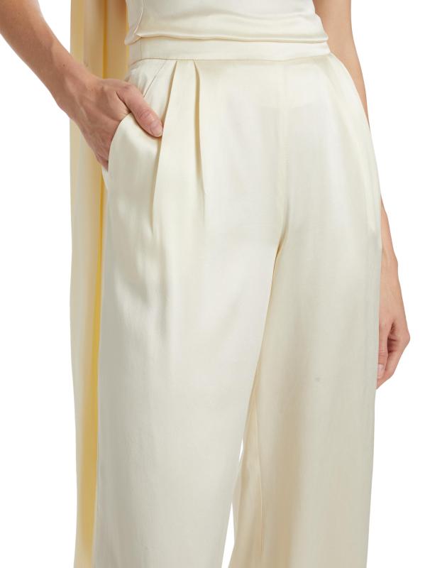 LaQuan Smith's collection showcases daring, provocative designs with figure-hugging dresses and high-cut bodysuits that define the brand's signature style. Inspired by powerful female icons of the 1980s and Studio 54 era, each piece exudes strength and glamour. Crafted of silk charmeuse, these high-rise trousers showcase a wide-leg silhouette and convenient side pockets.