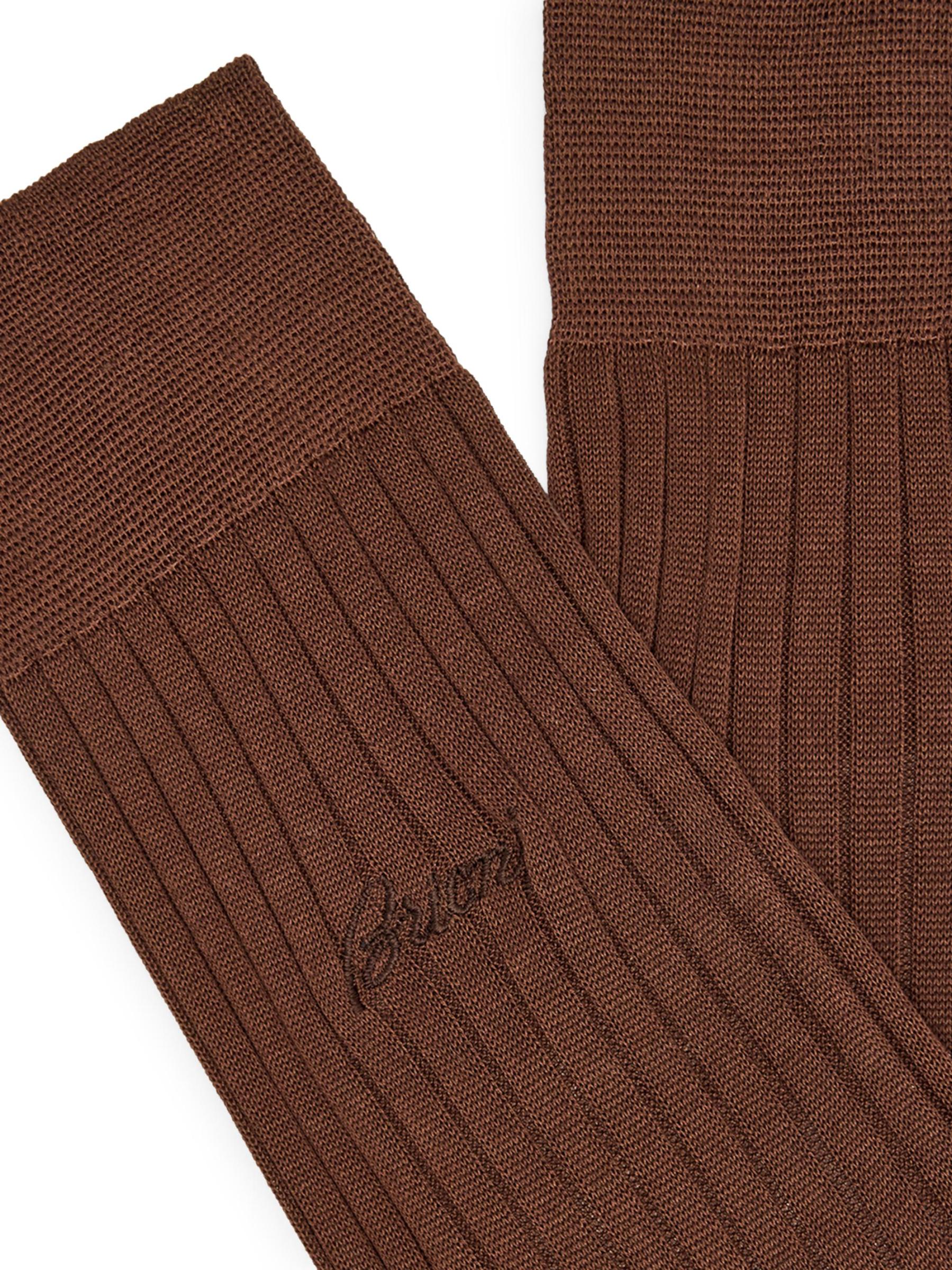 These Brioni crew socks are crafted of a cotton rib-knit, detailed with a tonal embroidered logo signature.