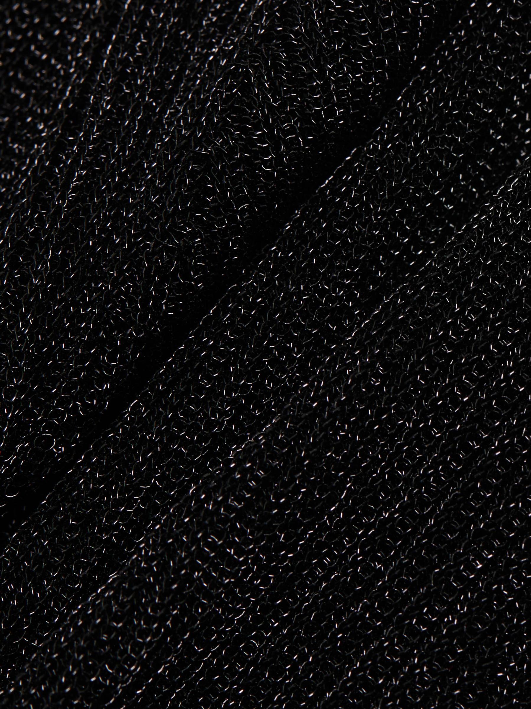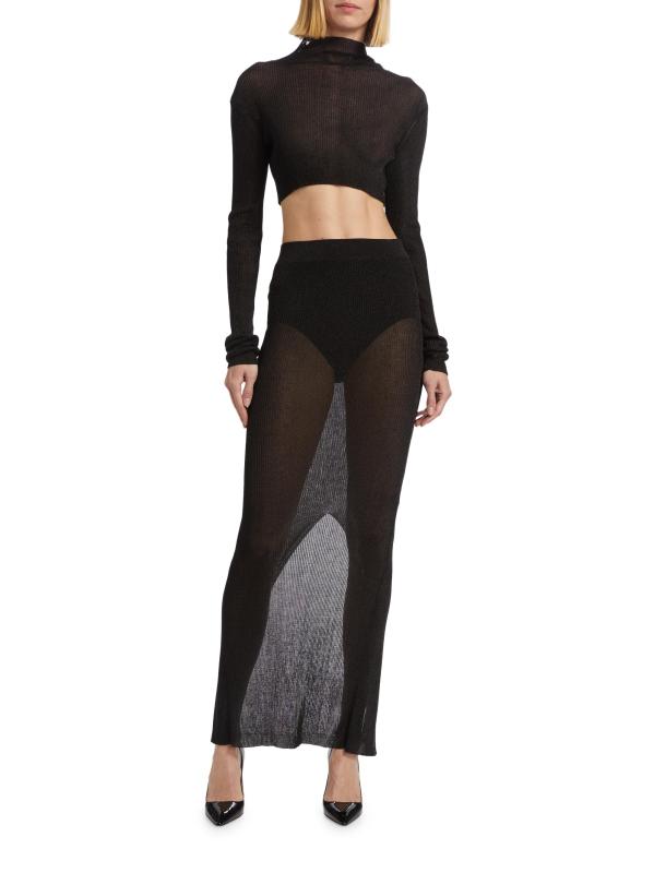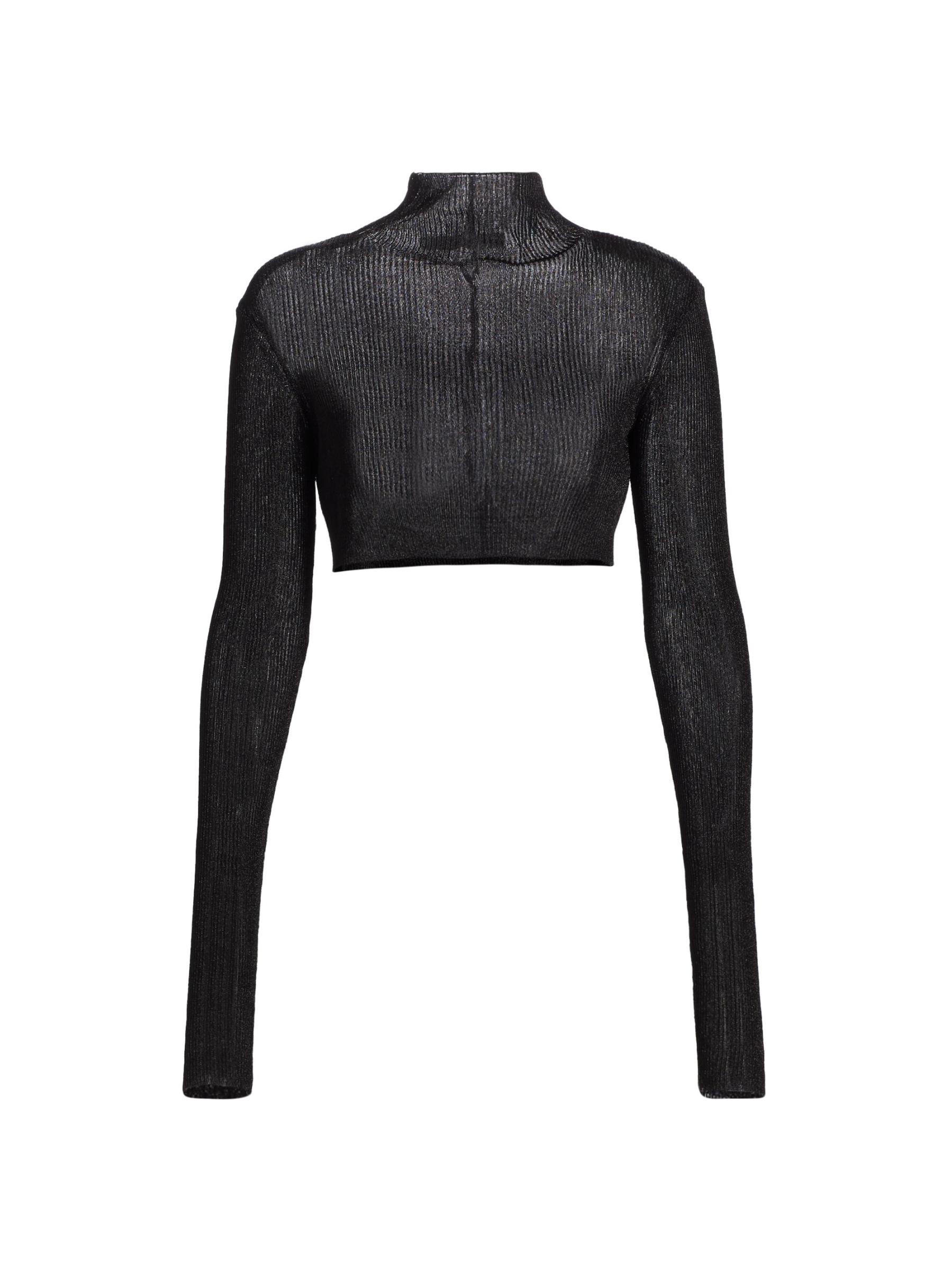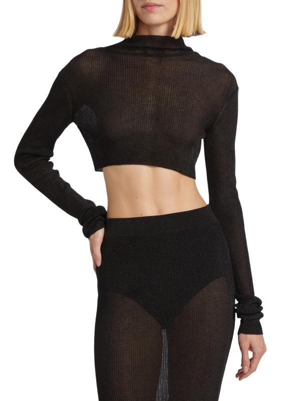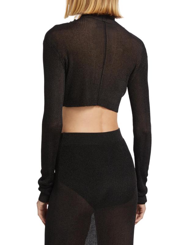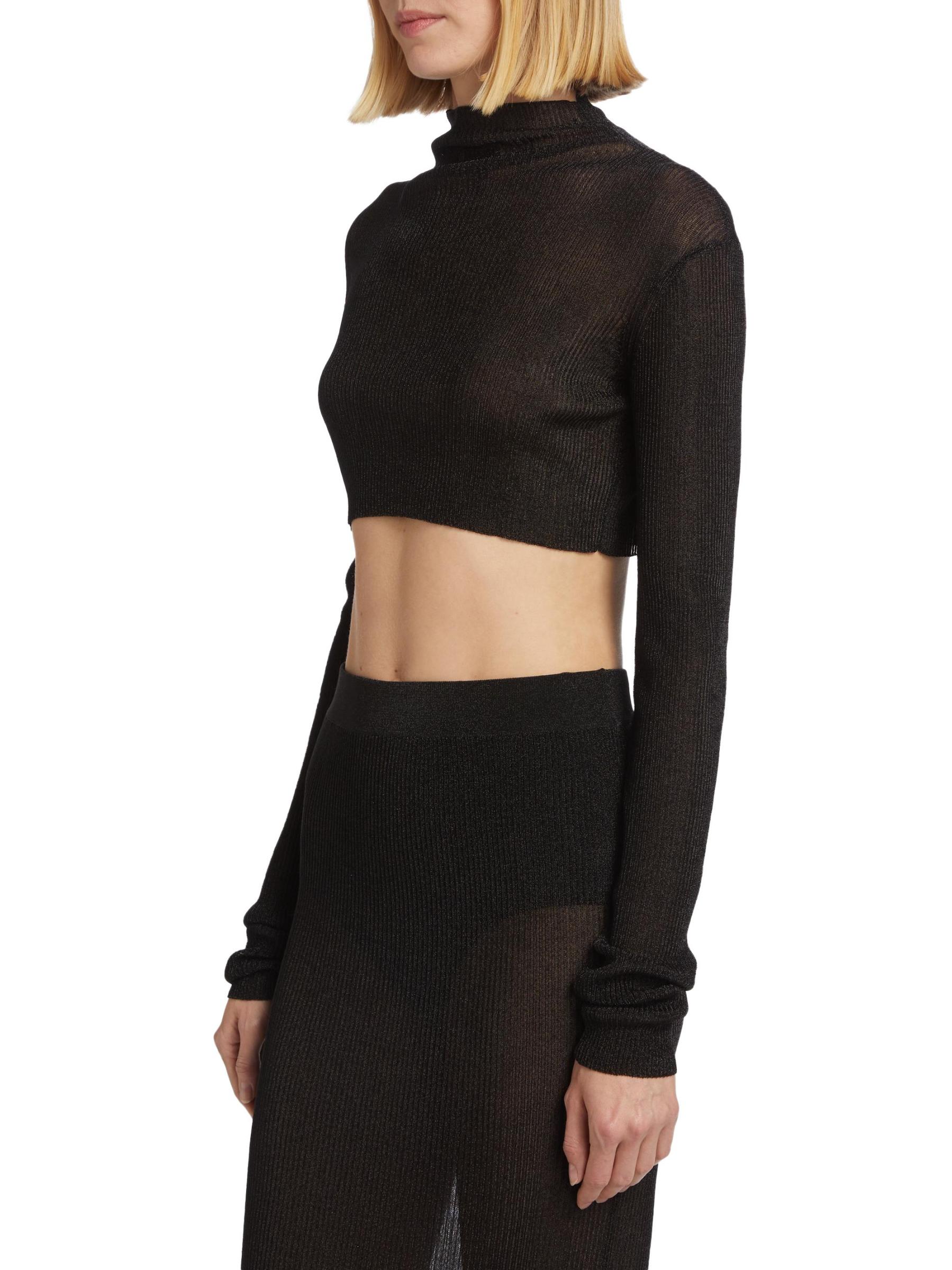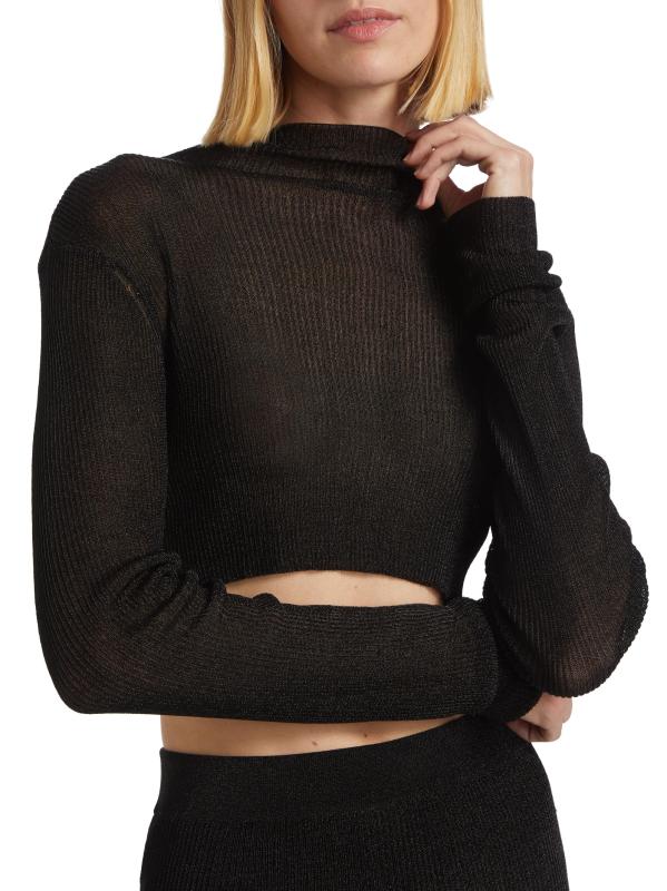 LaQuan Smith's collection showcases daring, provocative designs with figure-hugging dresses and high-cut bodysuits that define the brand's signature style. Inspired by powerful female icons of the 1980s and Studio 54 era, each piece exudes strength and glamour. Cut in a cropped silhouette, this mock turtleneck top showcases a stretchy semi-sheer rib-knit and metallic finish.