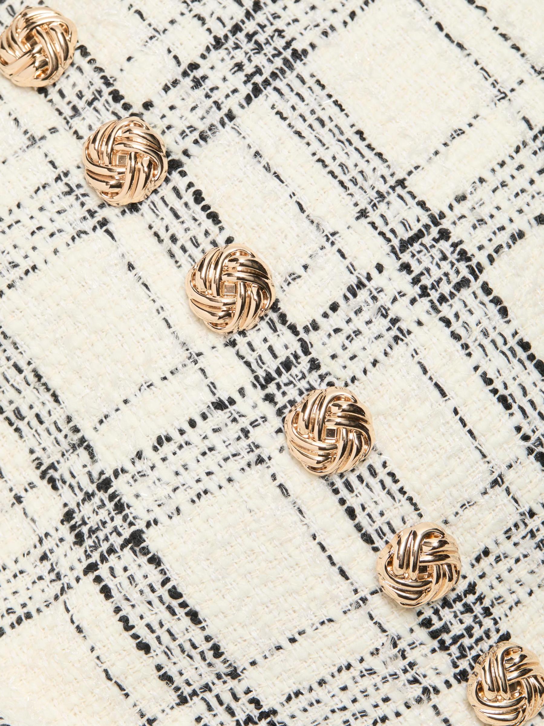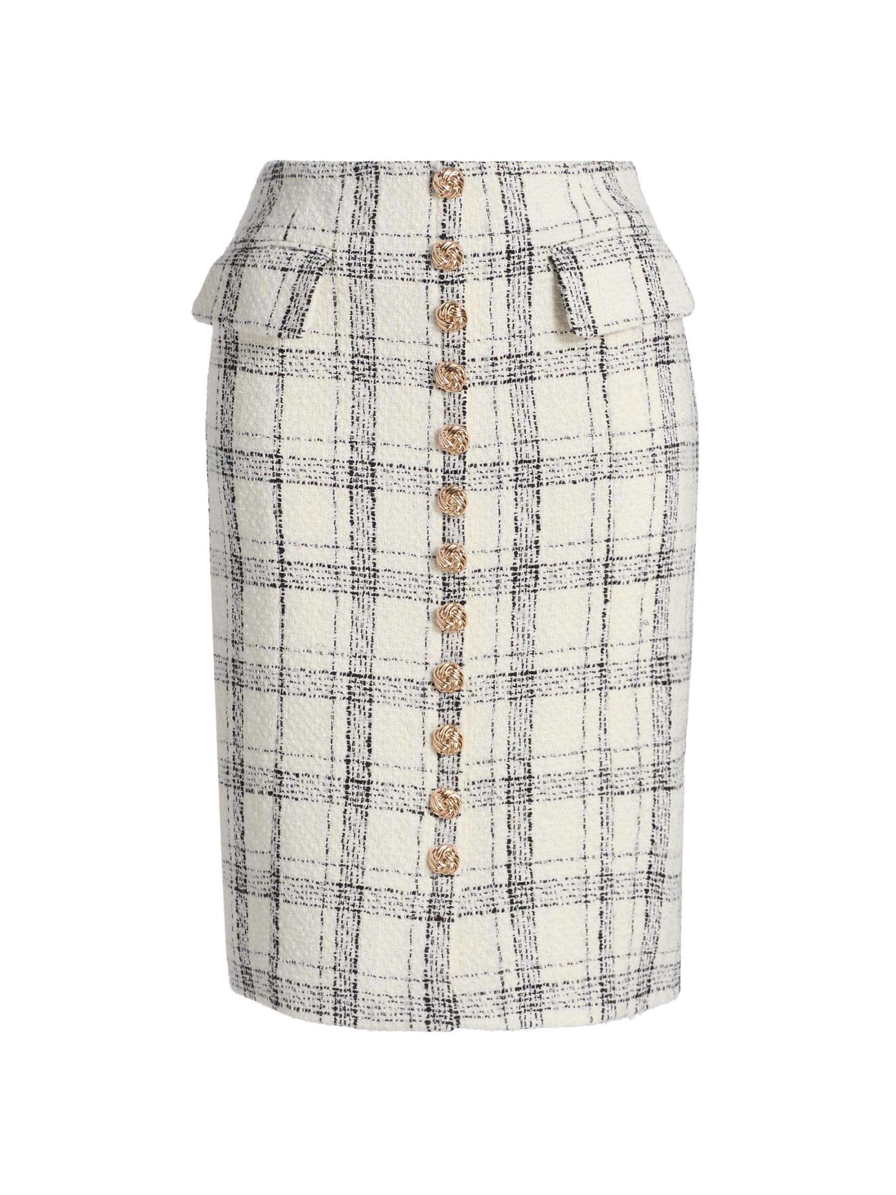 The Riley knee-length skirt from Generation Love features a metallic tweed design with a windowpane pattern.