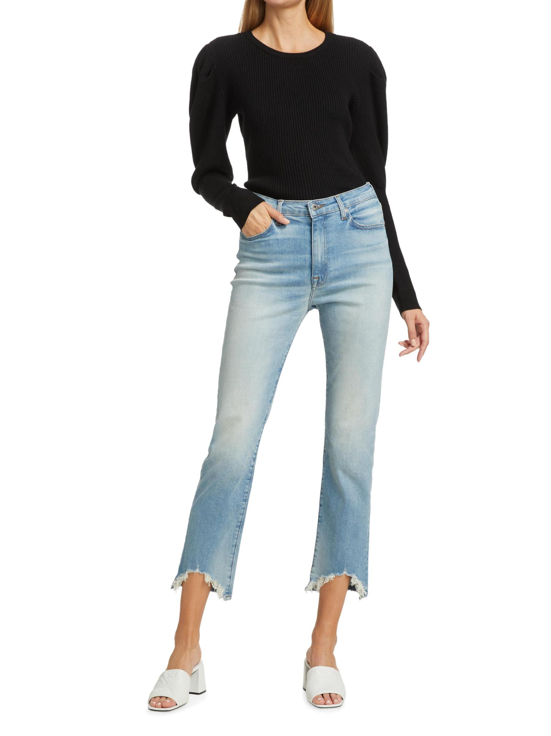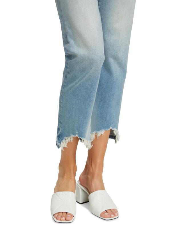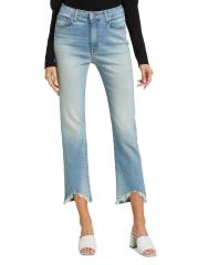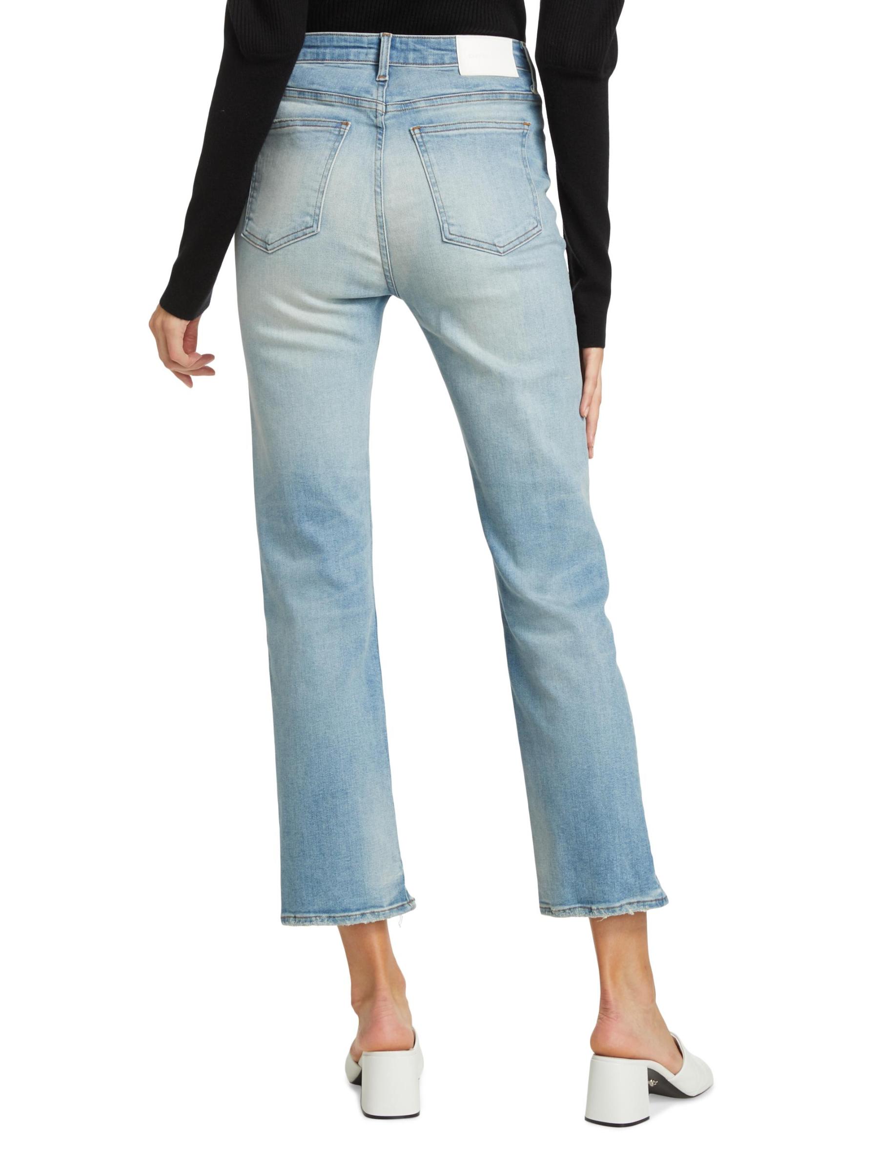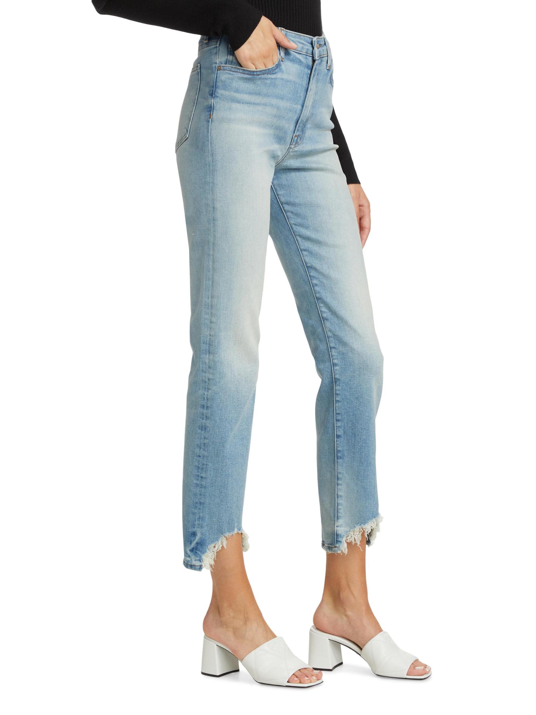 Raw-edge distressed hems completes the look of these high-rise straight-fit jeans.Five-pocket style Zip fly with button closure 98% cotton/2% elastane Machine wash Made in USA