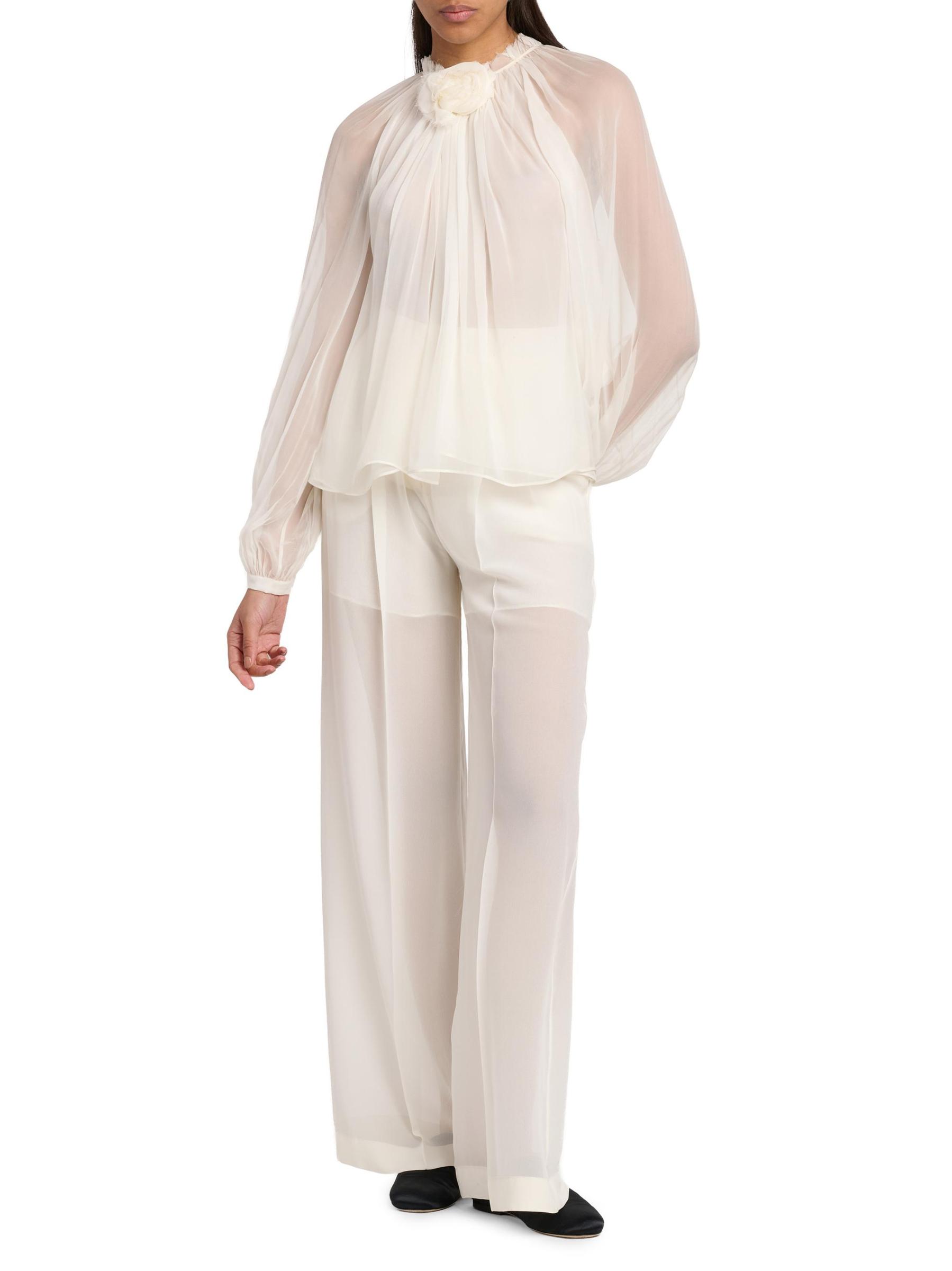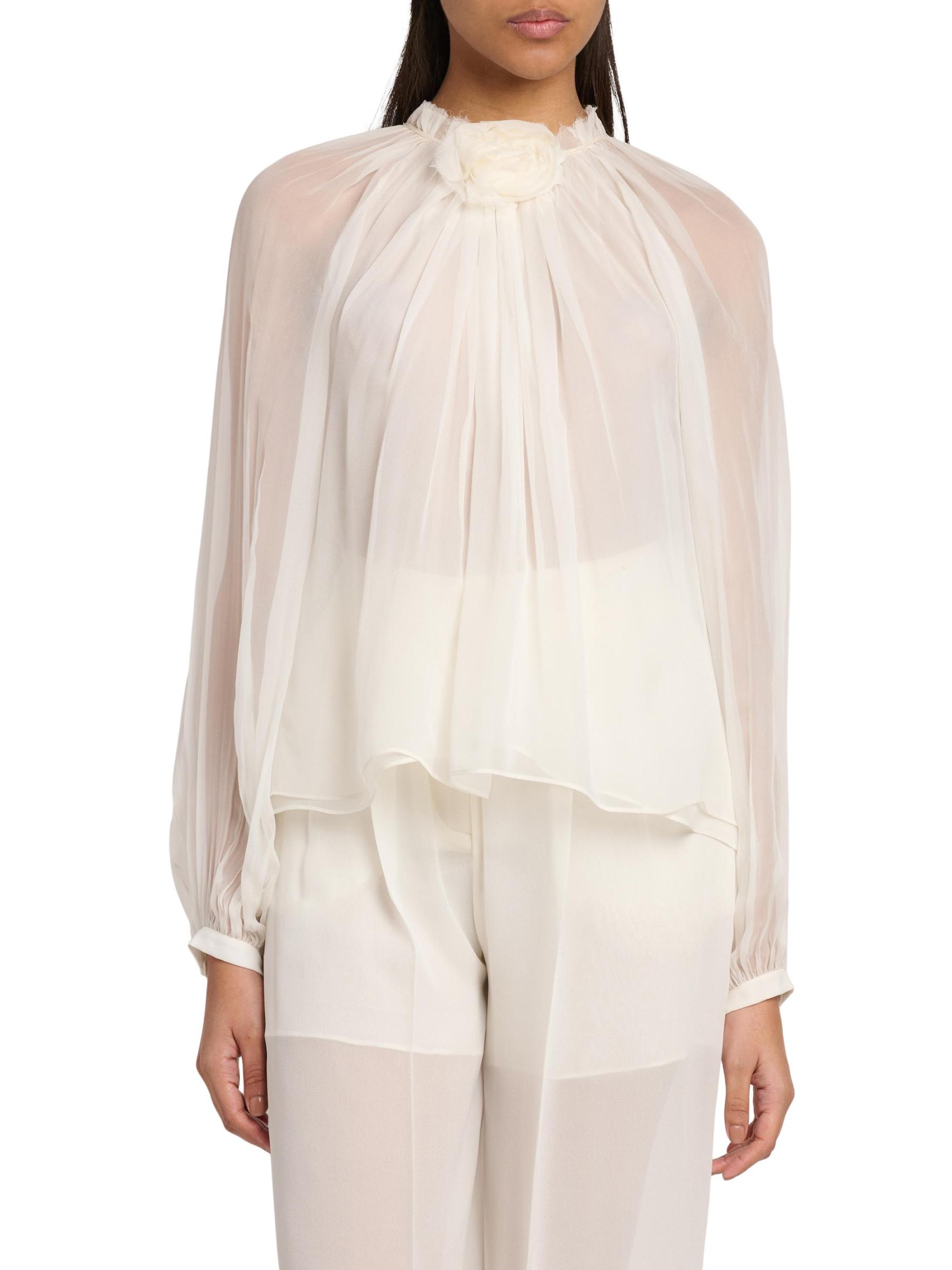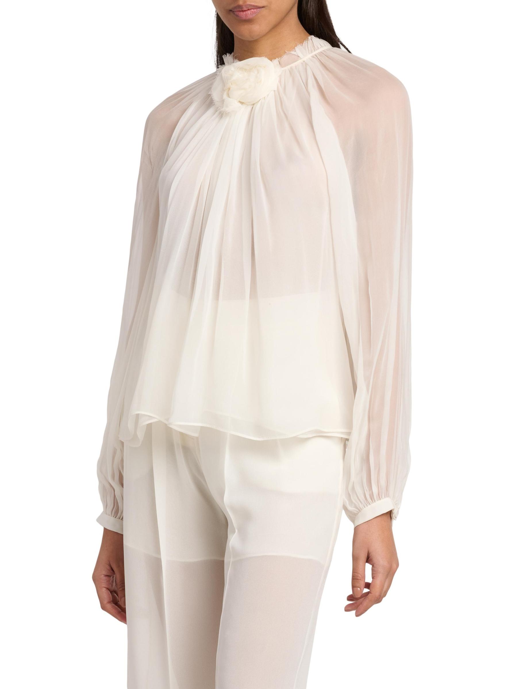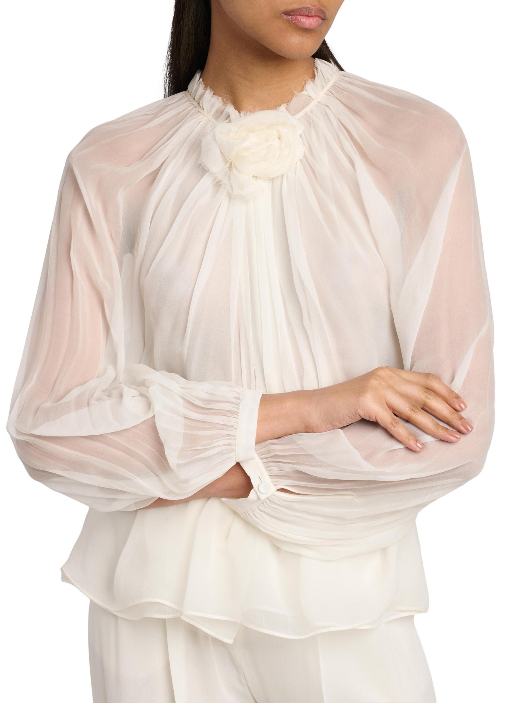 An applied rosette adorns the neckline of this transparent gathered silk blouse from Alberta Ferretti.