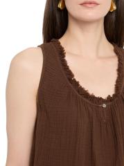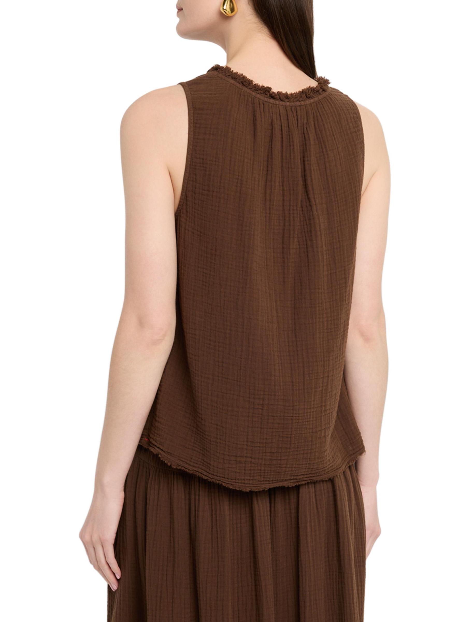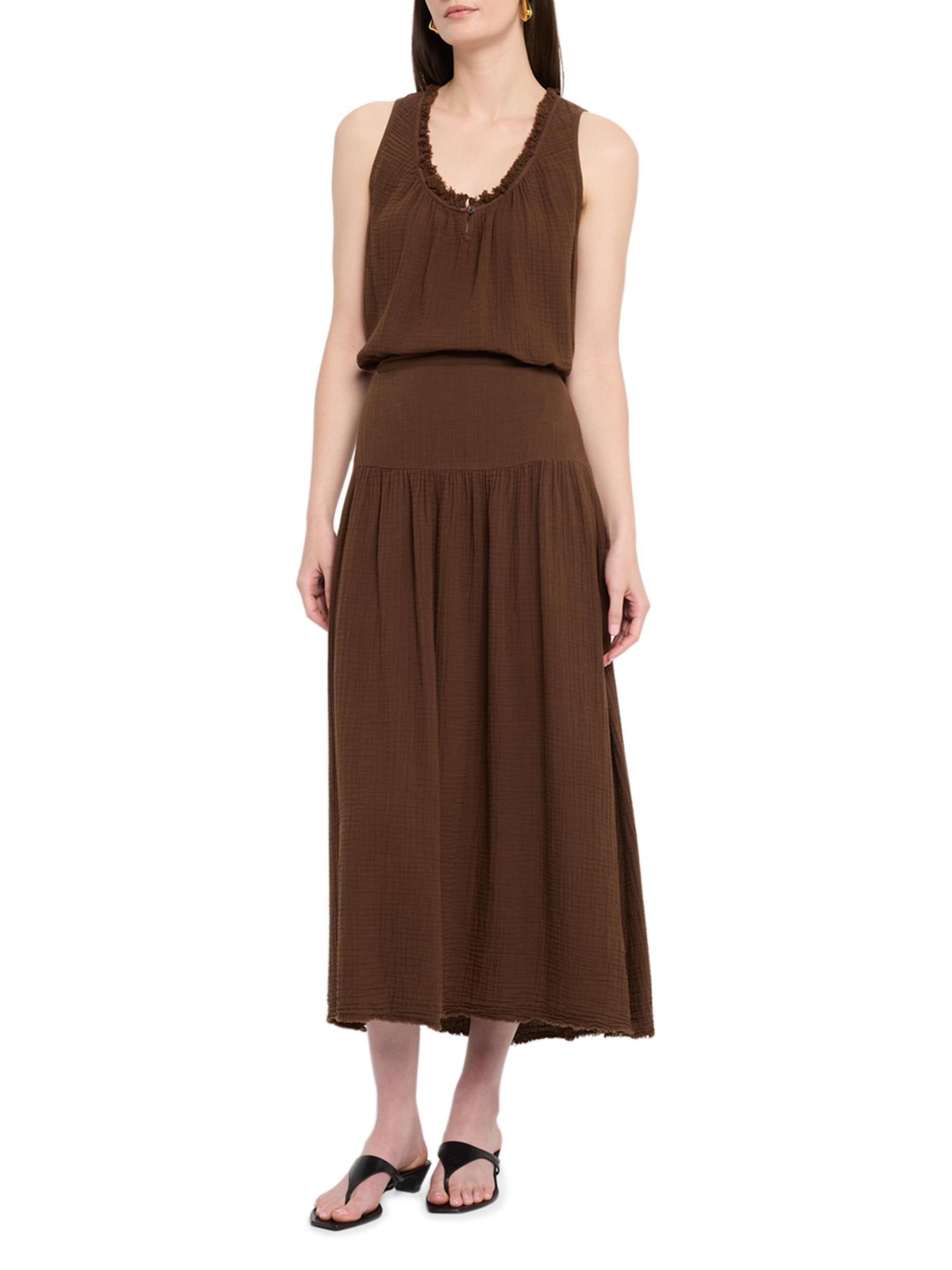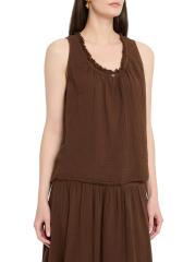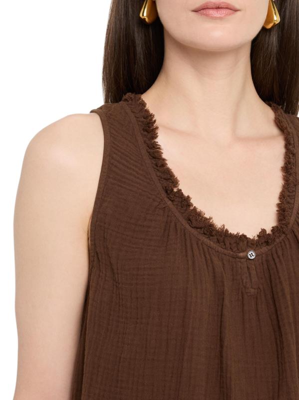 Crafted of cotton gauze, Xirena's Rosie top features fringed ruffle trim at the scoopneck. This sleeveless piece is complete with a keyhole button closure at the front.