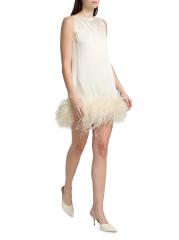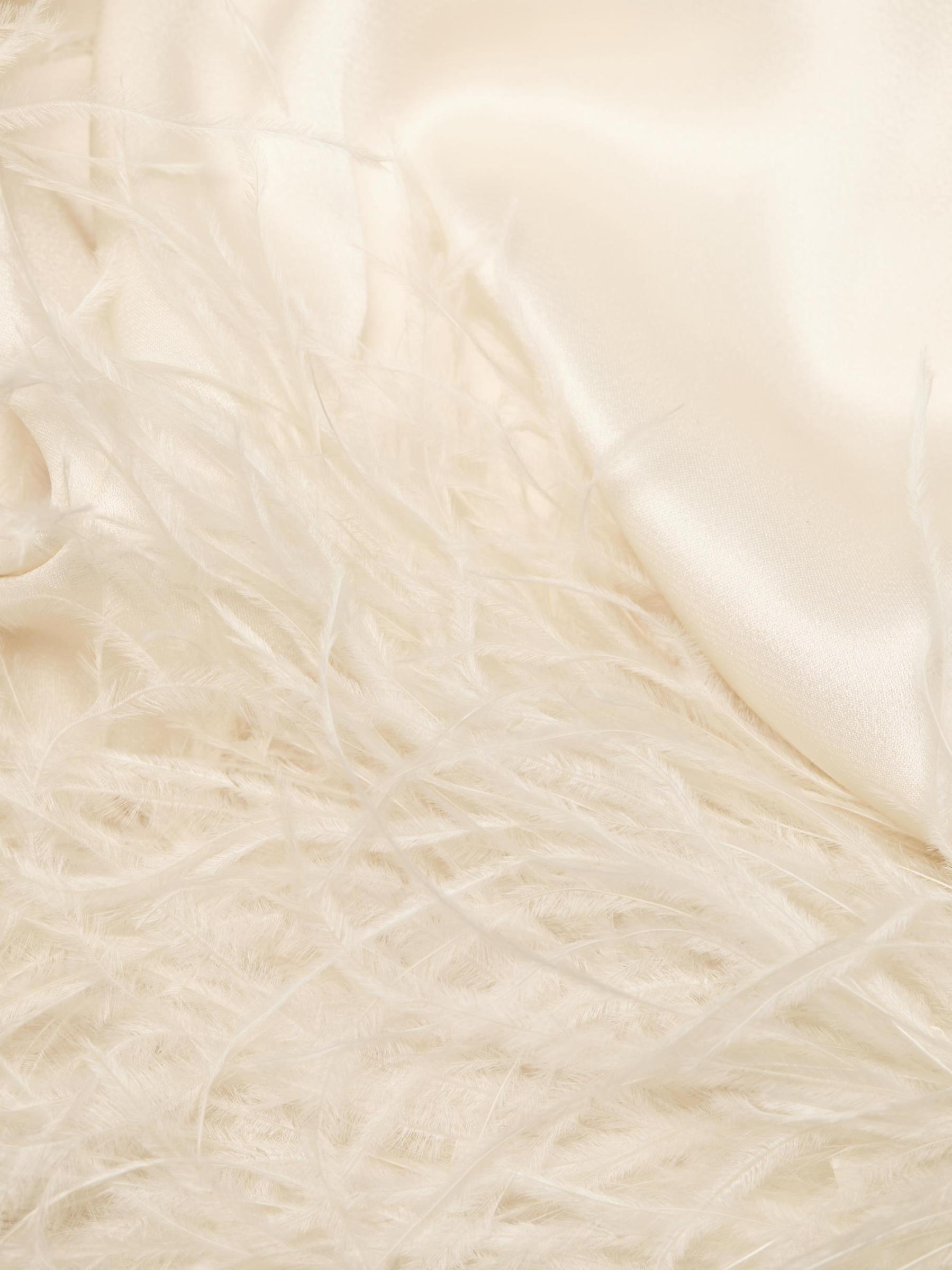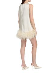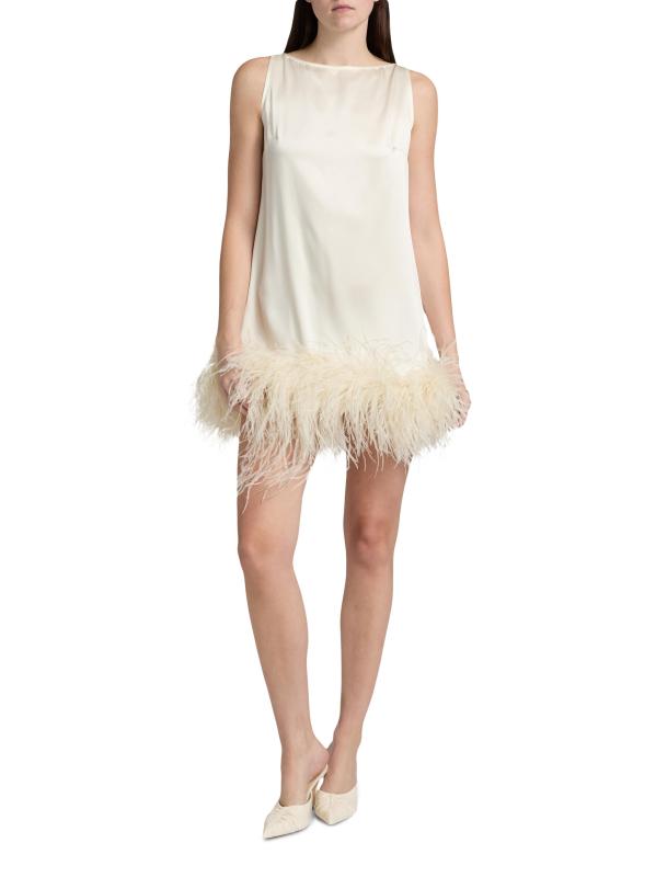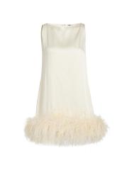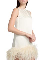 Crafted of satin, this playful shift minidress from LaPointe highlights the hem with a tonal feather trim, adding a fluffy layer to its sleek design. This '60s-inspired style features a bateau neckline and a sleeveless cut.Bateau-neck Sleeveless Feather-trim hem Pulls over 61% acetate/39% viscose Dry clean Made in USA