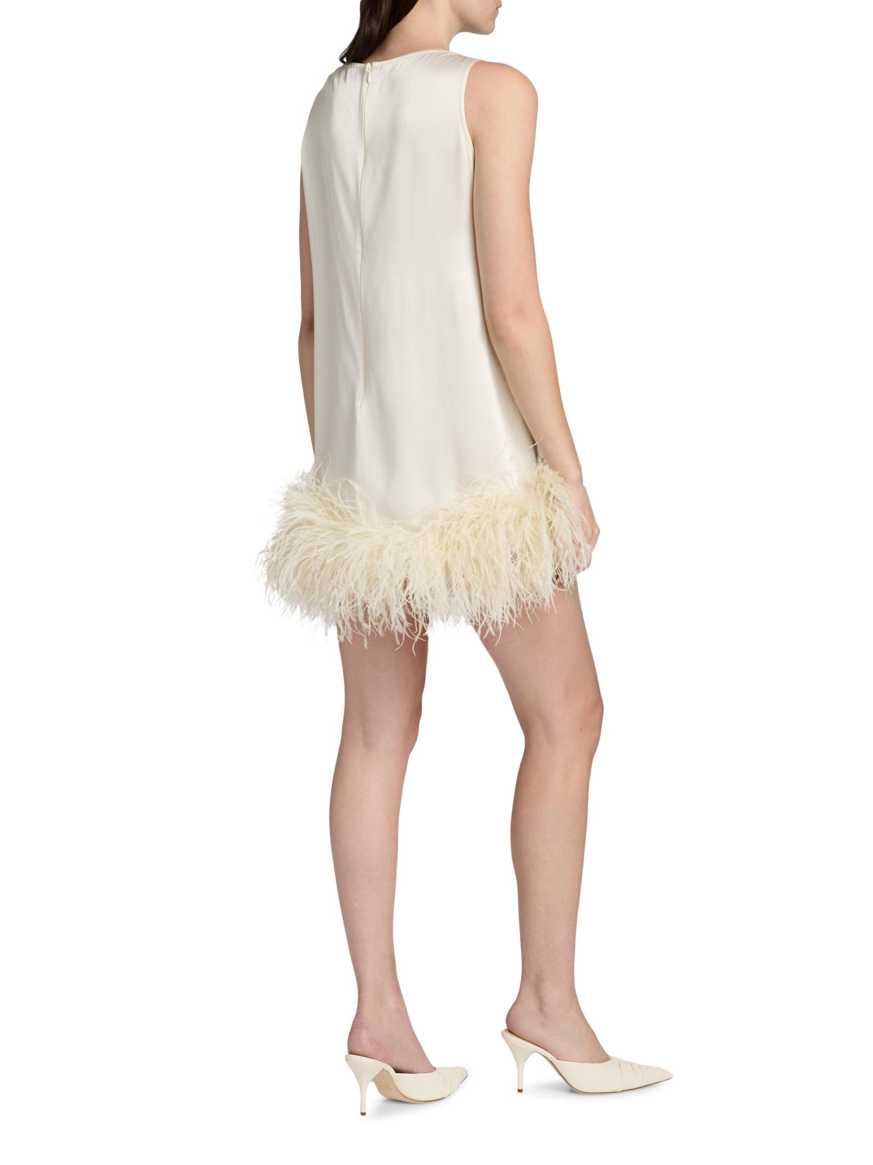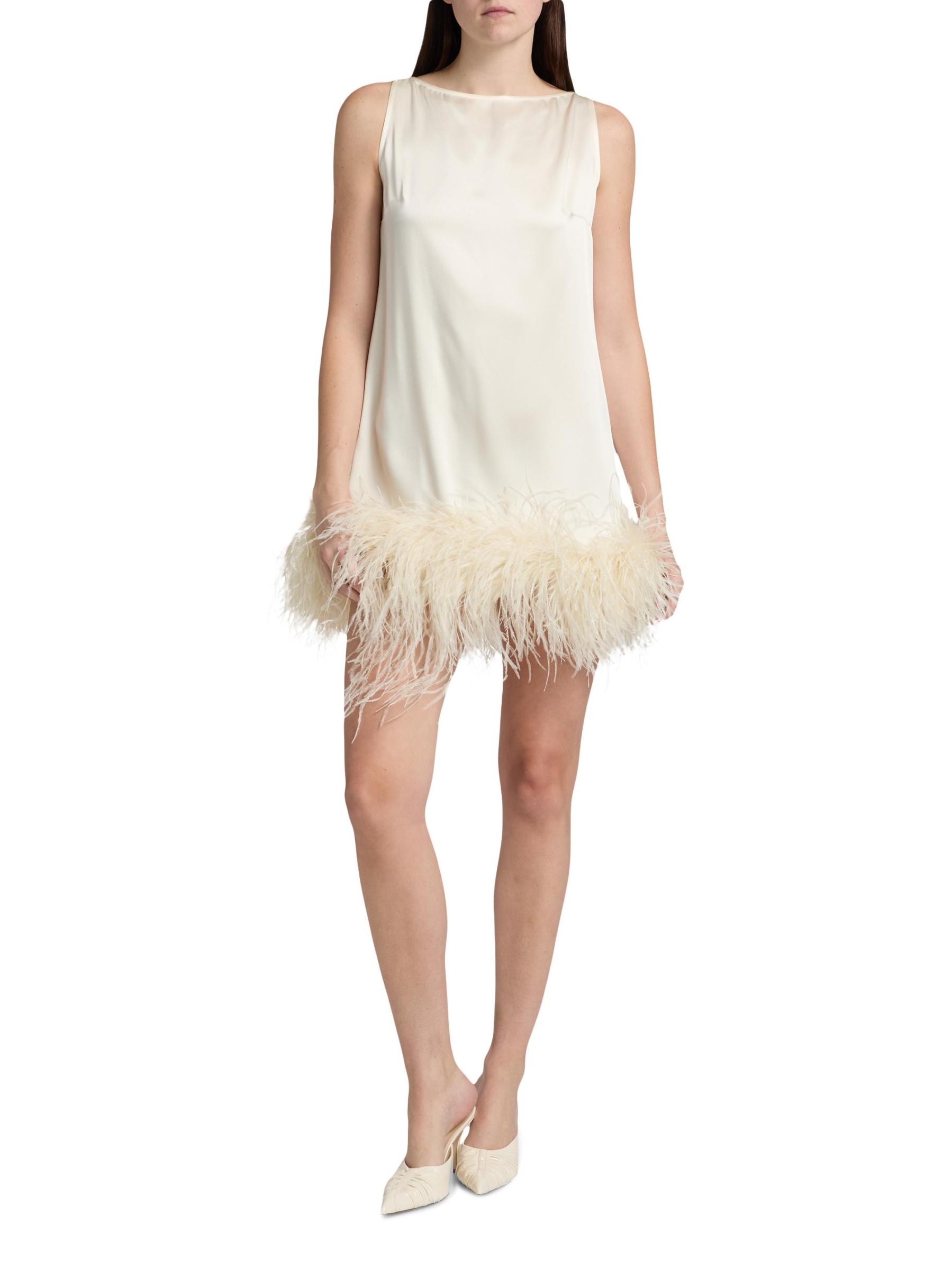 Crafted of satin, this playful shift minidress from LaPointe highlights the hem with a tonal feather trim, adding a fluffy layer to its sleek design. This '60s-inspired style features a bateau neckline and a sleeveless cut.