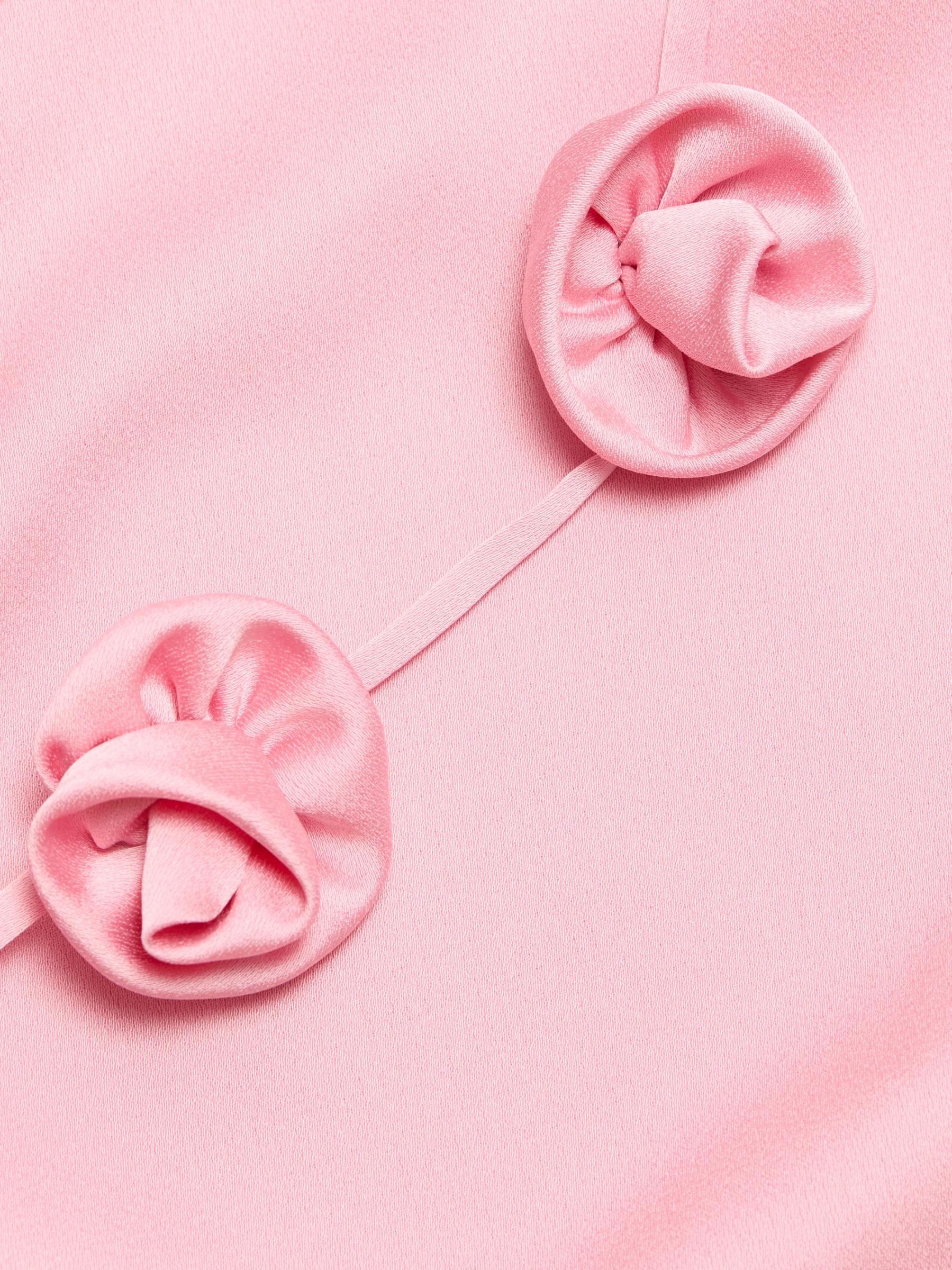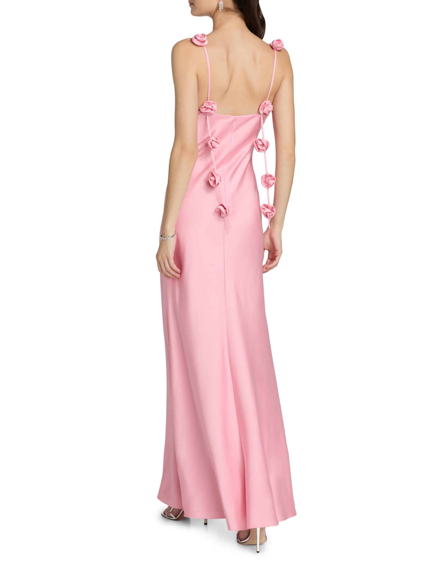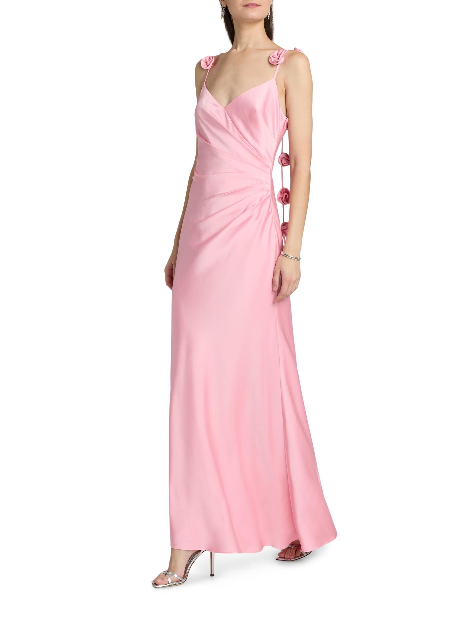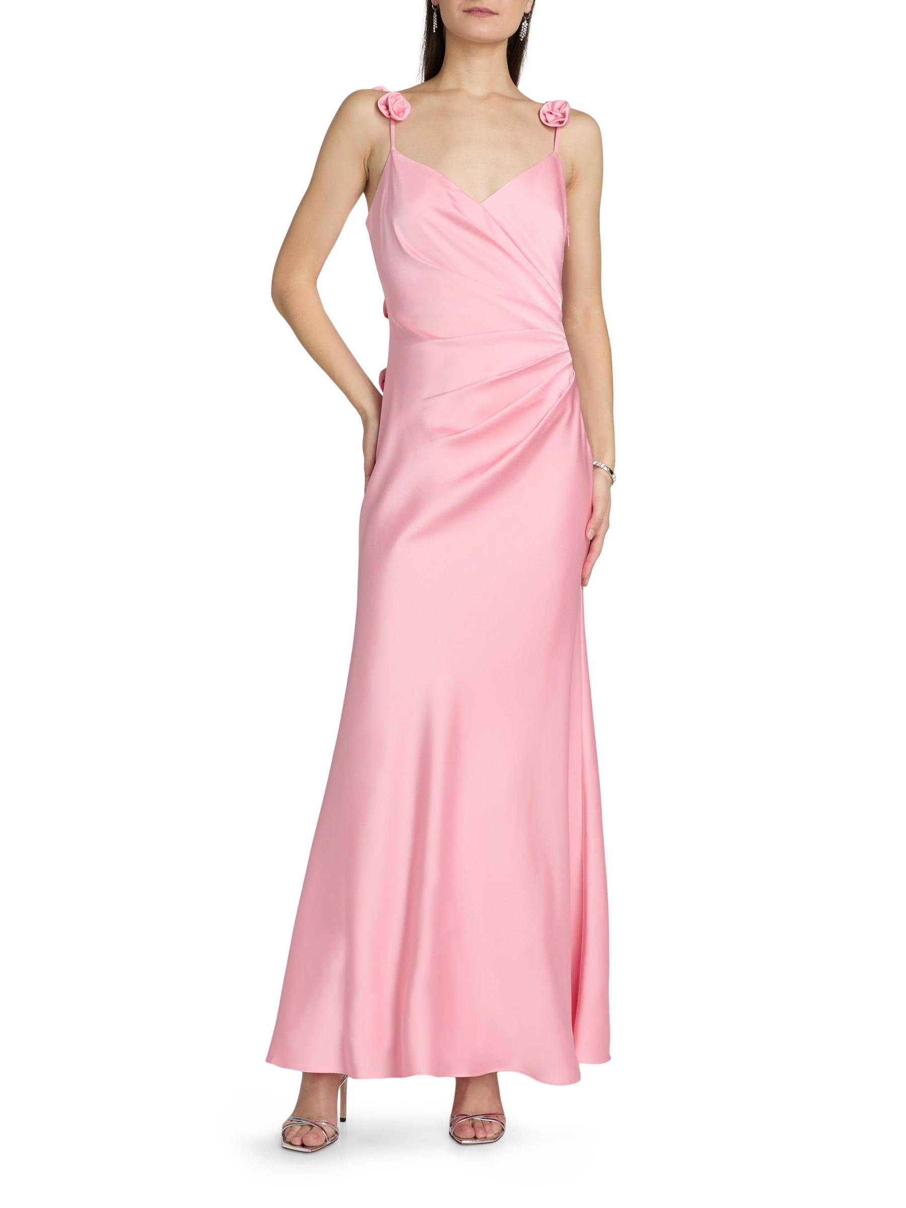 Finished in satin, As It May's draped gown features a V-neck, spaghetti straps adorned with dimensinal rosettes, and a gathered waist.V-neck Spaghetti straps Concealed back zip closure 100% polyester Dry clean Imported