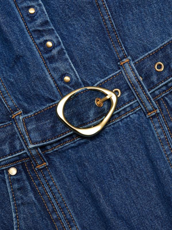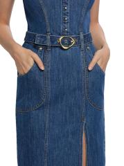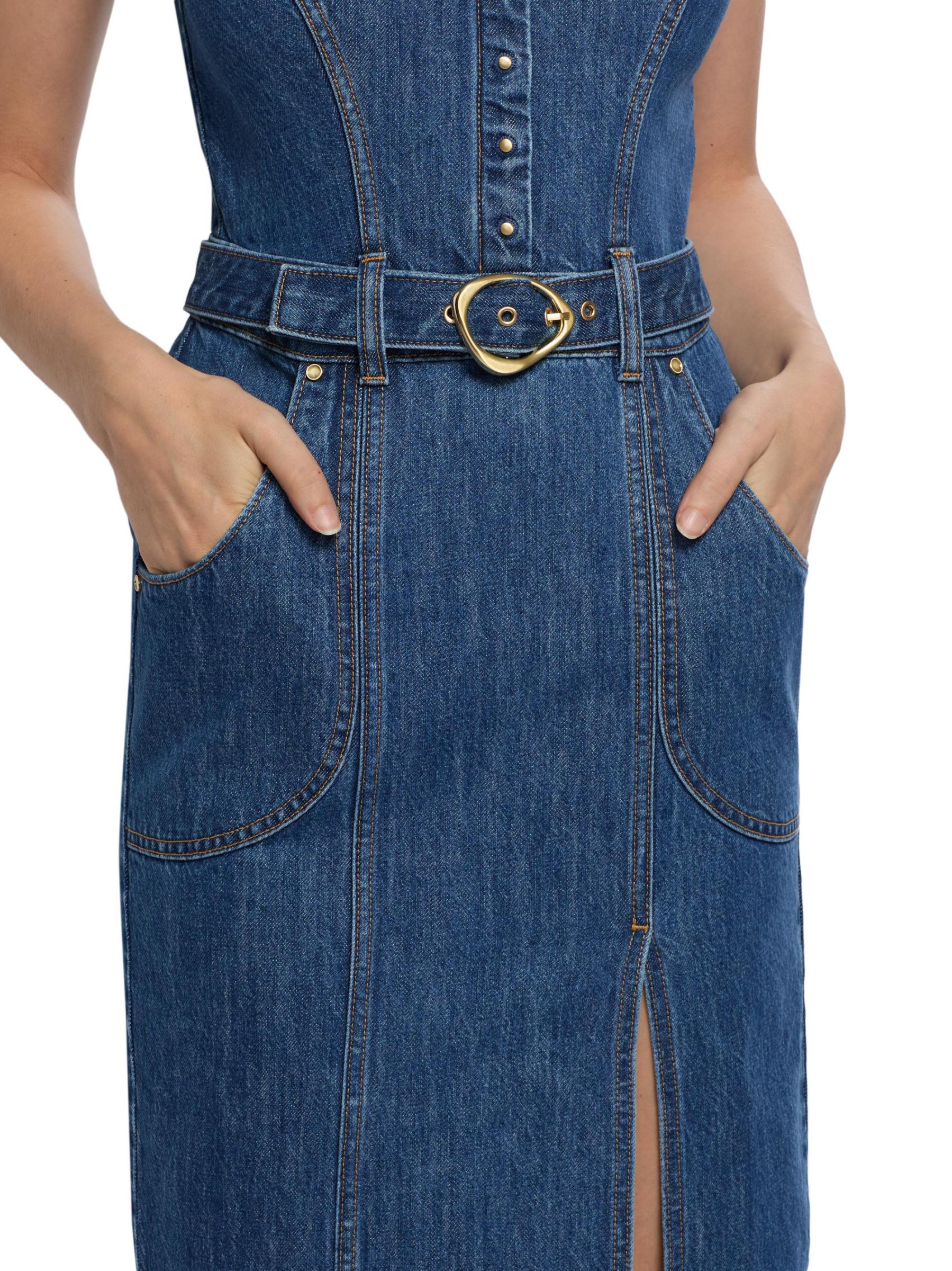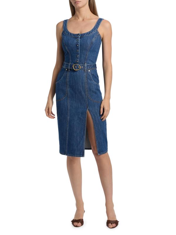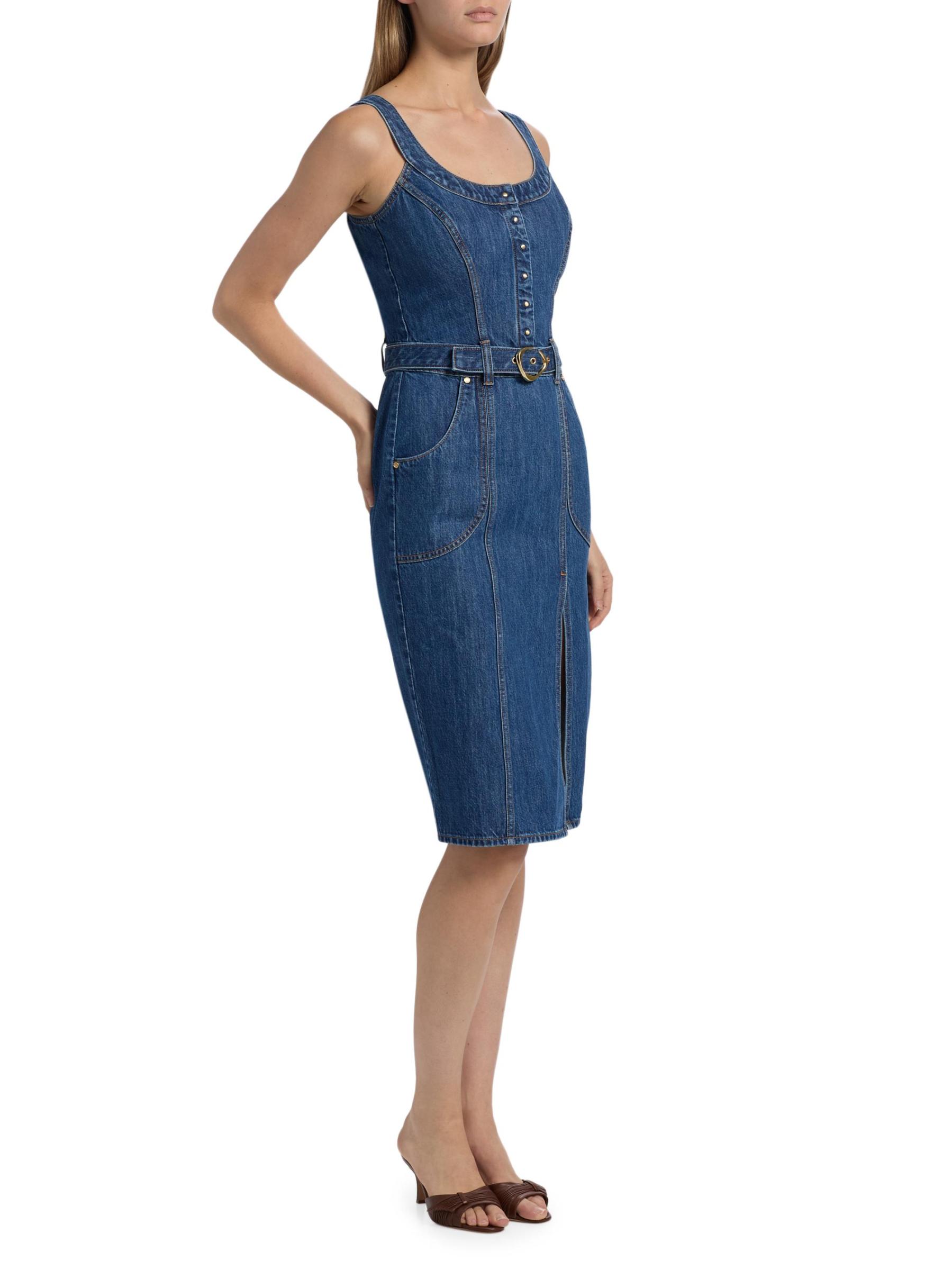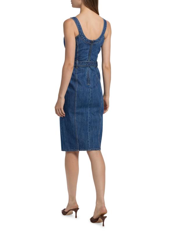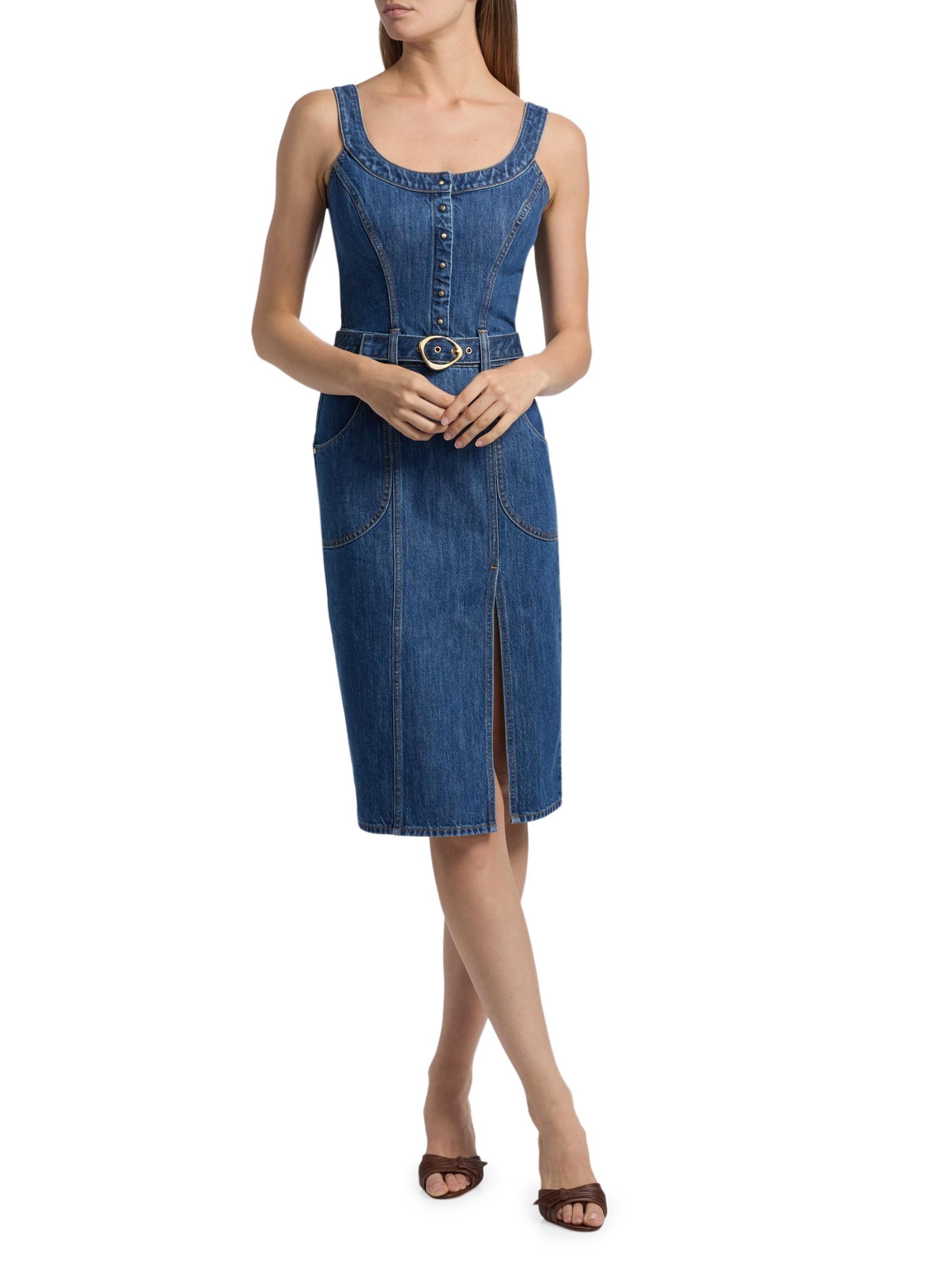 This denim midi-dress from Hevron features a flattering scoop neckline and a belted waist for a cinched silhouette. Polished with front buttons and patch pockets, it’s finished with a back zip for ease.Scoop neck Sleeveless Patch pockets Front button detail Belted waist Back zip closure 100% Cotton Machine wash Imported