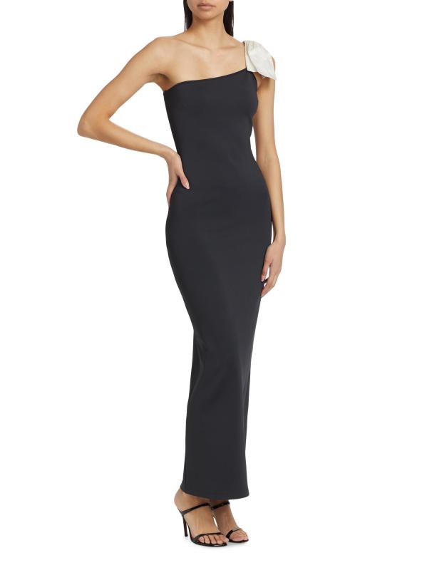 Zeynep Arçay's maxi dress highlights a scuba-knit silhouette. The one-shoulder neckline is finished with a contrast ribbon bow accent.