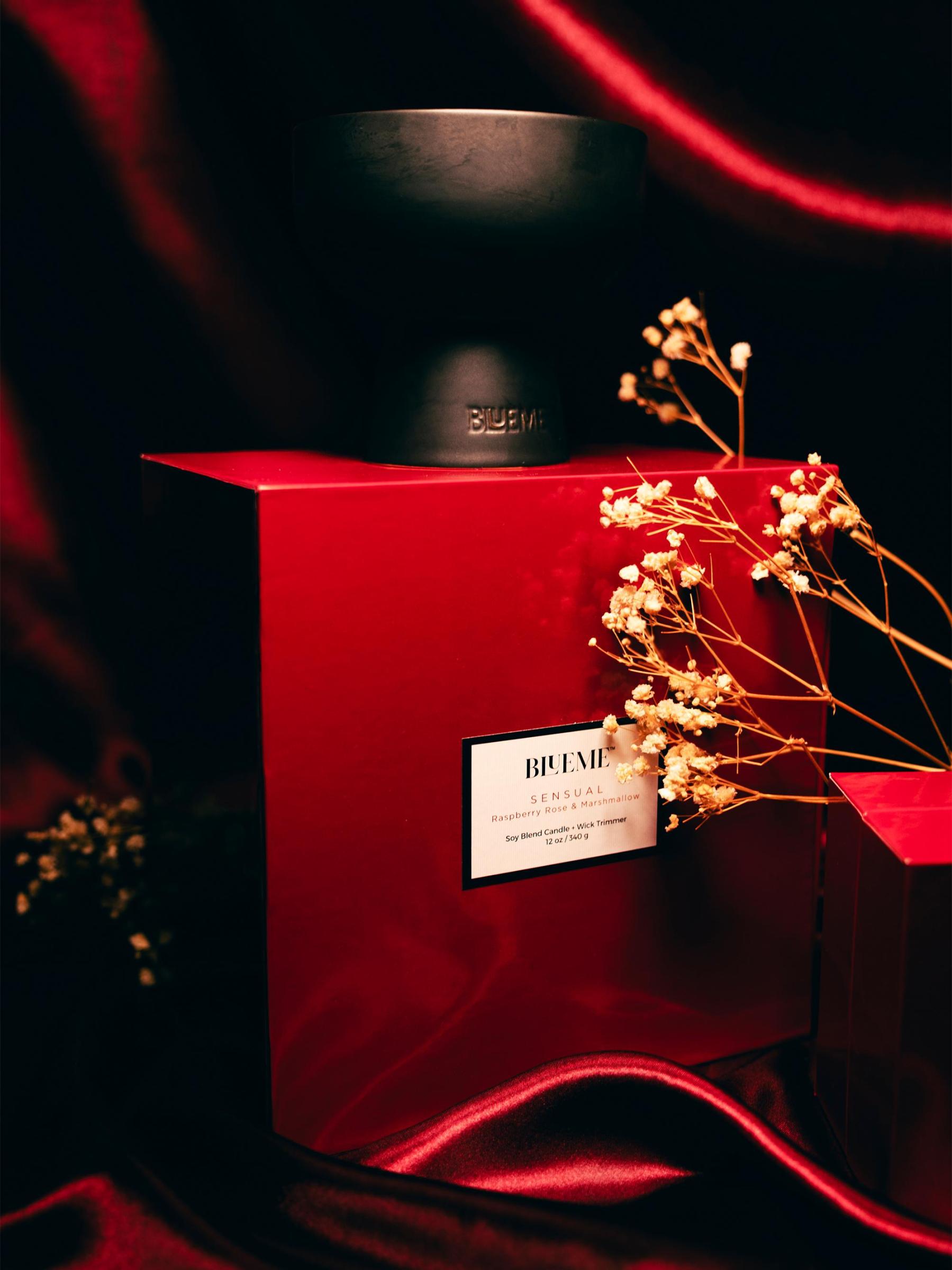 Fall in love with Blueme’s Sensual candle sen—where passion meets elegance in every flicker. Designed in a stunning matte black vessel with a smooth finish and pedestal base, each candle invites a sense of mystery and intimacy. The matching black wick and wax create a bold, alluring ambiance that creates a world of mystery. Perfect for gifting or sharing with a special someone, each candle also includes a sleek, black wick trimmer for the ideal burn. Let the playful notes of raspberry and pink peppercorn of Blueme's Sensual candle create intrigue, while the delicate essence of orange flower and geranium slowly reveals itself. Let the scent lead to the sweet and seductive notes of smoked marshmallow and vanilla, igniting unforgettable moments that linger long after the night ends. Burn time: up to 20 hours. 12 oz. Imported.