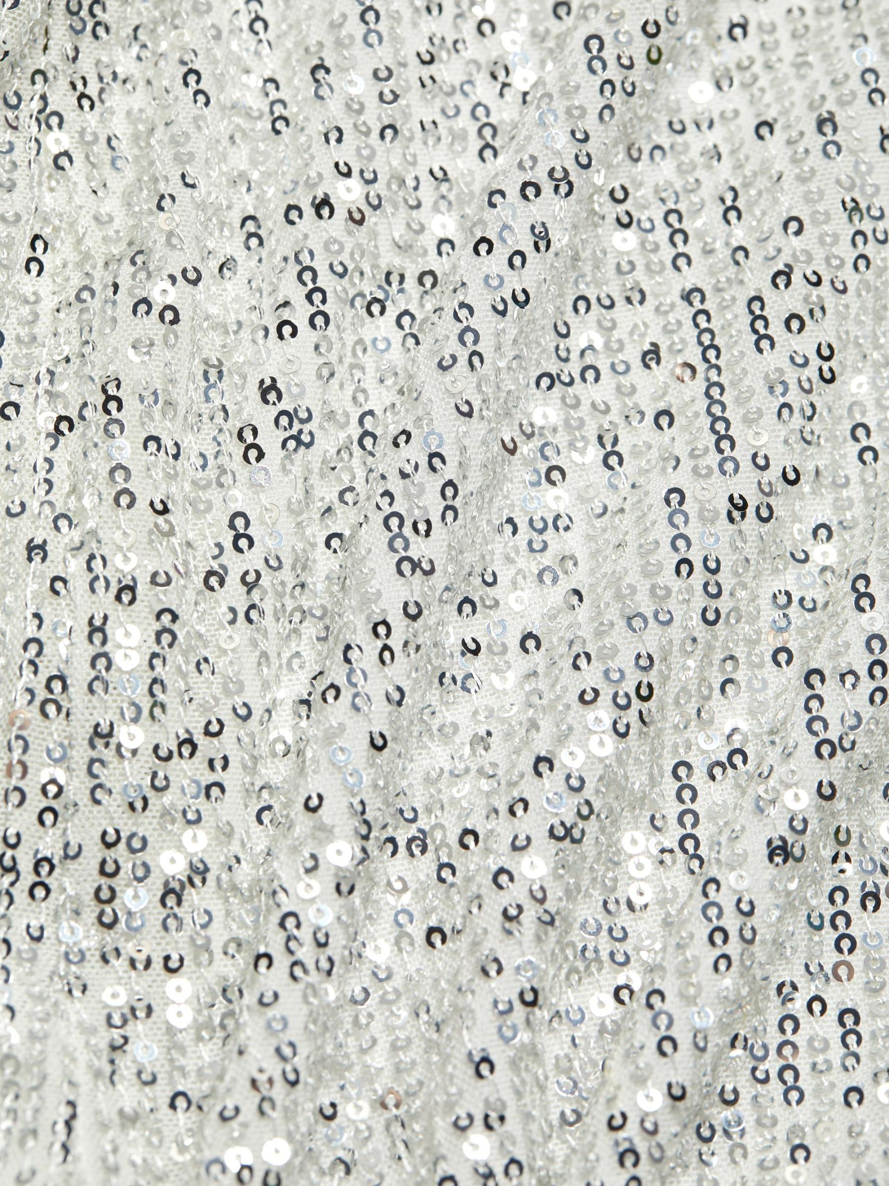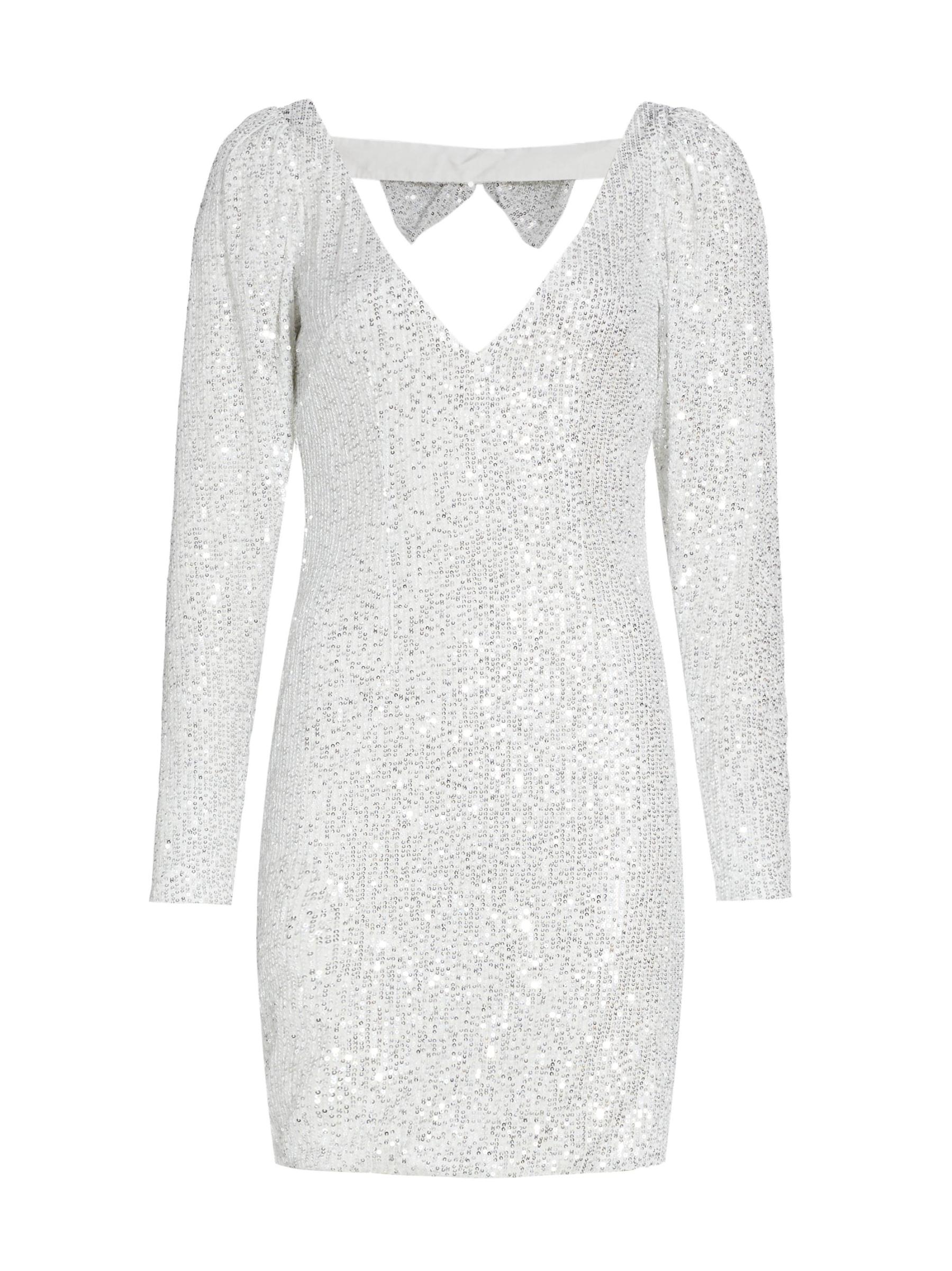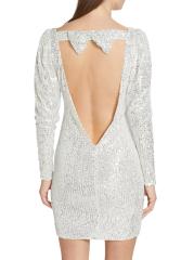 The fitted jersey minidress by CAROLINE CONSTAS is covered in dazzling sequins, featuring a V-neck and plunging low back accented with a playful bow.