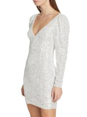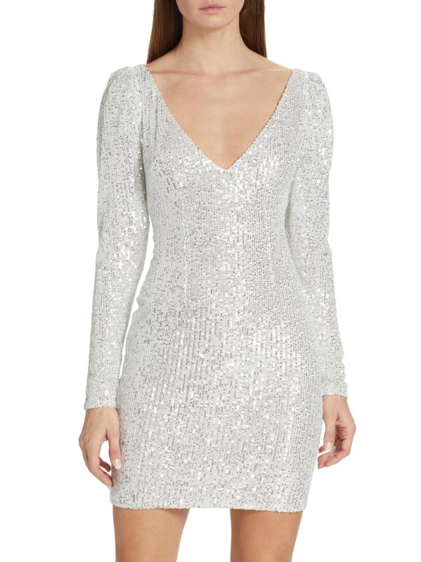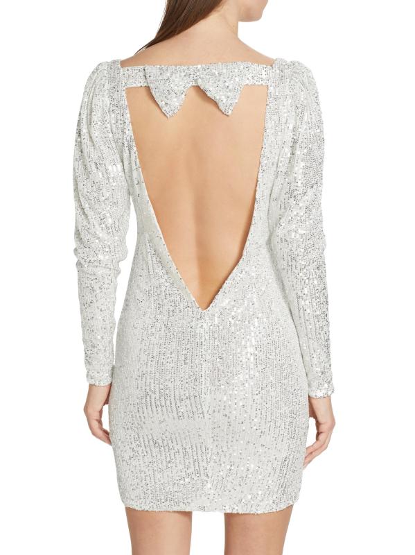 The fitted jersey minidress by CAROLINE CONSTAS is covered in dazzling sequins, featuring a V-neck and plunging low back accented with a playful bow.V-neck Long puff sleeves Side zip closure 95% polyester/5% elastane Dry clean only Imported