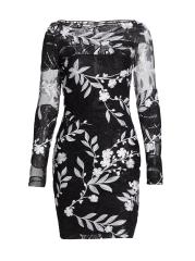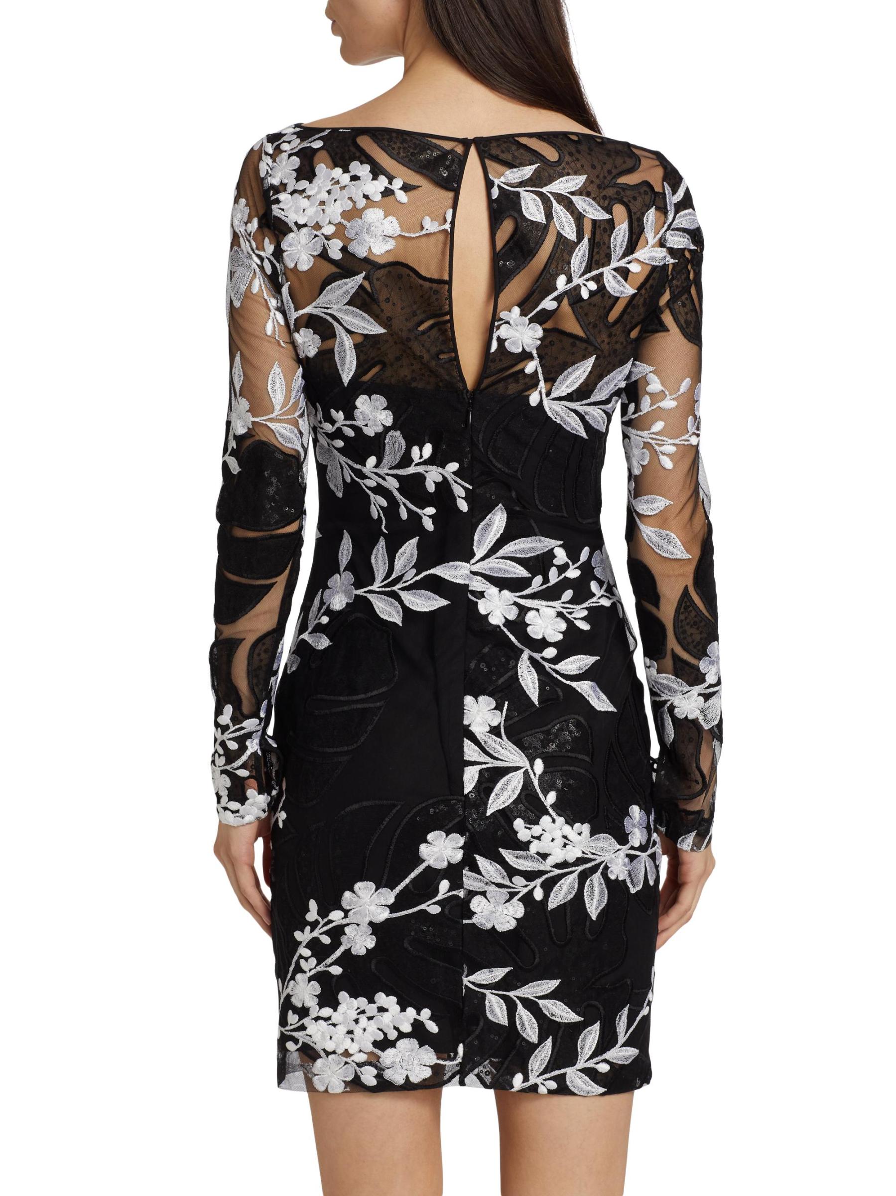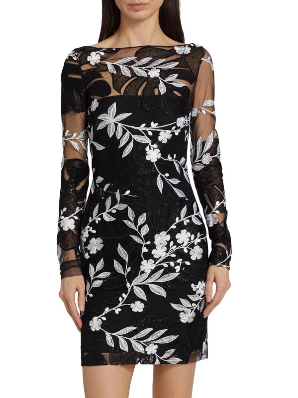EXCLUSIVE. Beading and sequins embellish Naeem Khan’s floral-embroidered cocktail minidress, designed with a fitted long-sleeve silhouette.
