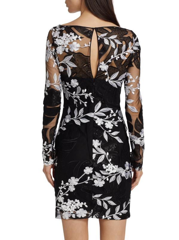 EXCLUSIVE. Beading and sequins embellish Naeem Khan’s floral-embroidered cocktail minidress, designed with a fitted long-sleeve silhouette.Bateau neckline Long sleeves Back button keyhole and concealed zip closure 100% polyester Dry clean Made in USA