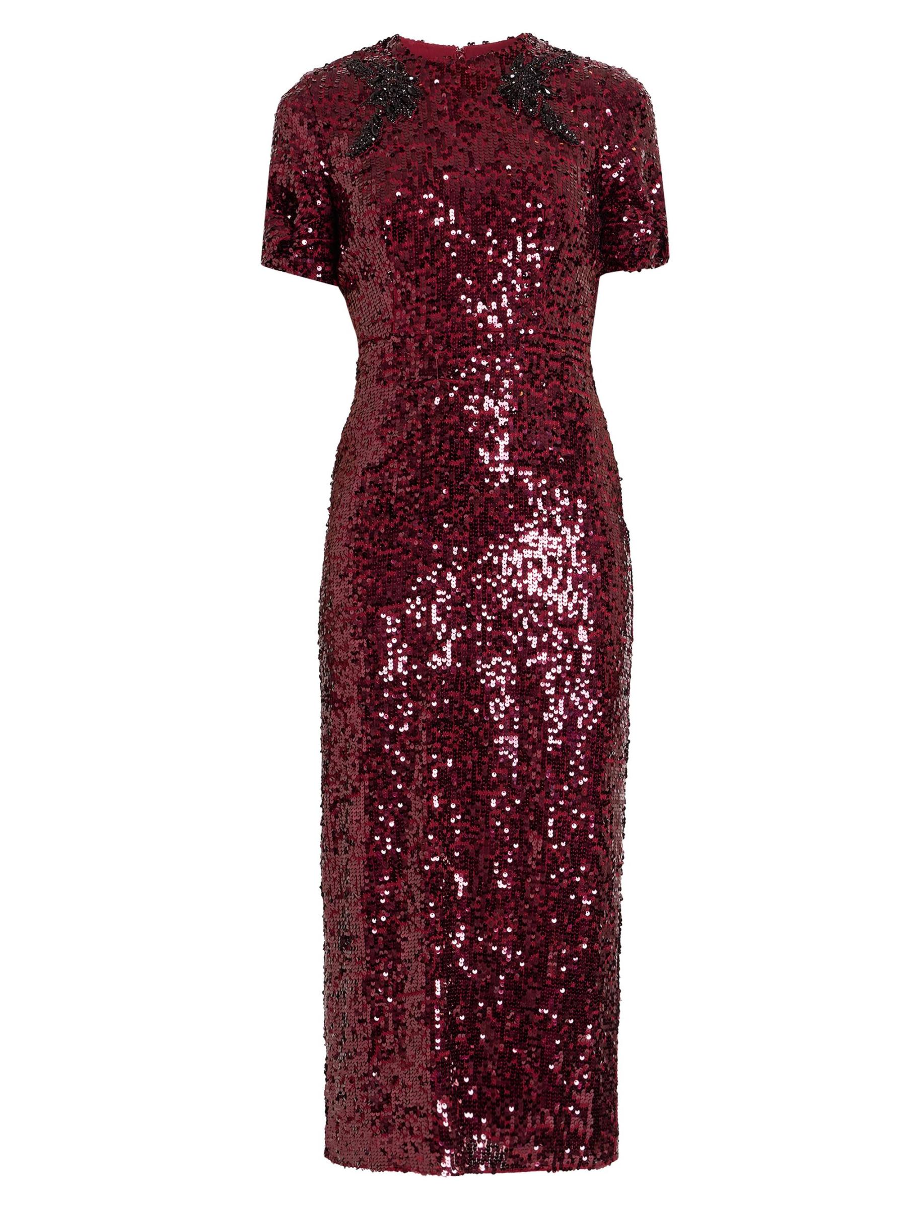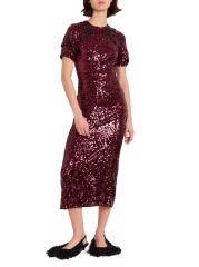 Erdem's fitted short-sleeve cocktail dress enhances the sleek sheath silhouette with shimmering sequins and a mirrored embellished appliqué that frames the crew neckline.