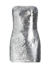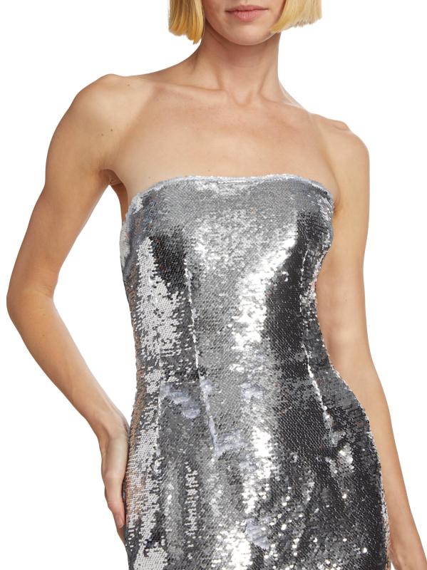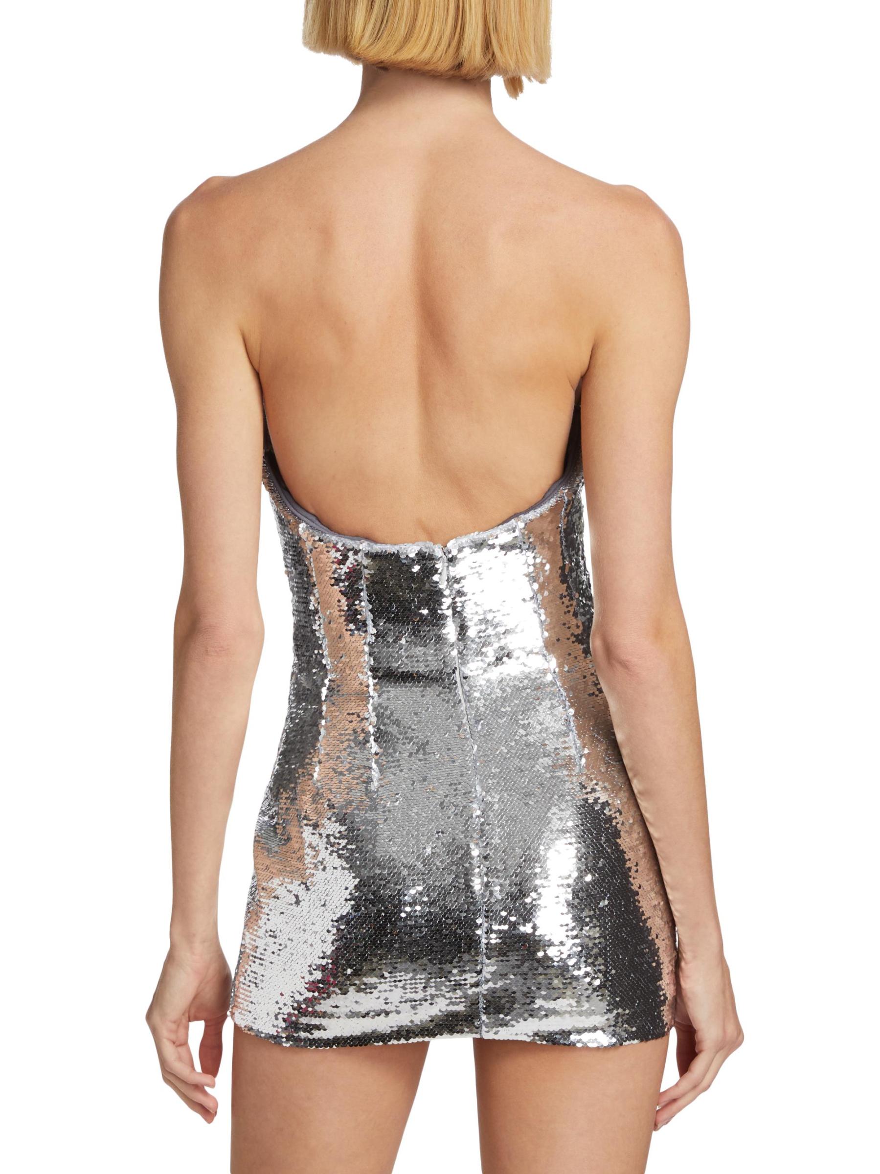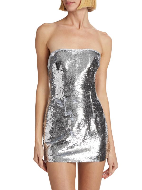 EXCLUSIVE. LaQuan Smith’s minidress features liquid-like sequin embellishing and a strapless, bodycon silhouette.